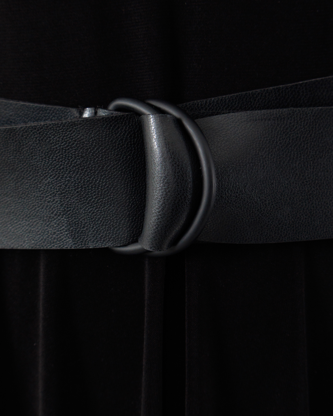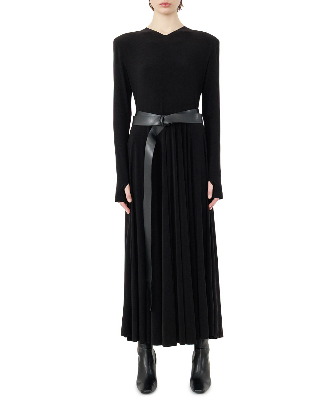 Это чёрное платье-лонгслив с плиссированной юбкой — воплощение элегантности и сдержанной роскоши. Модель идеально балансирует между классикой и современными тенденциями, становясь ключевым элементом гардероба для создания выразительных образов. Глубокий чёрный цвет придаёт изделию универсальность: оно одинаково уместно как в деловом, так и в вечернем контексте. Облегающий лиф подчёркивает линии фигуры, создавая изящный контраст с расклёшенной юбкой в складку. Такой крой визуально вытягивает силуэт, добавляя образу грации и утончённости. Особенность модели — гармоничное сочетание лаконичных линий и динамичной текстуры плиссировки. Длинные рукава и V-образный вырез горловины формируют сбалансированный силуэт, который выглядит одновременно строго и женственно. Кожаный пояс акцентирует талию, добавляя современный акцент и структурируя образ. Платье выполнено из качественного трикотажа, который приятно облегает фигуру, не сковывая движений. Материал отлично держит форму, сохраняя безупречный внешний вид в течение всего дня. С этим платьем легко создавать многослойные образы: сочетайте его с лаконичными жакетами для делового стиля или с объёмными кардиганами для более расслабленного настроения. Элегантные лодочки и минималистичные украшения станут идеальным дополнением, подчёркивая изысканность наряда. Это платье — не просто вещь, а инструмент для воплощения индивидуального стиля с безупречным вкусом.