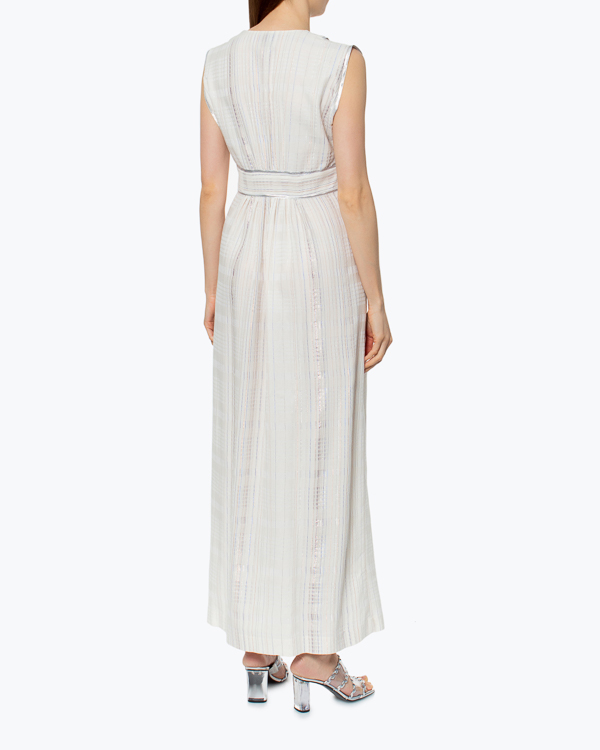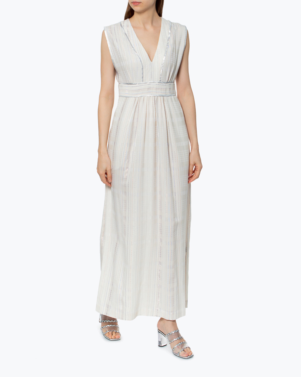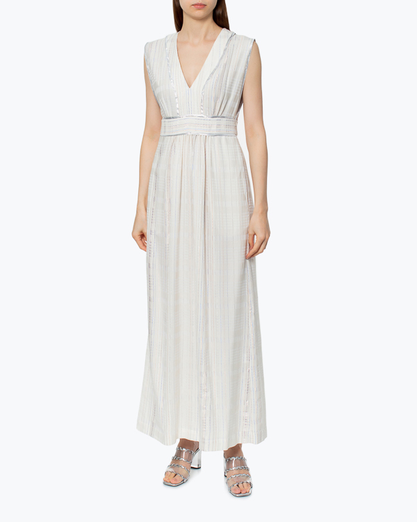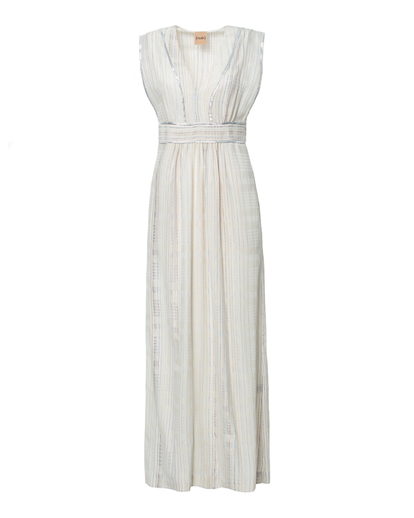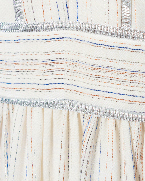 Платье-маски из смеси тонкой вискозы и натурального хлопка молочного оттенка с цветными полосами. Модель с V-образным вырезом и отрезной под линией груди.