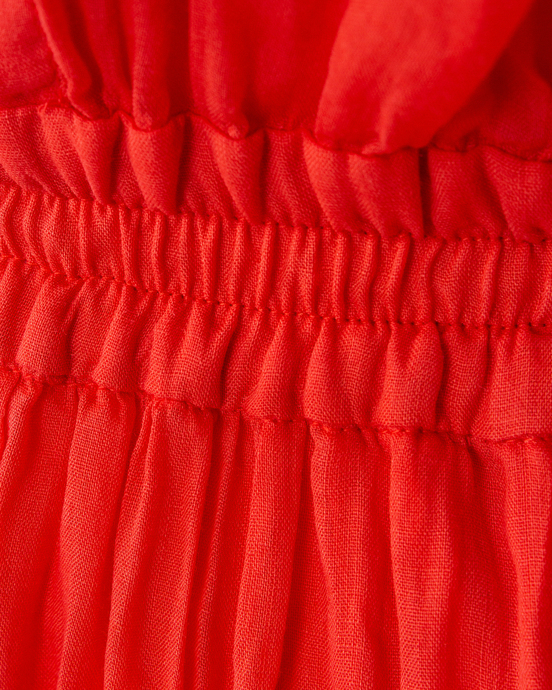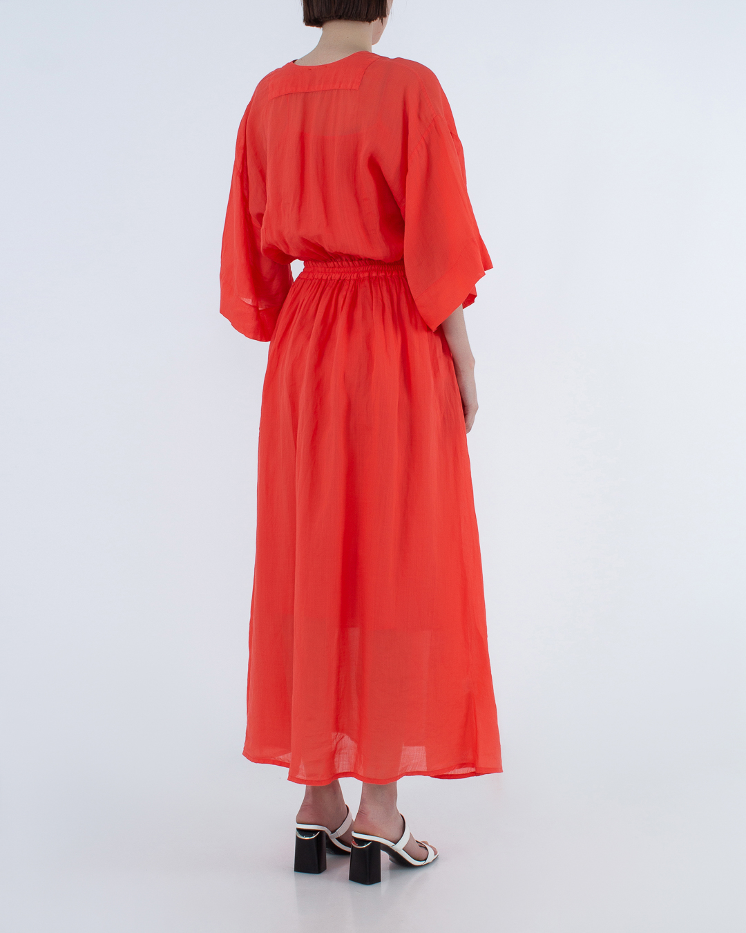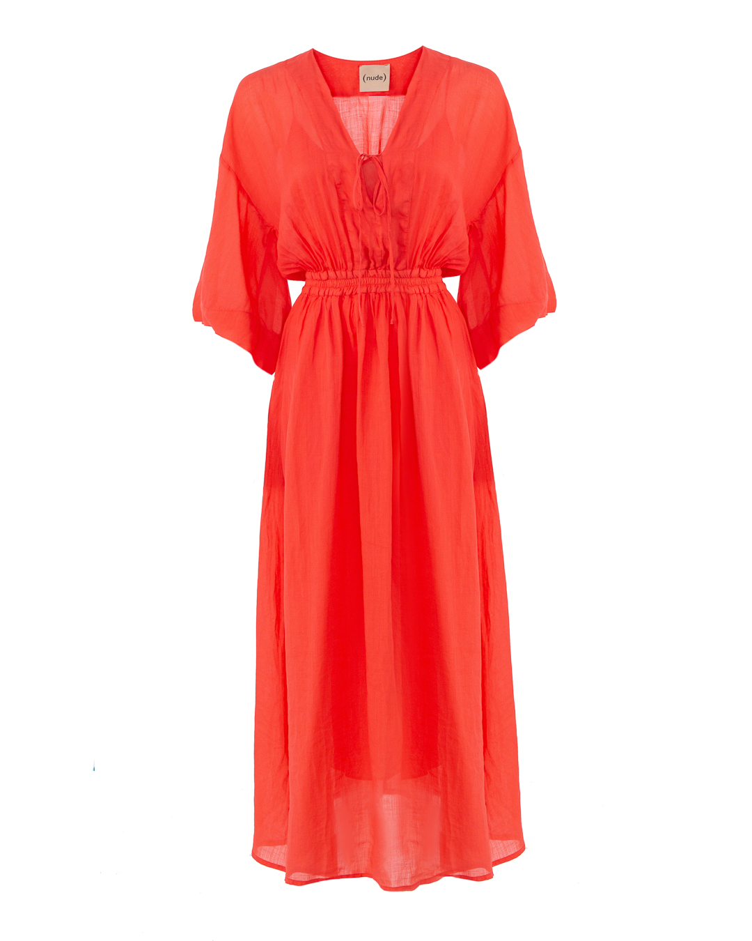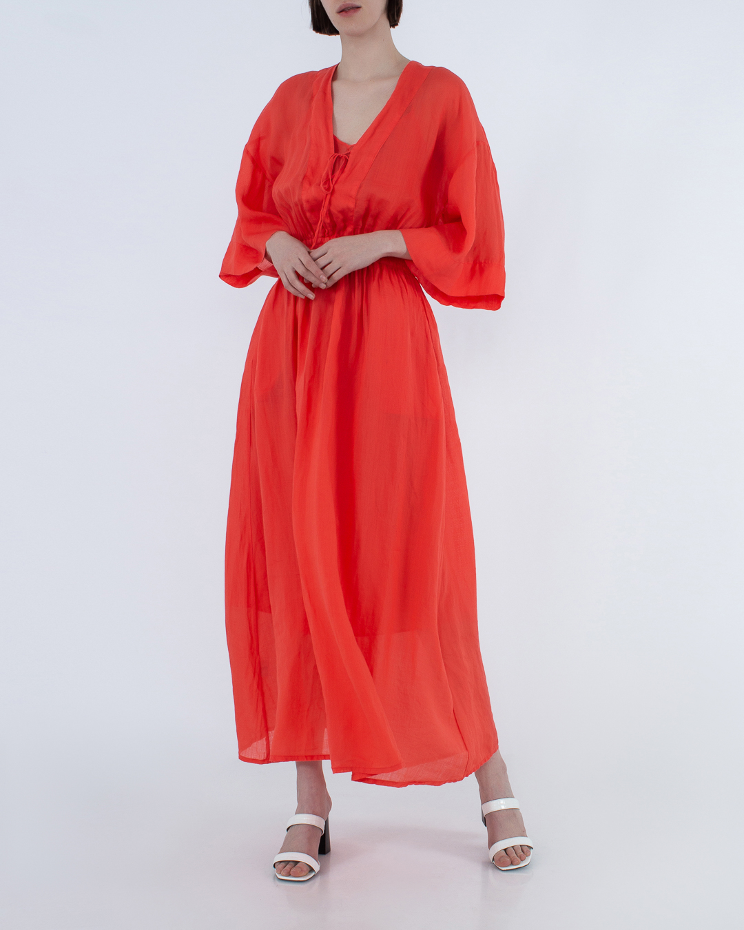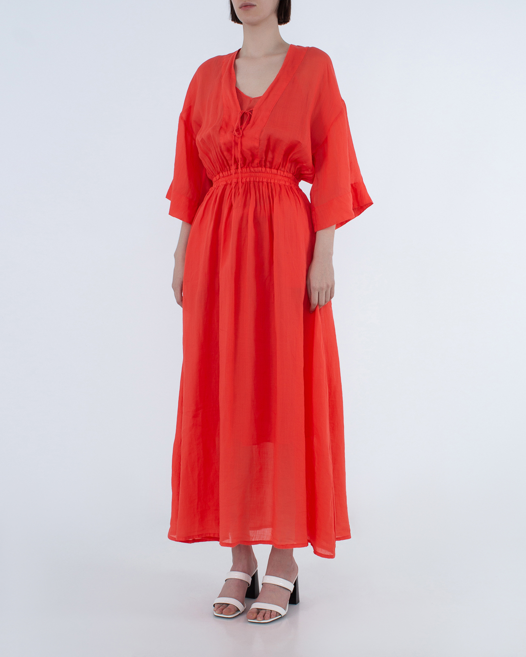 Платье изо льна кораллового оттенка. Модель приталенного силуэта с эластичной линией пояса дополнено завязками и широкими рукавами со спущенной линией плеч.