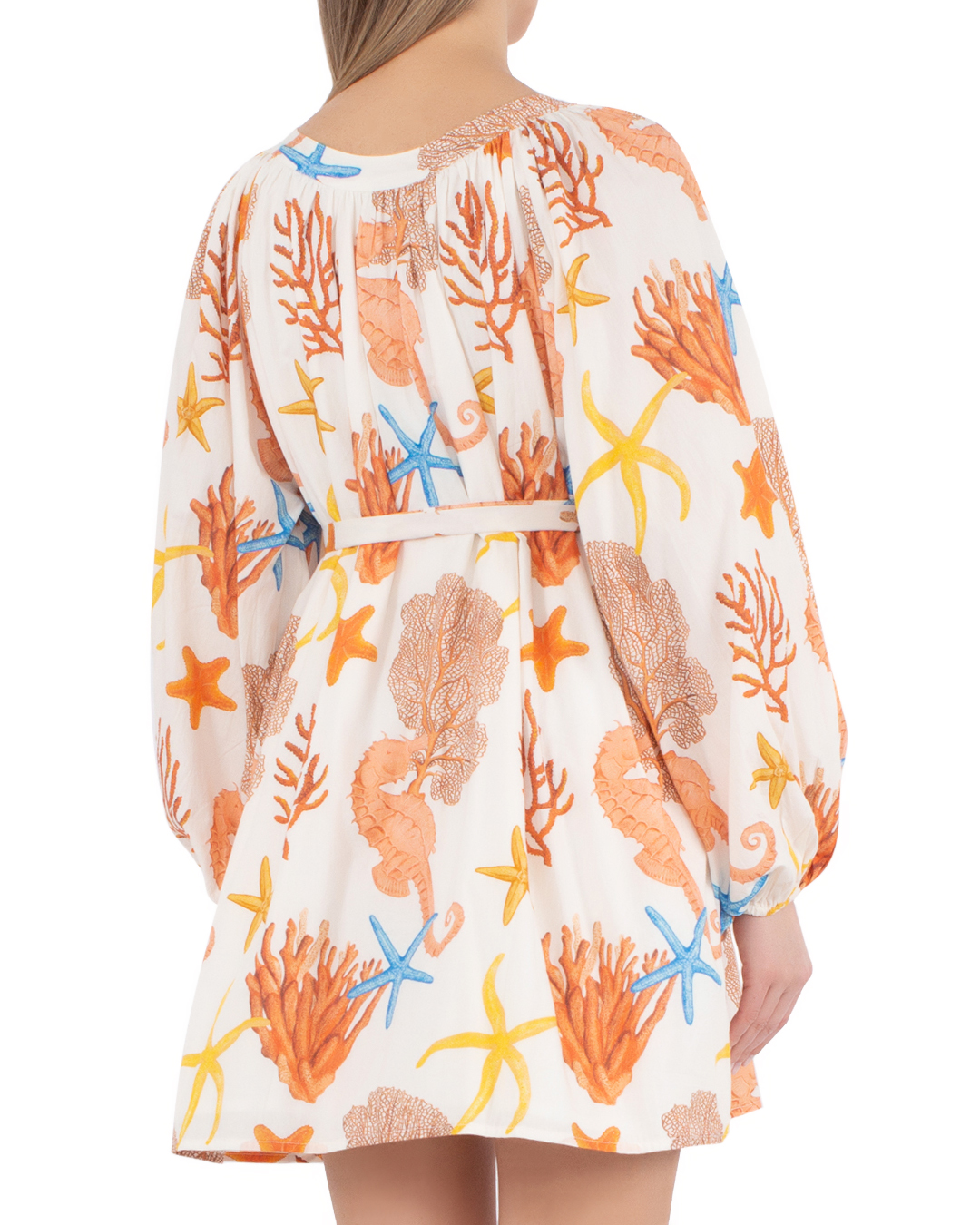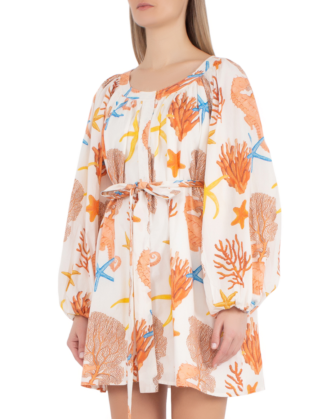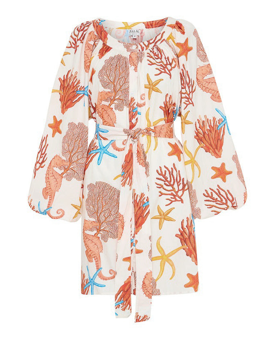 Платье Palm Noosa сшито из натурального льна с принтом. Модель длины мини дополнено длинными рукавами и поясом.