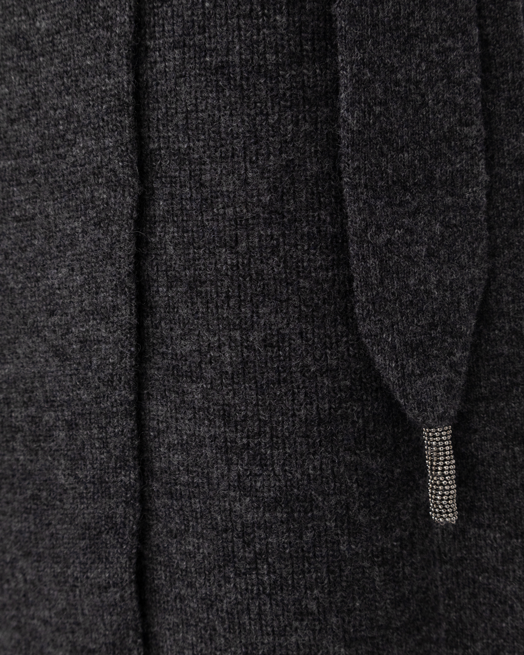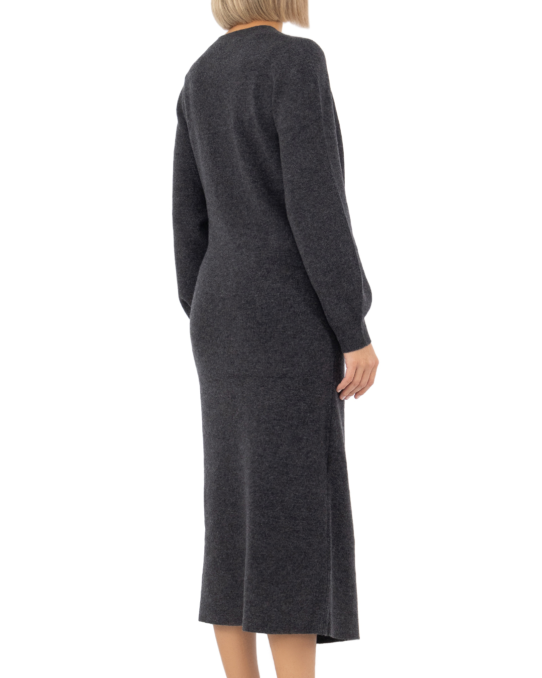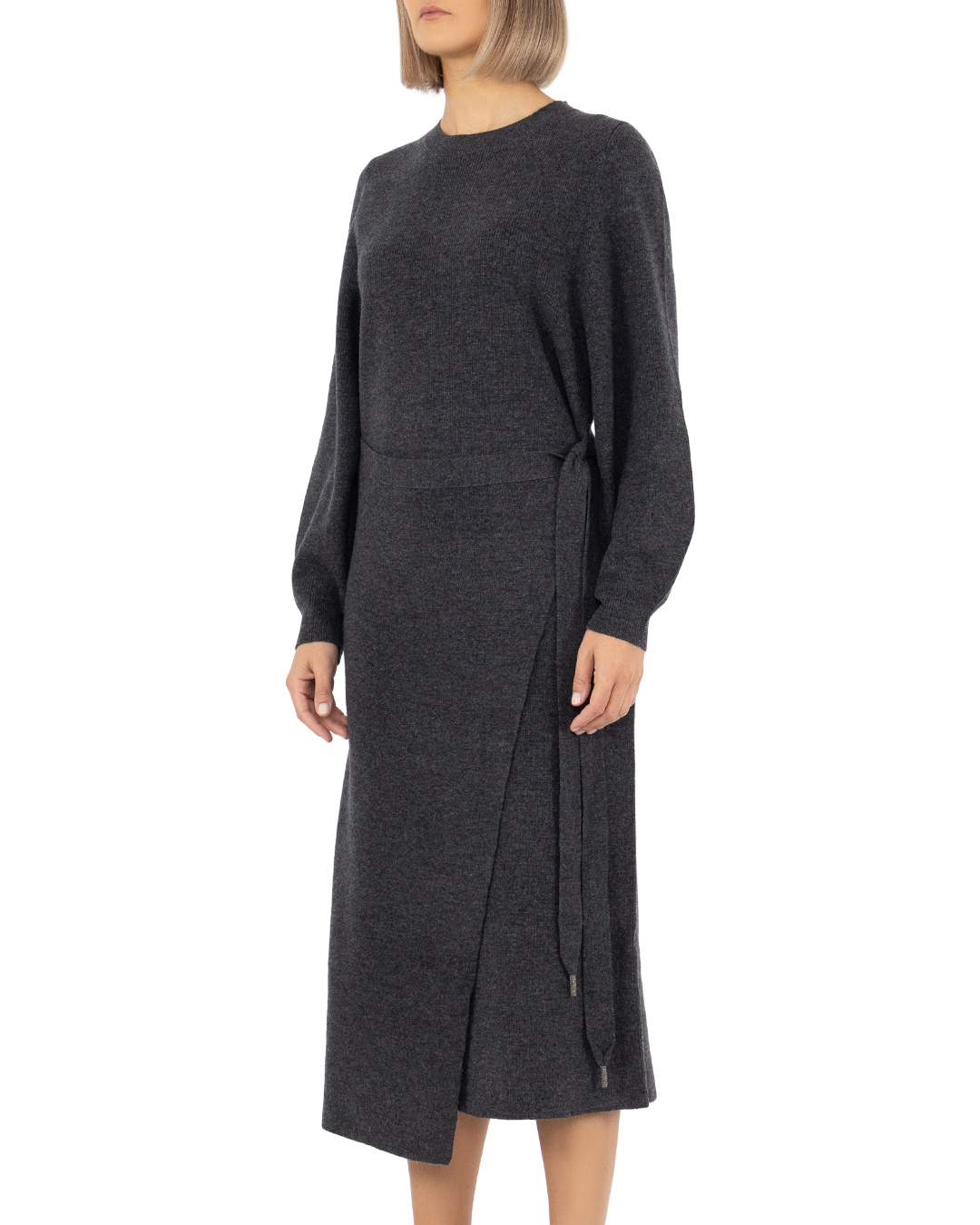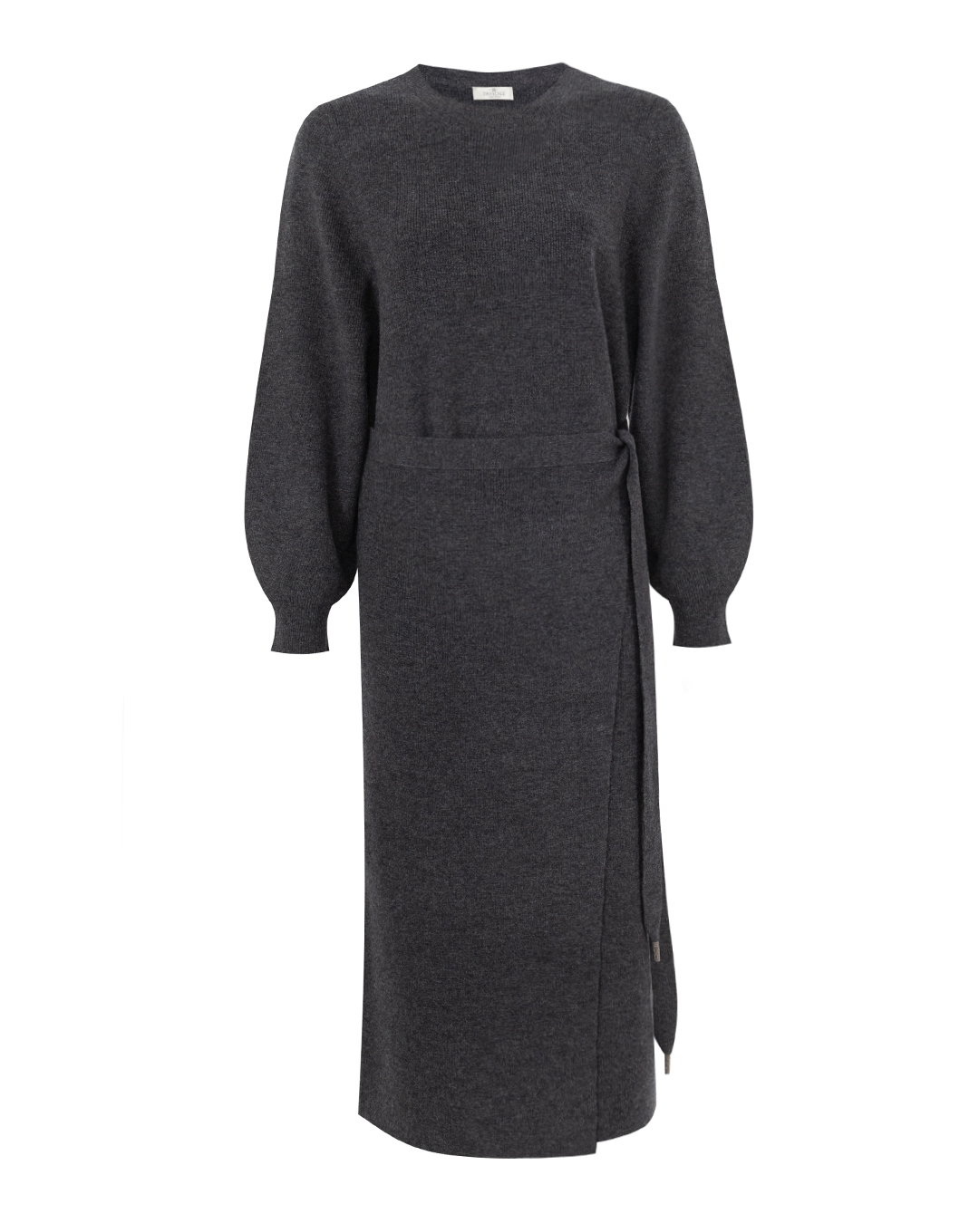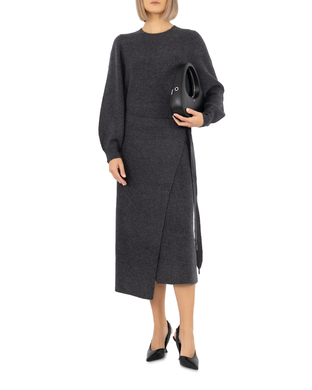 Платье-миди из смесовой шерсти и кашемира. Модель свободного силуэта с длинными объемными рукавами и рельефными манжетами. Круглый вырез горловины, юбка с запахом и поясом, который подчеркивает талию и структурирует силуэт.