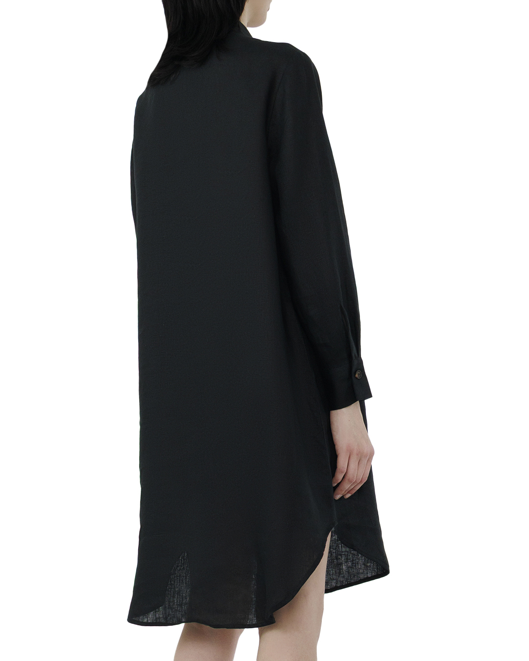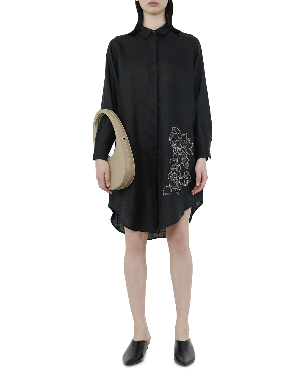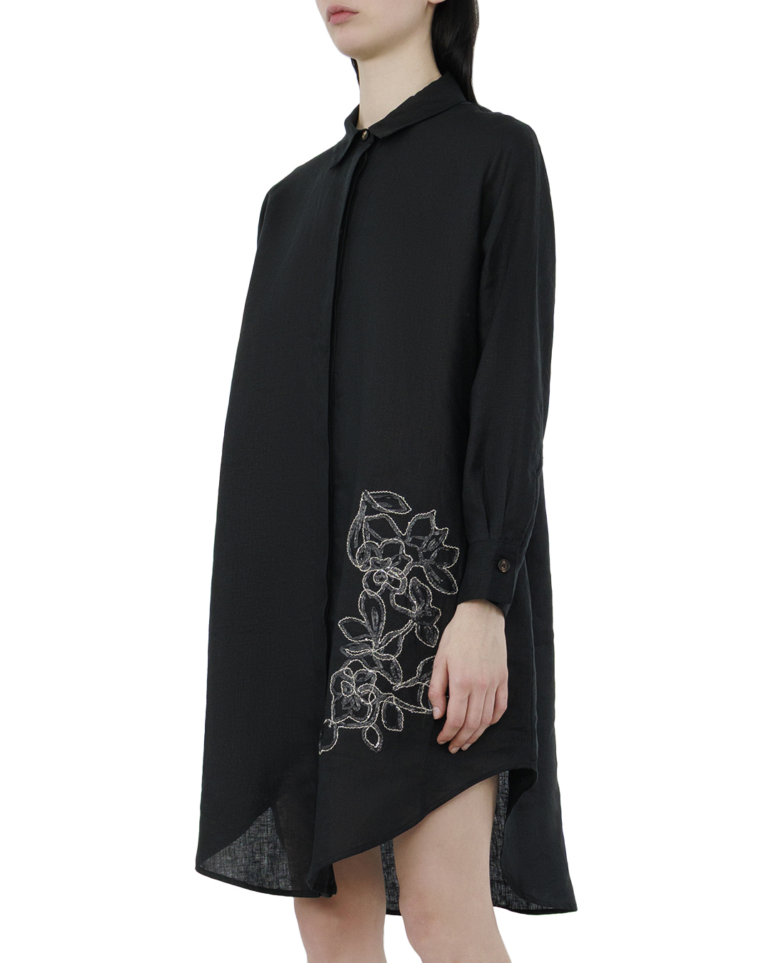 Это платье — воплощение утончённой элегантности и непревзойдённого стиля, выполненное в глубоком чёрном оттенке, который добавляет ему изысканности и универсальности. Свободный силуэт создаёт ощущение лёгкости и непринуждённости, одновременно подчеркивая грациозность женской фигуры. Классический отложной воротник и скрытая планка застёжки придают платью современные минималистичные детали, добавляя нотку формальности и сдержанности. Длинные рукава с манжетами, застёгнутыми на аккуратные пуговицы, добавляют образу деликатной строгости. Ассиметричный подол открывает новые грани дизайна, создавая динамичный и оригинальный силуэт, который привлекает внимание и подчёркивает уникальность изделия. Особое очарование придаёт цветочная вышивка, декорирующая боковую часть платья. Этот изысканный элемент выделяет модель и вносит в неё романтический оттенок, создавая тонкую игру текстур и добавляя глубину. Это платье станет идеальным выбором как для вечерних мероприятий, так и для стильных повседневных выходов, делая любую женщину предметом восхищения и источником вдохновения.