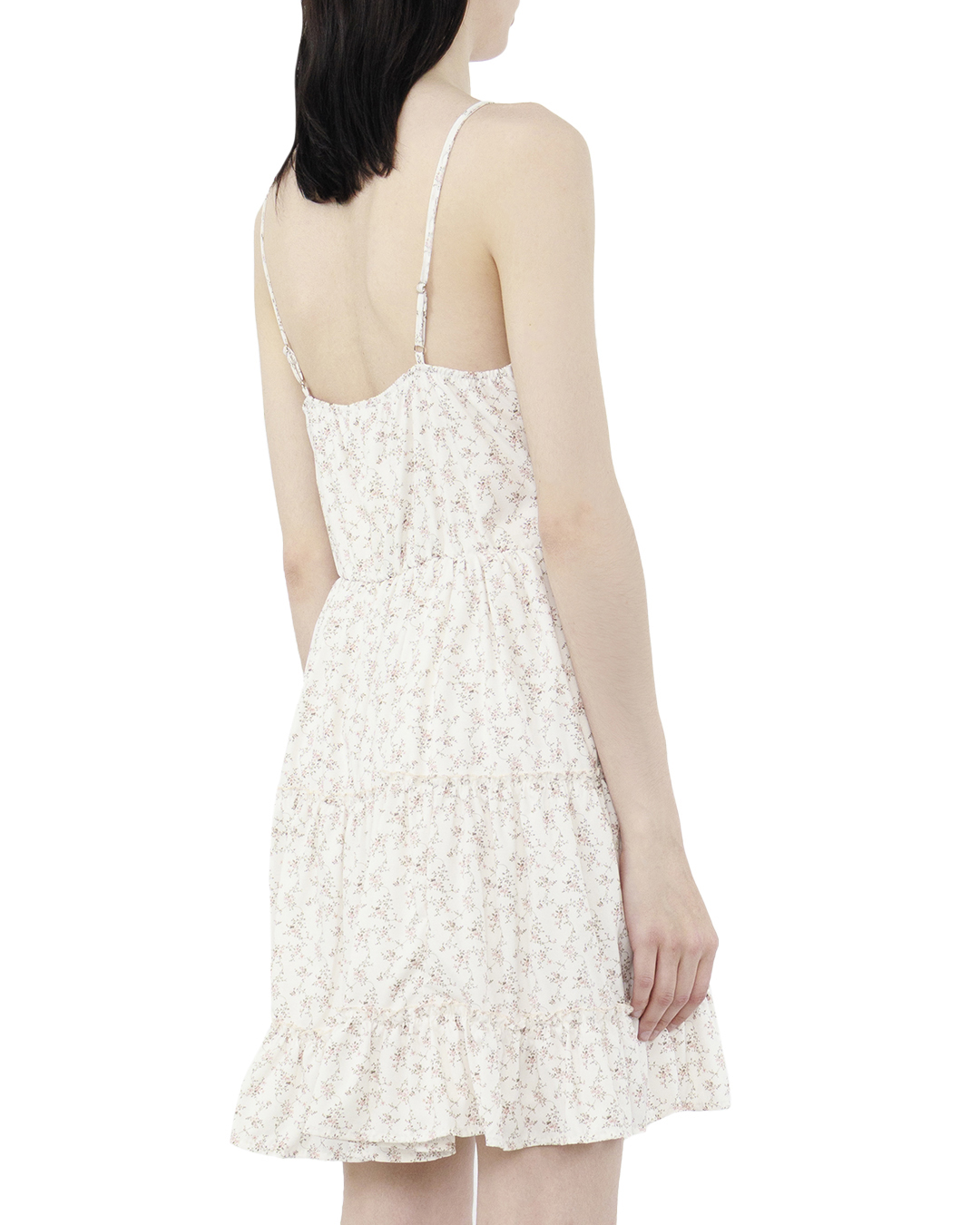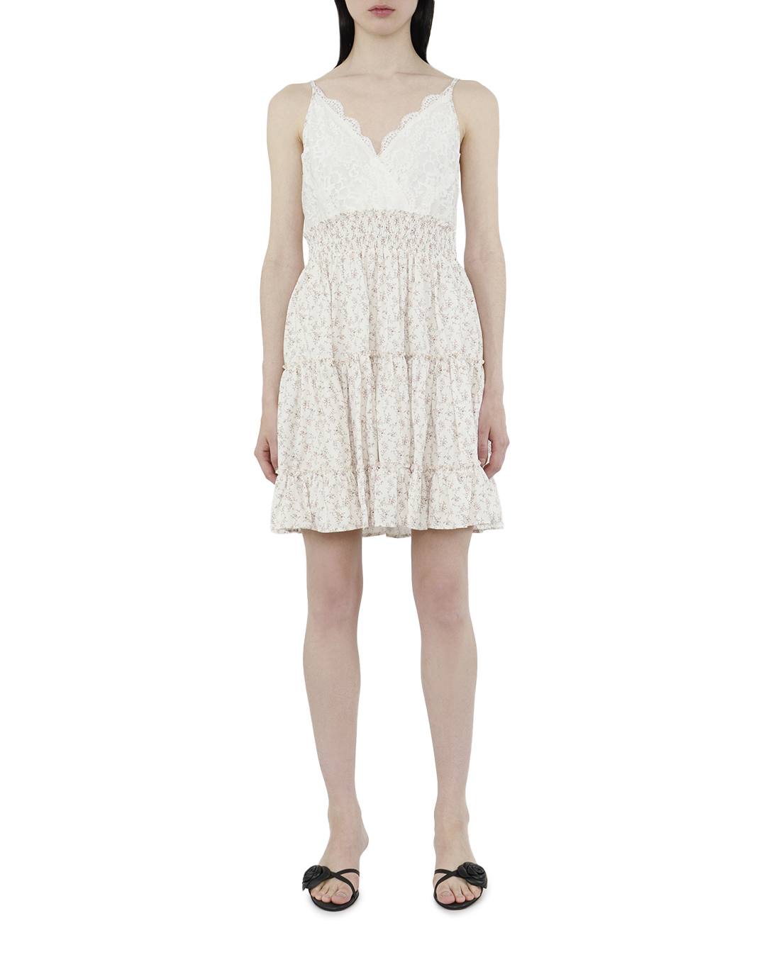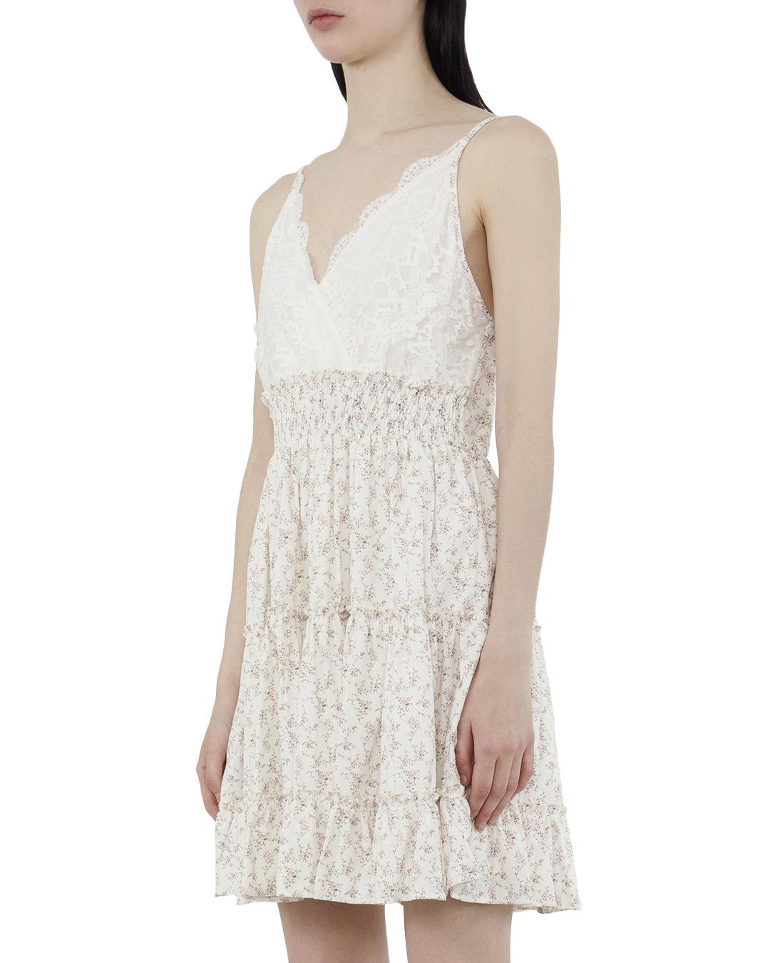 Это платье излучает романтичную женственность и свежесть, идеально вписываясь в атмосферу летних дней. Тонкие бретели и лиф из нежного кружева придают образу изысканность и утонченность. Кружевной V-образный вырез добавляет чувственной нотки, привнося элементы лёгкости и воздушности. Талия акцентирована сборкой на резинке, создающей грациозный силуэт и обеспечивающей комфорт. Юбка выполнена в ярусном стиле, придавая динамику и игривость движению, что создаёт эффект лёгкости и праздности. Мелкий цветочный принт на юбке добавляет свежести и легкости, подчёркивая естественную красоту. Гармоничные расцветки и лёгкий материал придают платью непринужденный и уютный вид. Это платье станет идеальным выбором для расслабленных прогулок или романтических встреч, легко сочетаясь как с сандалиями, так и с лёгкими аксессуарами. Оно позволяет создавать нежный и элегантный образ, подчеркивая природную привлекательность и свободолюбие.