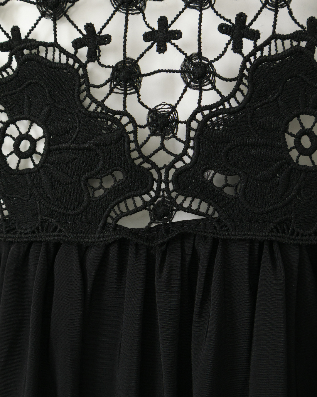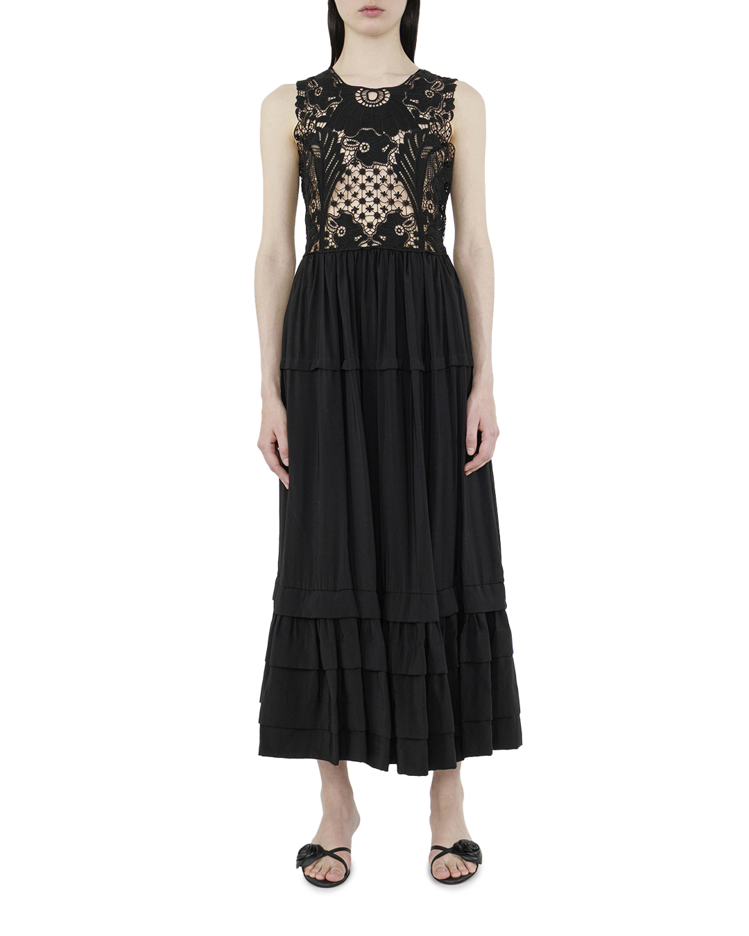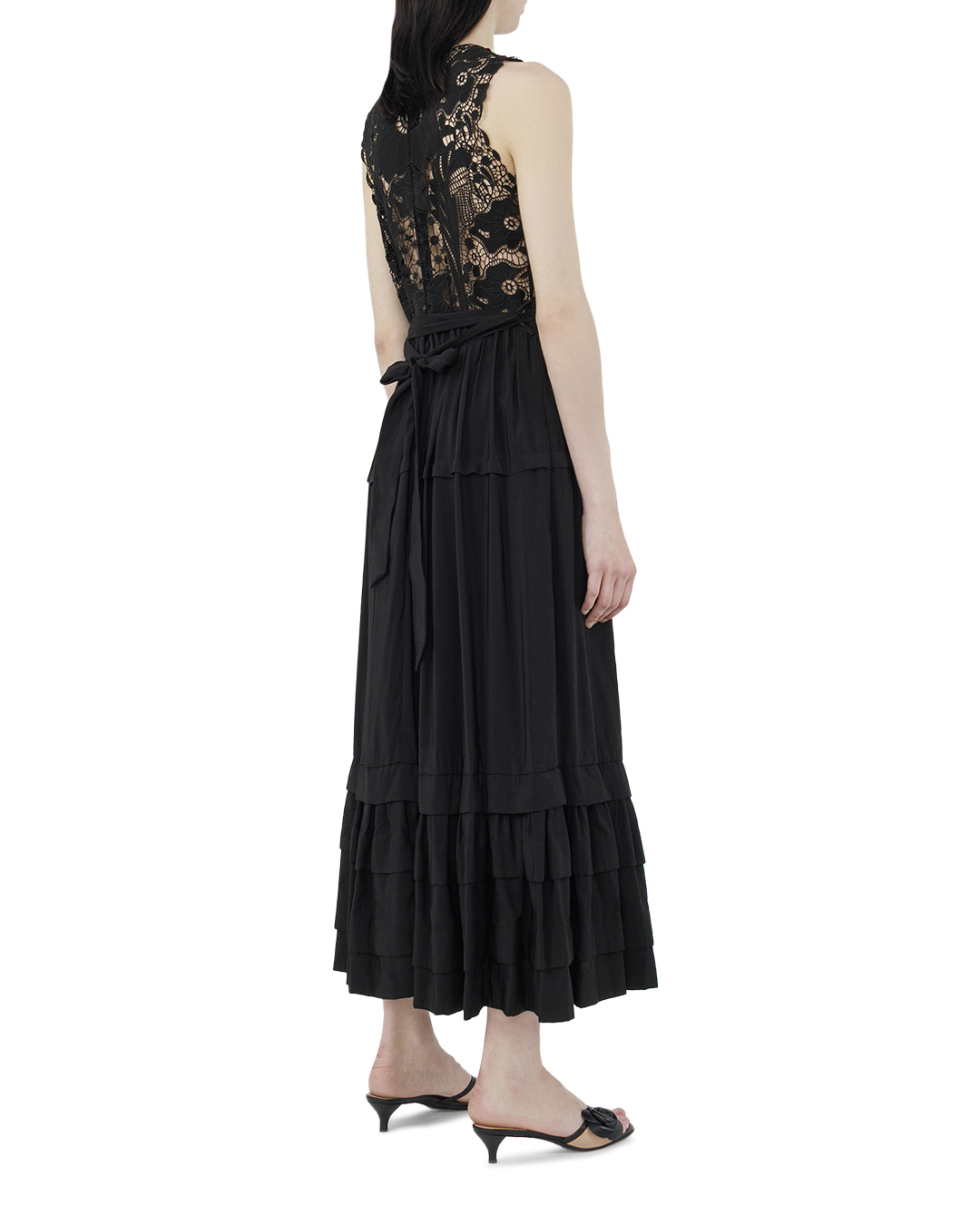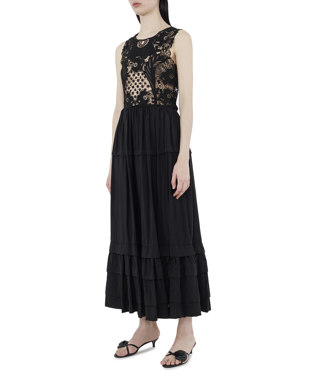 Это платье воплощает в себе драматическую элегантность и изысканность, идеально подходя для вечернего выхода. Верхняя часть выполнена из утонченного черного кружева с замысловатыми узорами, которые создают интригующую игру света и тени на коже. Геометрические и цветочные элементы в отделке придают образу глубину и текстуру, добавляя загадочный штрих. Круглый вырез горловины и безрукавный дизайн подчеркивают линию плеч, создавая изысканный и утонченный силуэт. Высокая талия визуально удлиняет фигуру, плавно переходя в многоярусную юбку. Юбка струится вниз, образуя эффект каскада с мягкими оборками, которые добавляют динамику и создают ощущение воздушности. Струящийся материал юбки мягко движется с каждым шагом, создавая впечатление легкости и изысканности. Эта модель идеально сочетается с минималистичными аксессуарами, что позволяет полностью раскрыть её загадочную красоту. Она создаст незабываемый образ на любом мероприятии, подчёркивая вашу индивидуальность и безупречный вкус.