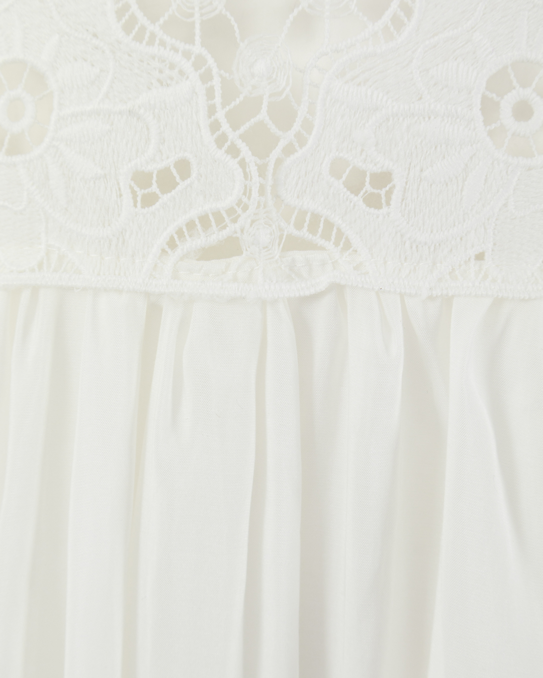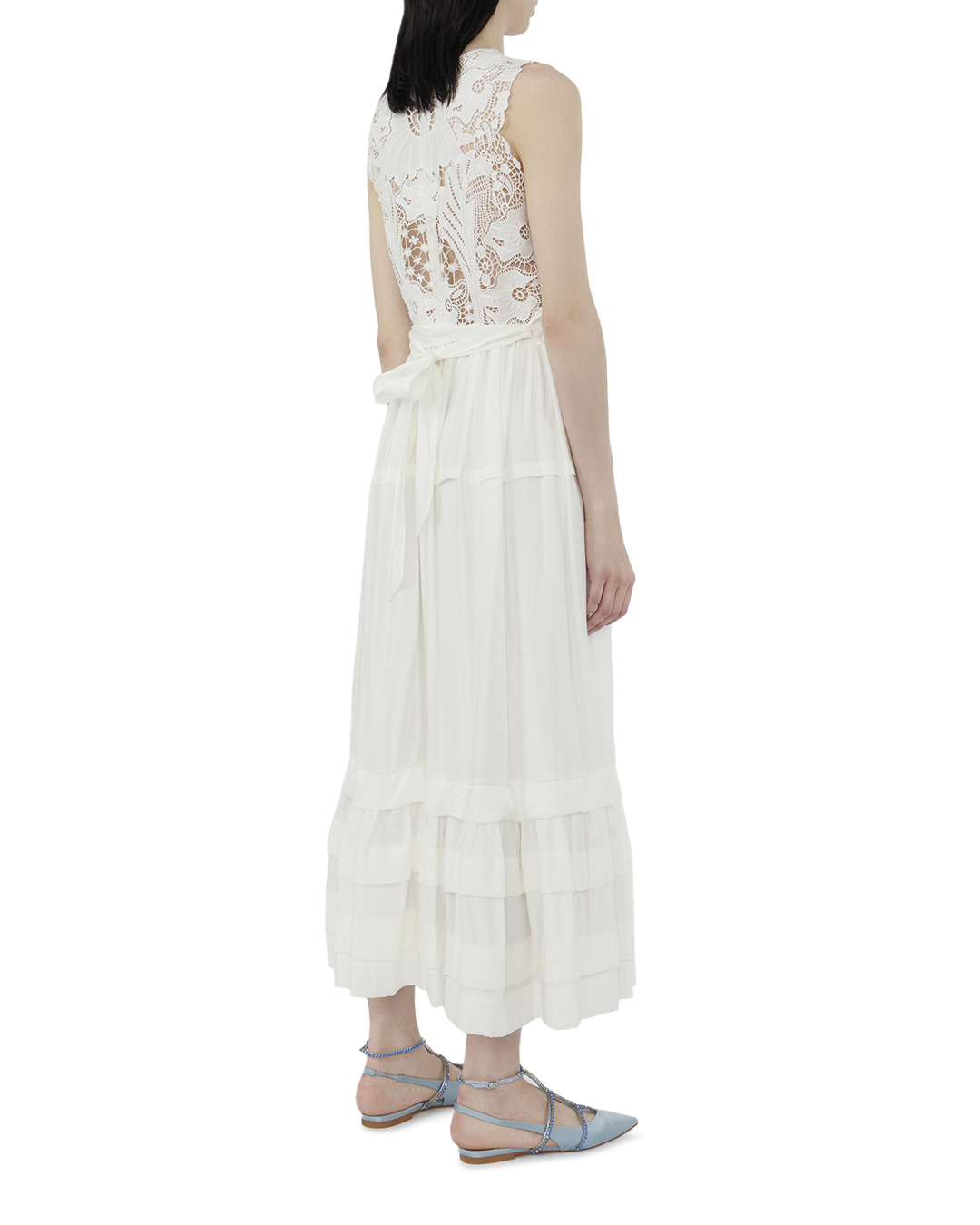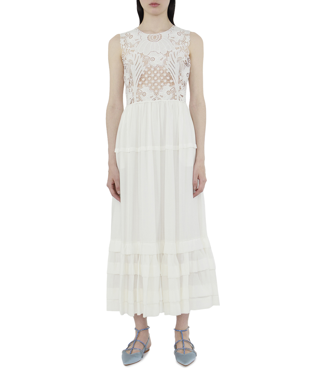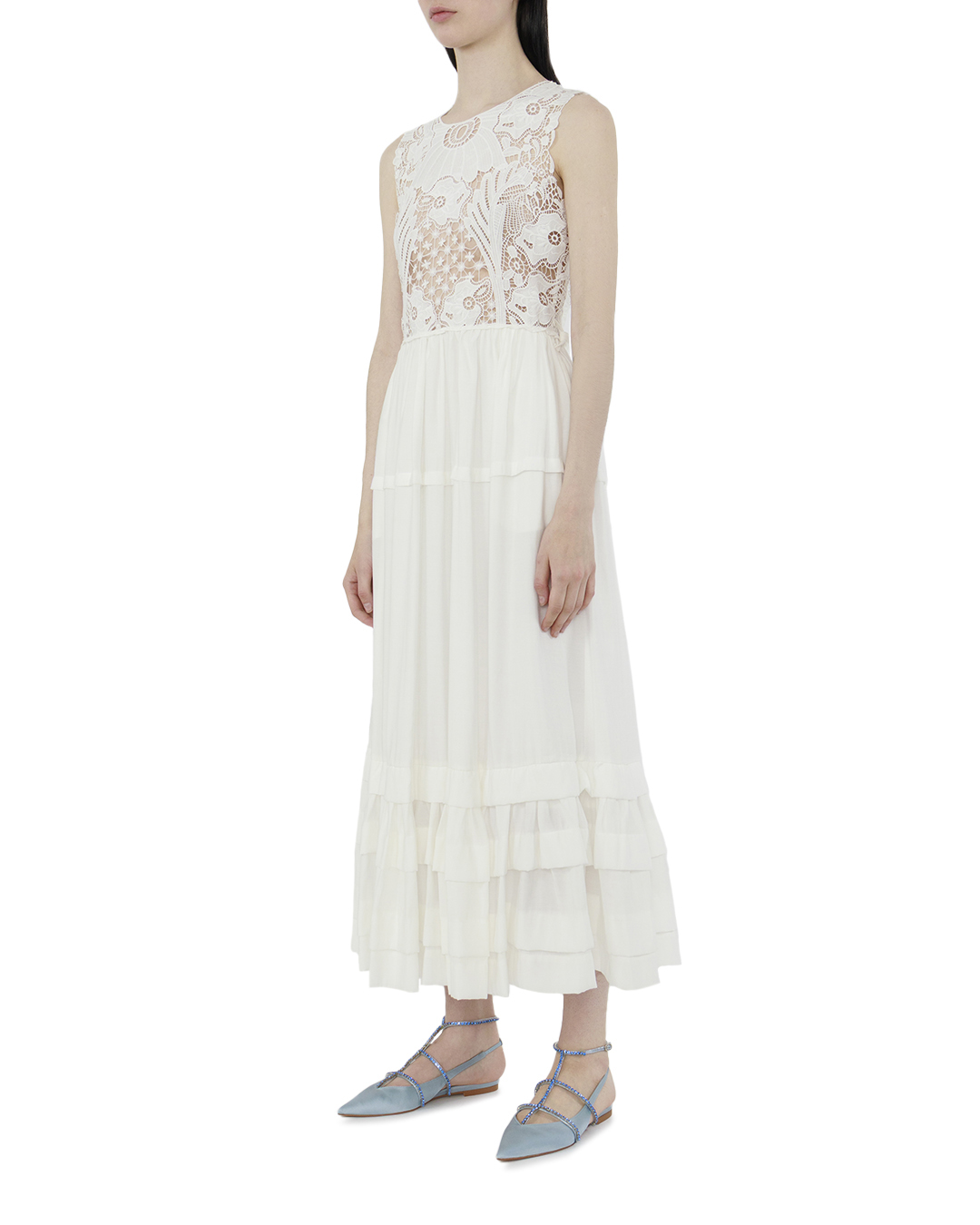 Это платье воплощает в себе элегантность и утонченность благодаря своему изысканному дизайну и продуманным деталям отделки. На первый взгляд, бросается в глаза восхитительная кружевная верхняя часть, украшенная деликатными цветочными мотивами. Тонкая работа кружева позволяет создать эффектность и добавляет романтичный акцент. Круглый вырез гармонично завершает лиф, придавая образу легкость и изящество. Платье выполнено в струящемся силуэте, который плавно облегает фигуру, подчеркивая её достоинства и создавая ощущение легкости и воздушности. Юбка платья ниспадает мягкими складками, изящно обрамляя силуэт. Многоярусные рюши внизу добавляют динамику и текстуру, создавая эффект легкого движения при каждом шаге. Использование полупрозрачных материалов добавляет многослойность и глубину, позволяя игре света модифицировать платье, создавая загадочный и чарующий образ. Этот наряд идеально подходит для особых случаев, подчеркивая утонченный вкус и женственность его обладательницы.
