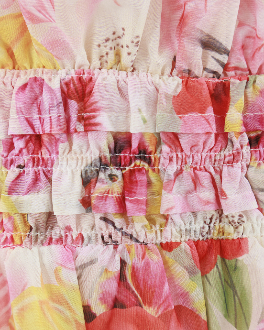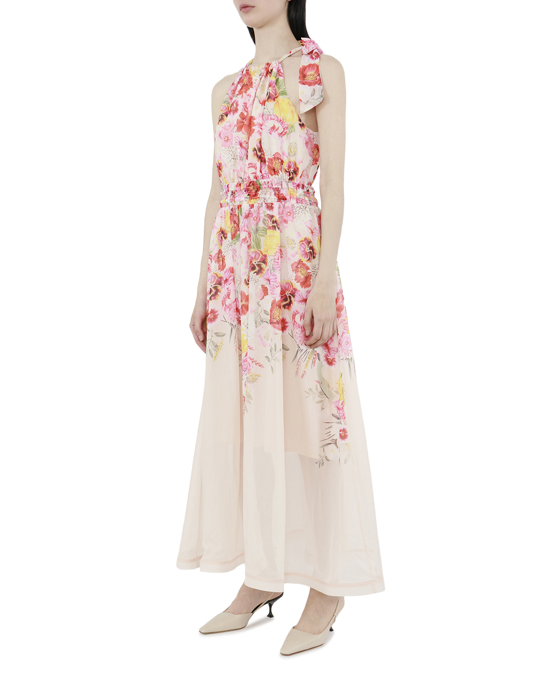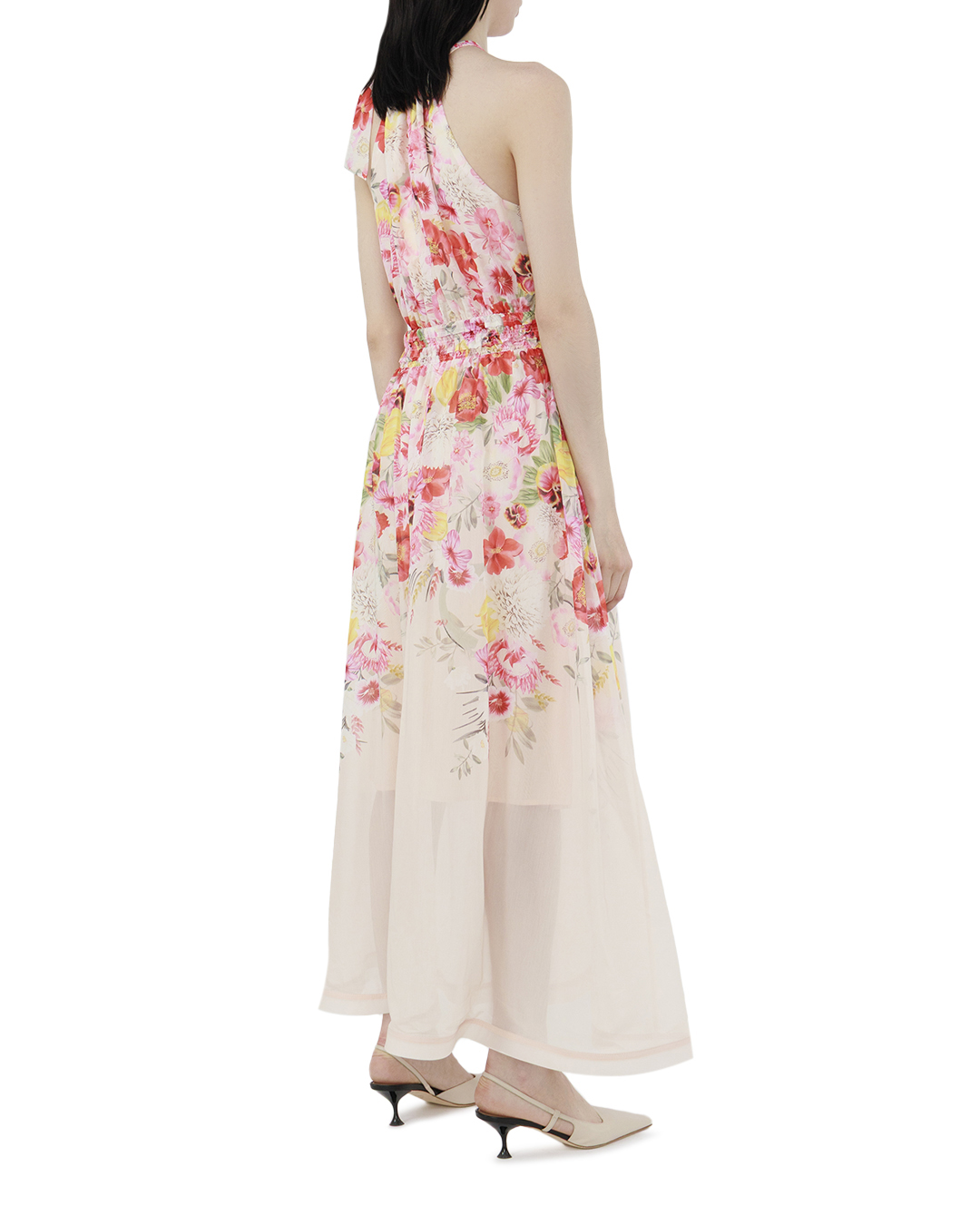Это платье воплощает идею летней свежести и лёгкости благодаря своему романтичному дизайну и яркой цветочной палитре. Верхняя часть украшена нежным цветочным принтом, который игриво разбросан по ткани, создавая атмосферу легкости и непринужденности. Тонкие бретели, изящно завязанные бантом на плечах, добавляют образу женственности и игривости, позволяя регулировать посадку и добавляя элемент индивидуальности. Слегка завышенная талия подчеркнута тонким эластичным поясом, который комфортно обрамляет фигуру и обеспечивает идеальную посадку. Прозрачный многослойный шифон струится мягкими складками вниз, образуя изящную летящую юбку, которая при каждом движении создает эффект воздушной лёгкости. Многоярусные слои и легкая подкладка обеспечивают дополнительный объём и движение, создавая танцующий силуэт. Это платье станет прекрасным выбором для летних прогулок или особых мероприятий на свежем воздухе, подчёркивая безмятежность и природное очарование своей обладательницы.