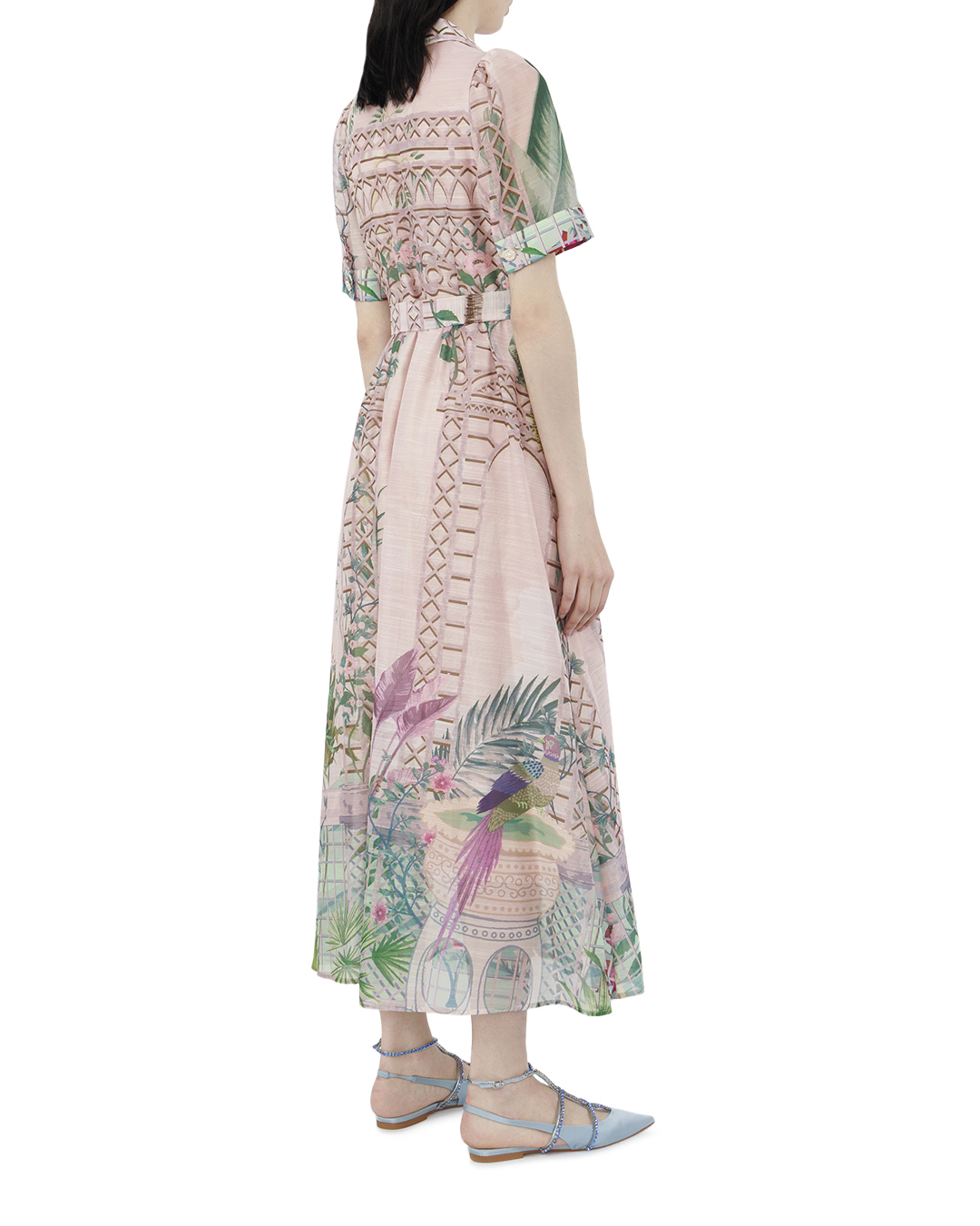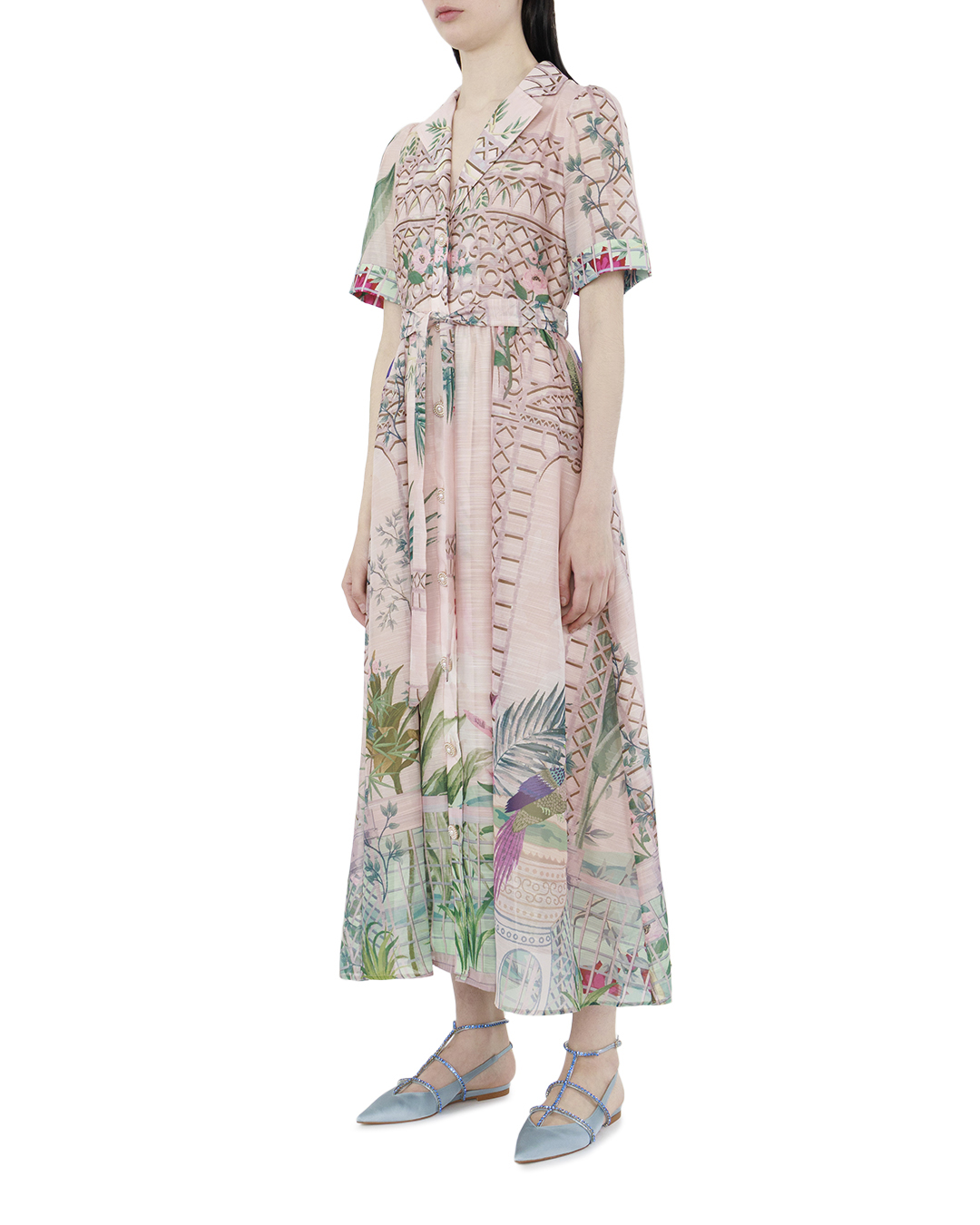 Это платье восхищает своим утонченным дизайном и яркими принтами, создающими атмосферу экзотического сада. Изготовленное из легкой и струящейся ткани, оно предлагает элегантную интерпретацию классического платья-рубашки. Верхняя часть выполнена с отложным воротником и короткими рукавами, что добавляет непринужденной классической строгости. Планка с изящными пуговицами по всей длине платья акцентирует внимание на вертикальных линиях, визуально удлиняя силуэт. Главное украшение этого платья — насыщенный принт с изображениями тропических растений и архитектурных элементов, сделанный в пастельных тонах. Эти детали оживляют наряд, добавляя ему богатства и эклектики. Талия подчеркнута изящной линией, от которой начинается пышная, слегка расклешенная юбка. Легкие складки обеспечивают дополнительный объем и движение, придавая образу грациозность и воздушность. Это платье идеально для дневных мероприятий или прогулок, когда хочется выглядеть элегантно и выделяться утонченным чувством стиля. Сочетая нежные оттенки с экзотическими мотивами, оно создает образ, полный харизмы и жизнерадостности.
