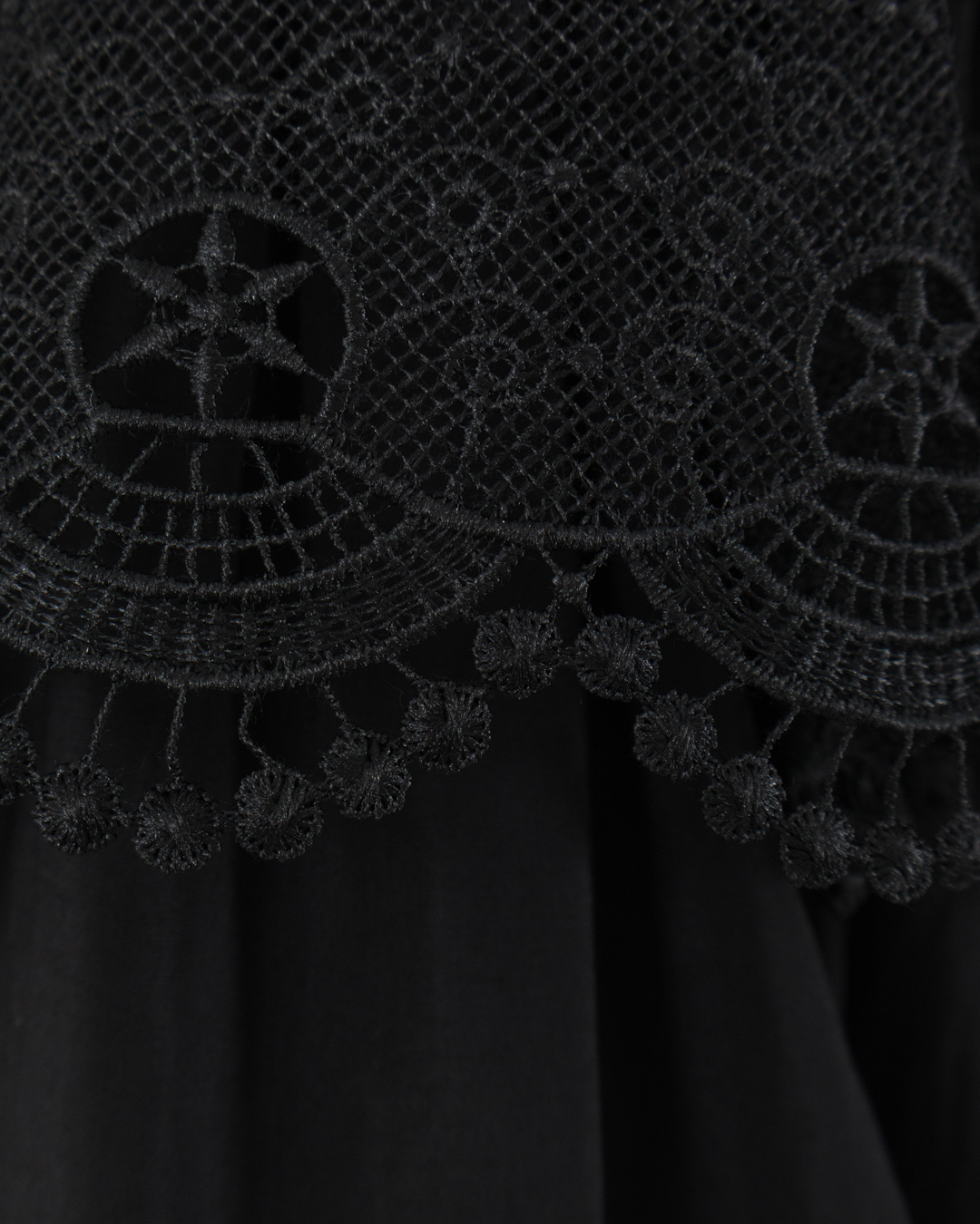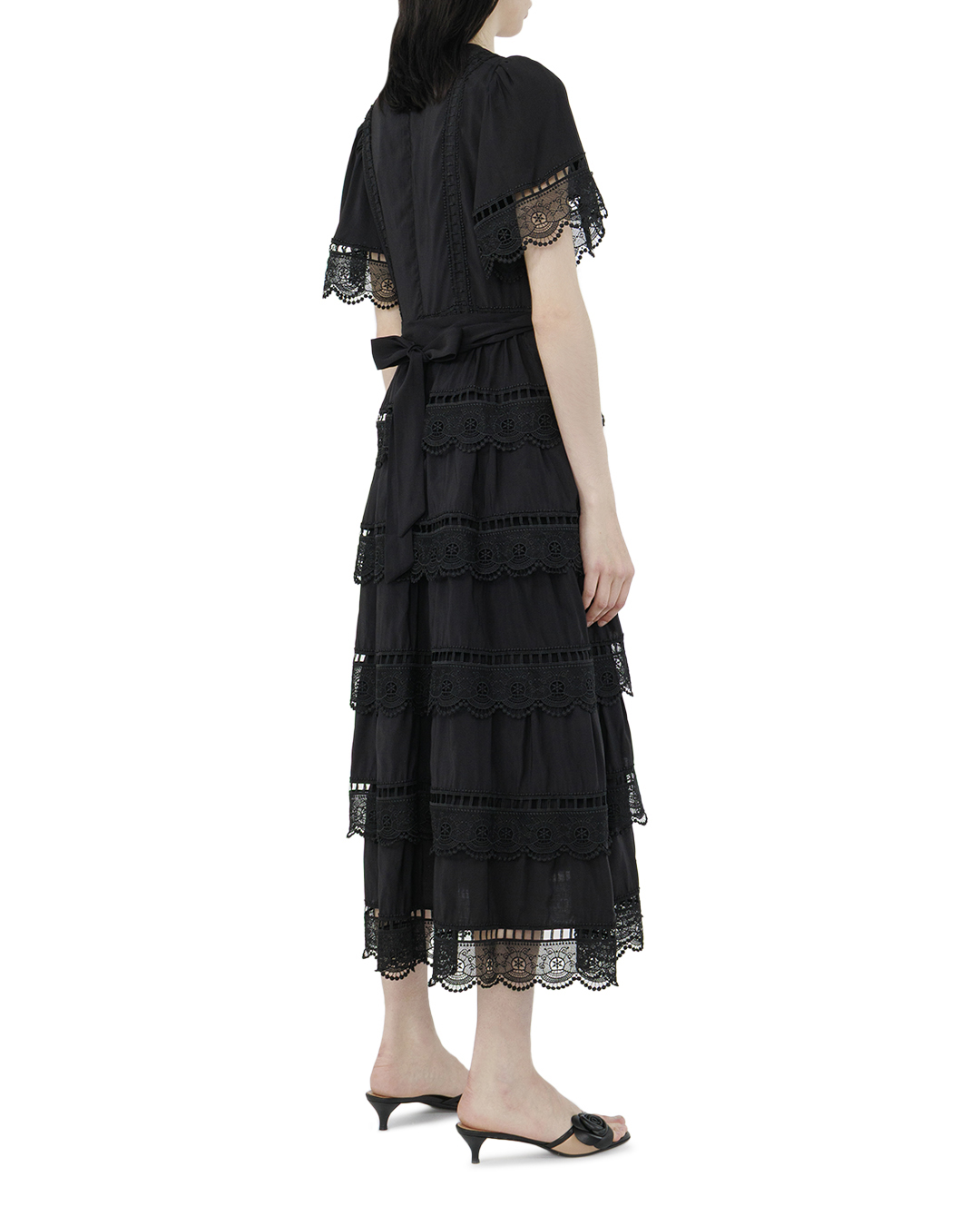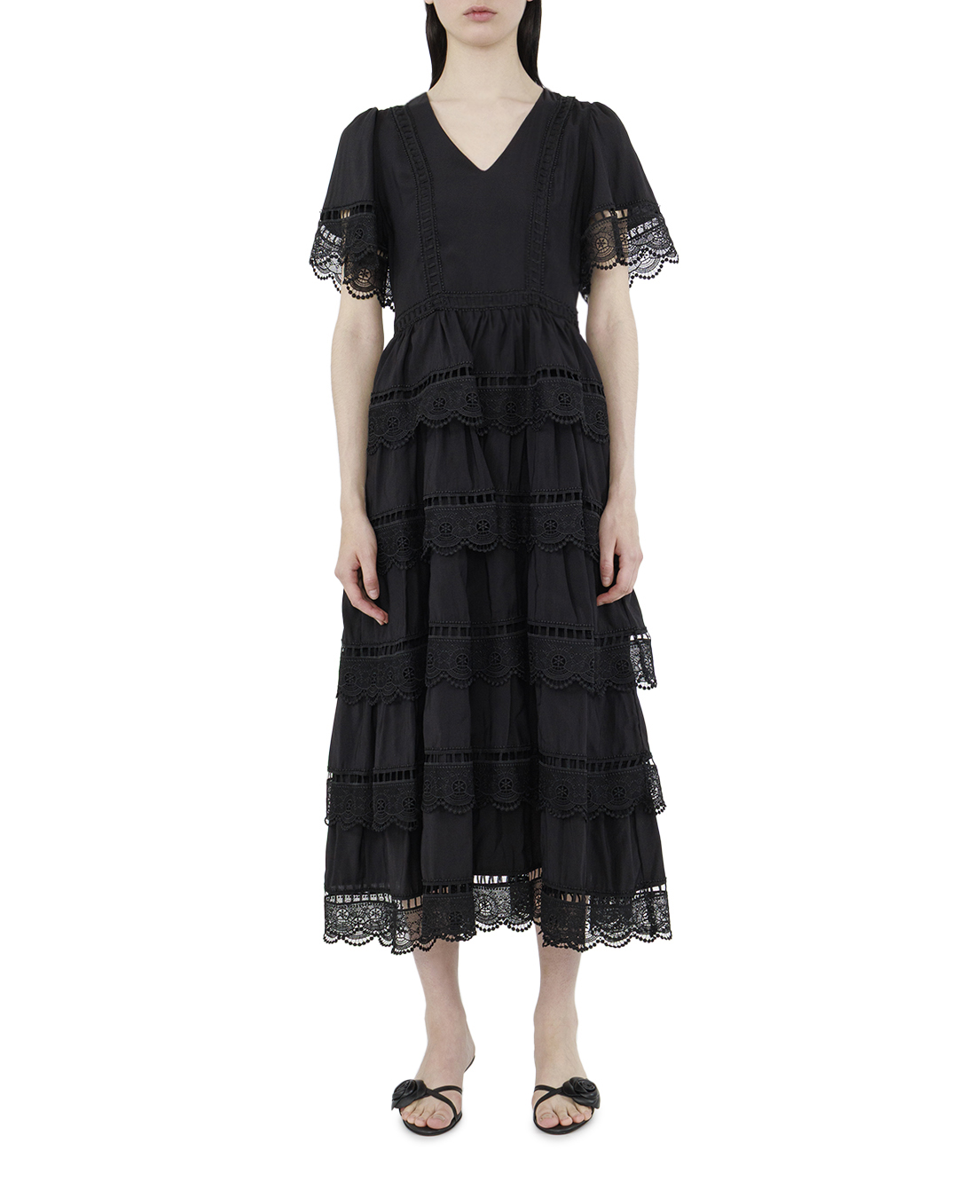 Это платье представляет собой воплощение романтической классики и элегантности благодаря своему воздушному силуэту и изысканной отделке. Выполненное из легкой ткани, оно предлагает ощущение свободы и непринужденной женственности. Верх украшен V-образным вырезом, который изящно удлиняет шею, а широкие короткие рукава с кружевными краями добавляют нежности и лёгкости. Эти детали придают образу утончённость и изысканный шарм, привнося элемент богемности. Платье имеет многослойную юбку с акцентом на горизонтальные полосы кружева, которые создают эффект ярусности и объемности. Мягкие оборки и кружевные вставки добавляют текстуру и динамику, подчеркивая грациозность движений. Эта модель прекрасно сочетается с нежными аксессуарами и идеально подходит для летних прогулок или утонченных загородных мероприятий. Платье излучает элегантную простоту и неподвластный времени стиль, позволяя своей обладательнице ощущать себя уверенно и непринужденно.
