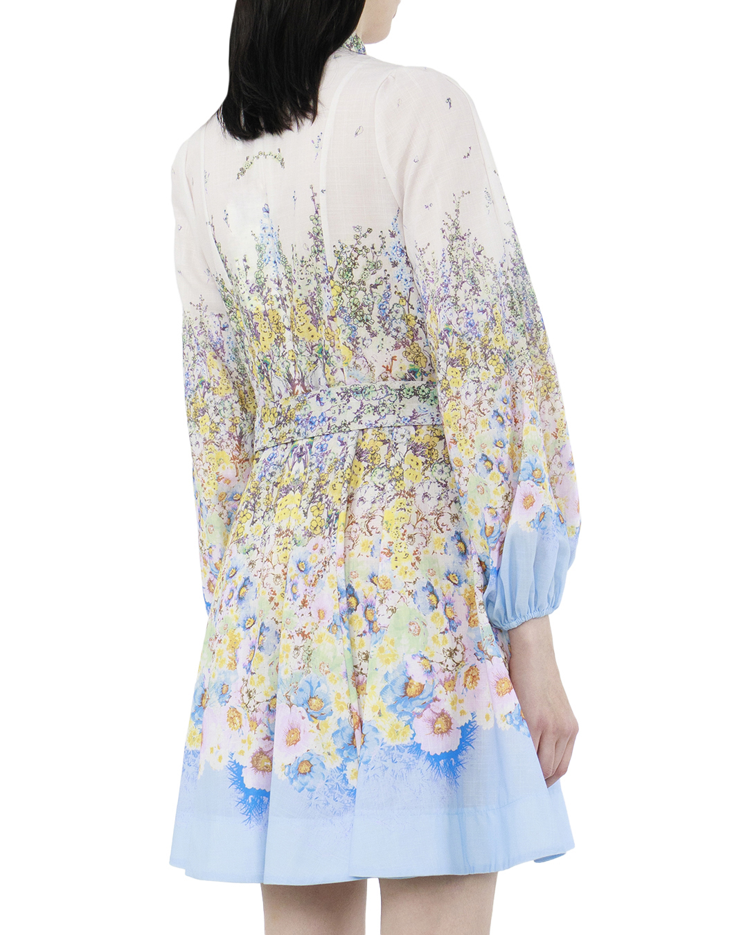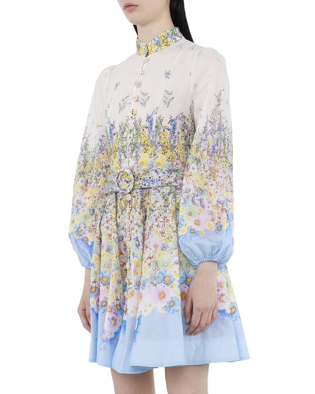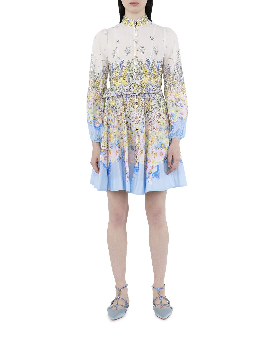 Это платье представляет собой сочетание утонченной романтики и современного шика, даря своей обладательнице ощущение изысканности и женственности. Выполненное из лёгкой ткани, оно украшено акварельным цветочным принтом, который создает иллюзию цветущего сада. Верх платья оформлен с высоким стоячим воротником и нежной планкой с пуговицами, подчеркнутой тонкими декоративными элементами, которые добавляют изысканности. Длинные рукава с мягкой сборкой у манжет придают образу легкость и утонченность. Талия акцентирована поясом, который деликатно подчёркивает фигуру и добавляет структуру романтичному силуэту. Расклешенная юбка средней длины создаёт плавный, игривый объем, усиливая элегантную динамику и легкость платья. Нежный градиент нежно-голубых и пастельных оттенков усиливает эффект легкости и воздушности, превращая платье в настоящее произведение искусства. Оно идеально подходит для торжественных мероприятий или романтических свиданий, подчеркивая утонченность и элегантность своей обладательницы. Это платье – воплощение современного романтичного стиля, сочетая в себе элементы классики и креативности.