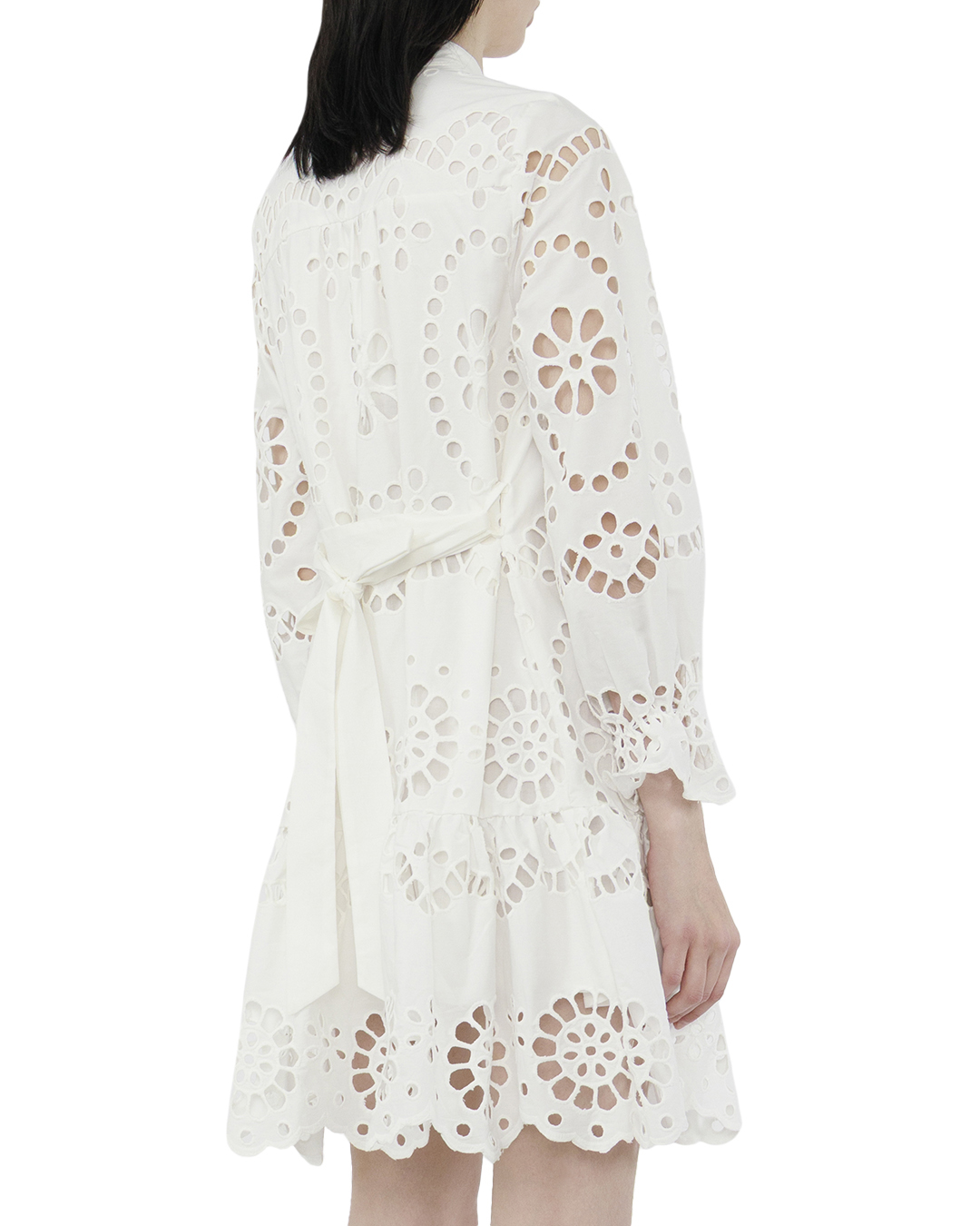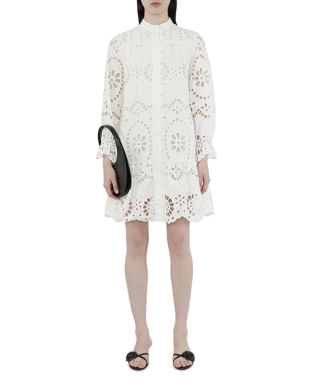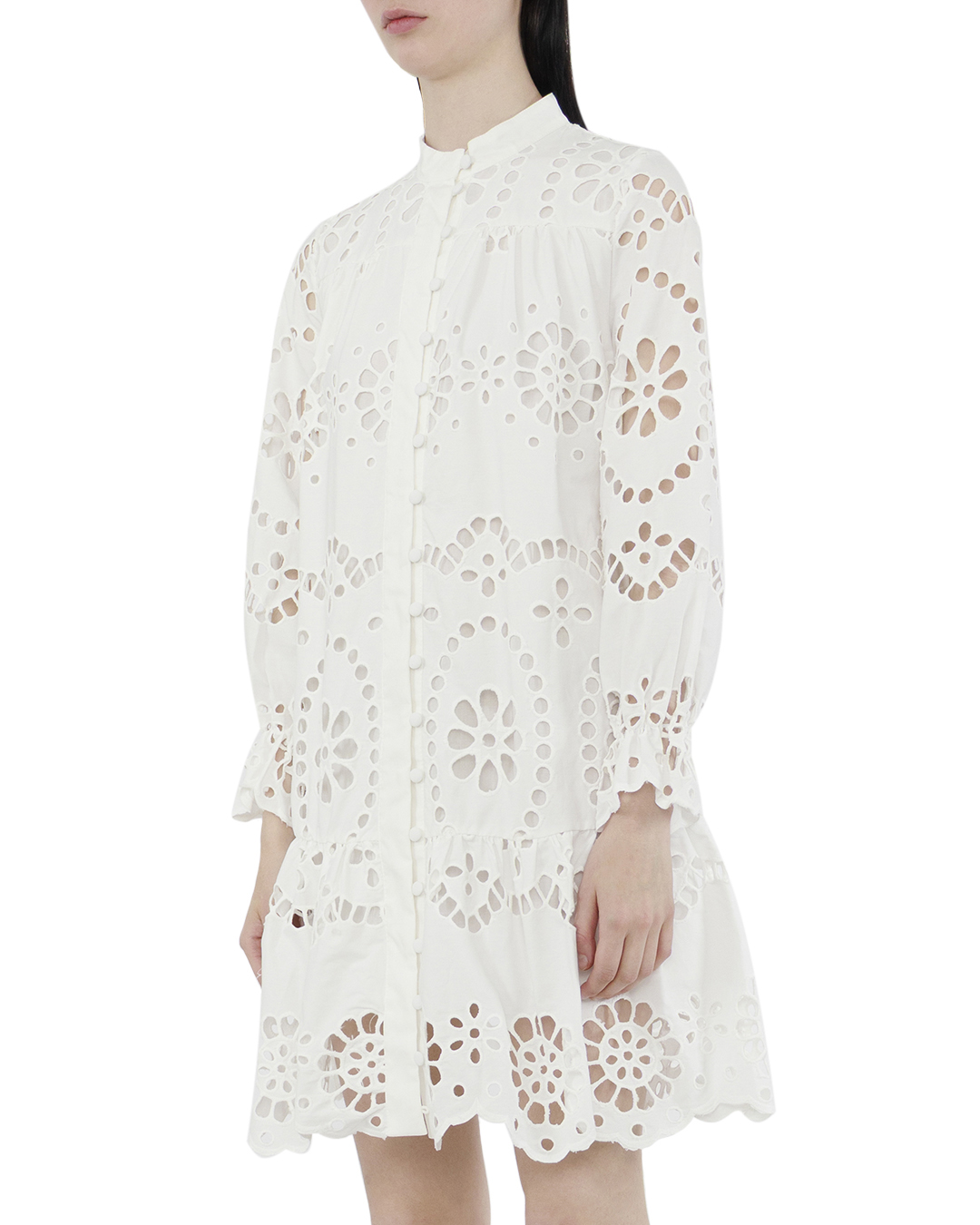 Это платье представляет собой изысканную интерпретацию классического стиля, воплощая очарование и современный шик. Выполненное из тонкого хлопка, оно обеспечивает комфорт и легкость, идеально подходя для теплых сезонов. Верхняя часть платья имеет стоячий воротник и пуговицы, которые создают вертикальную линию и визуально удлиняют силуэт. Длинные рукава на манжетах с легким оборочным акцентом добавляют романтичности и нежности. Главное очарование этого наряда заключается в искусной вышивке в технике «ригеле́» или перфорации, создающей замысловатые узоры и прозрачные акценты. Эти детали добавляют текстуру и глубину, подчёркивая сложность и утонченность дизайна. Короткая, слегка расклешенная юбка придает образу молодость и игривость, делая платье универсальным для разных случаев — от прогулок по городским улицам до встреч с друзьями. Это платье сочетает в себе традиции и современность, удивляя своей простотой и элегантностью.