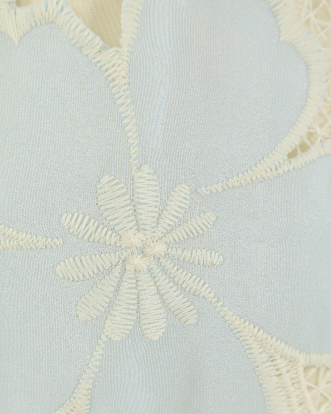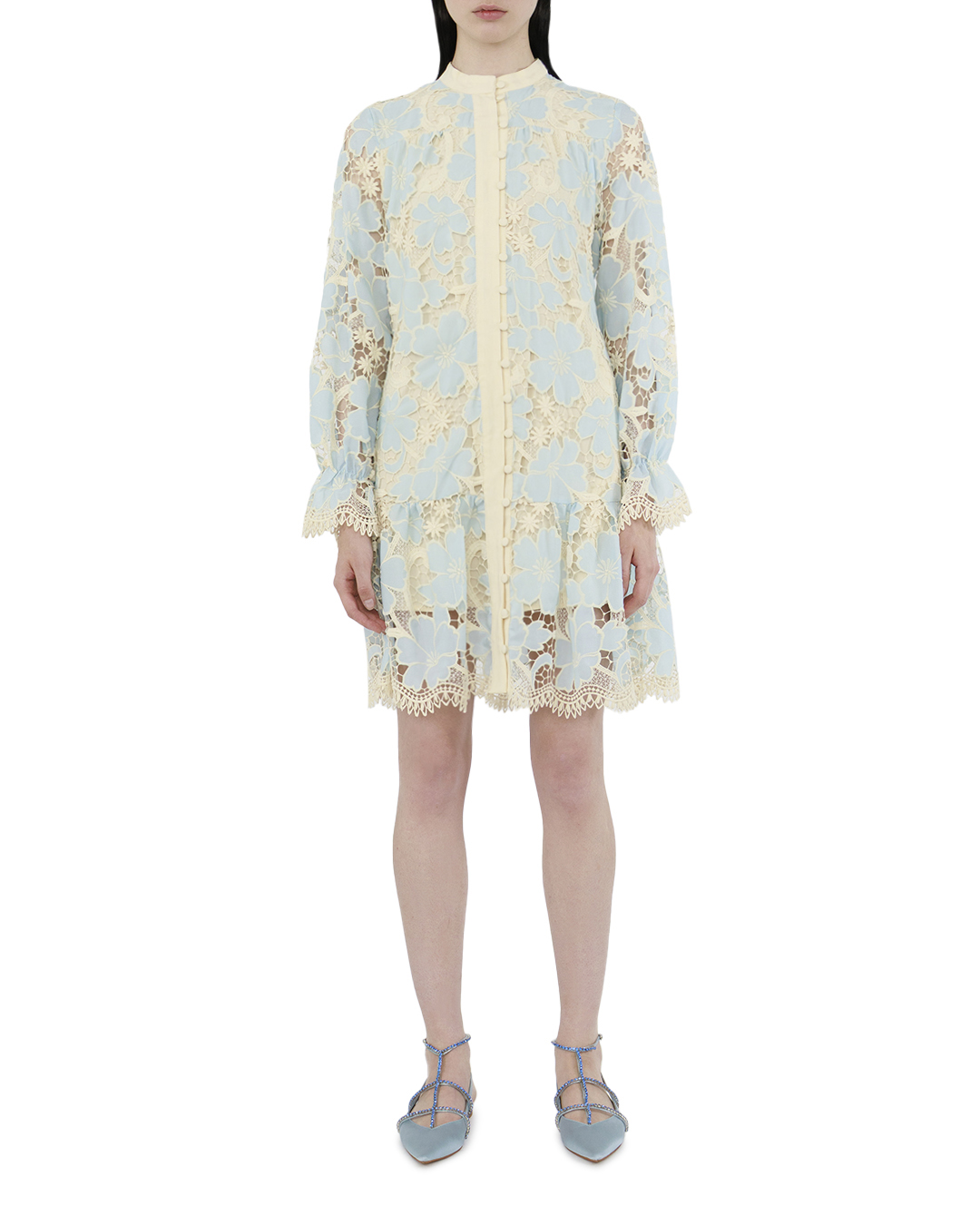 Это платье воплощает в себе утонченную романтику с современным акцентом, идеально подходя для тех, кто ценит изысканные детали. Изготовленное из нежного кружева, оно излучает мягкость и очарование. Цветочный узор в пастельных голубых и кремовых тонах создает эффект легкости и свежести, делая образ невесомым и воздушным. Прозрачные кружевные элементы добавляют глубину и текстурность, создавая игру света и тени. Верх платья выполнен с небольшим стоячим воротником, который подчеркивает утонченность шеи. Центральная застёжка на аккуратные пуговицы придает образу классическую строгость, одновременно добавляя функциональности. Рукава имеют изящные оборки на манжетах, добавляющие легкость и нежность образу. Подол также завершен изысканными кружевными фестонами, которые гармонично завершают общий силуэт платья. Эта модель идеально подойдет для утонченных дневных мероприятий или вечерних выходов, подчеркивая деликатность и женственность своей обладательницы. Платье прекрасно сочетается с минималистичными аксессуарами, позволяя создать образ, полный изящества и стиля.