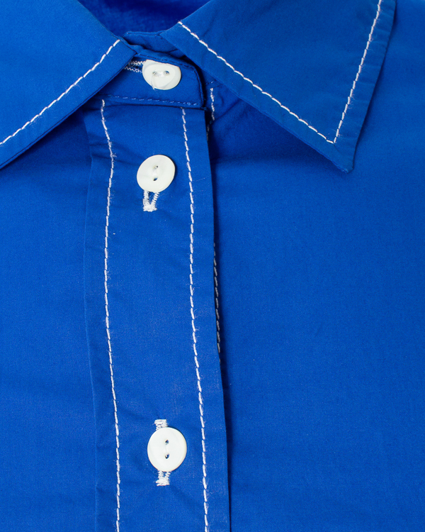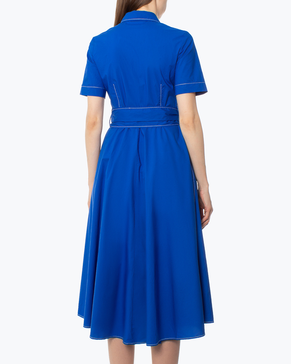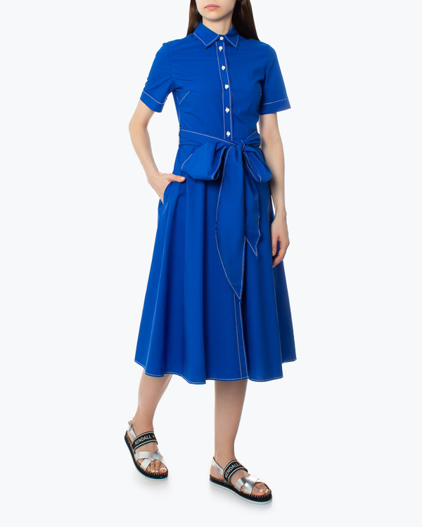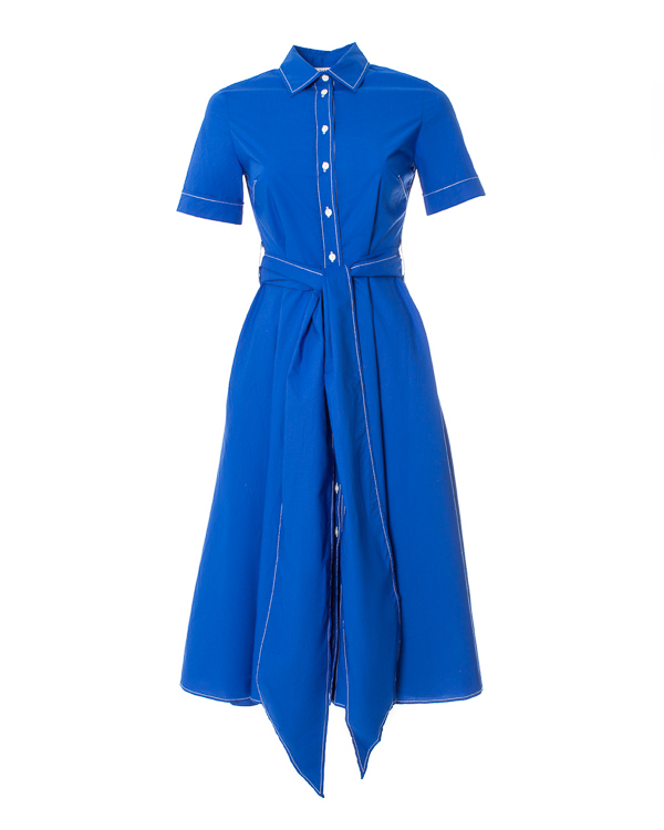 Летнее платье из хлопка насыщенного синего цвета с контрастной строчкой. Модель длины миди приталенного силуэта с застежкой на пуговицы и отложным воротником. Платье дополнено широким поясом из основного материала и двумя карманами по бокам.