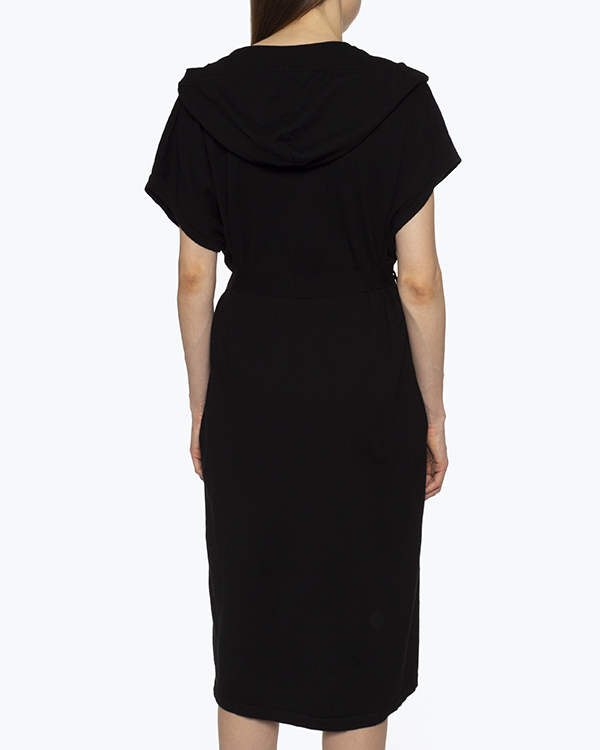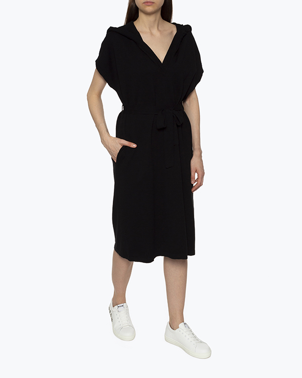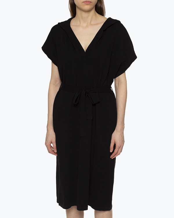 Платье из трикотажного хлопка черного цвета. Приталенное изделие с цельнокроеными рукавами и капюшоном.