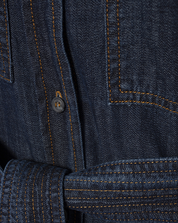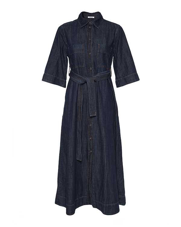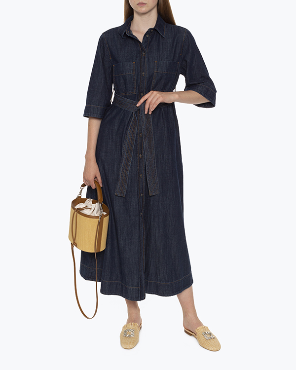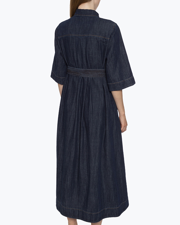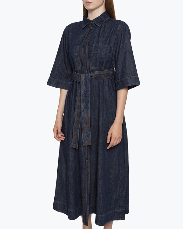 Платье-макси из тонкого хлопковго денима темно-синего оттенка. Модель с застежкой на пуговицы дополнена отложным воротником и накладными карманами. Изделие с поясом из основного материала.
