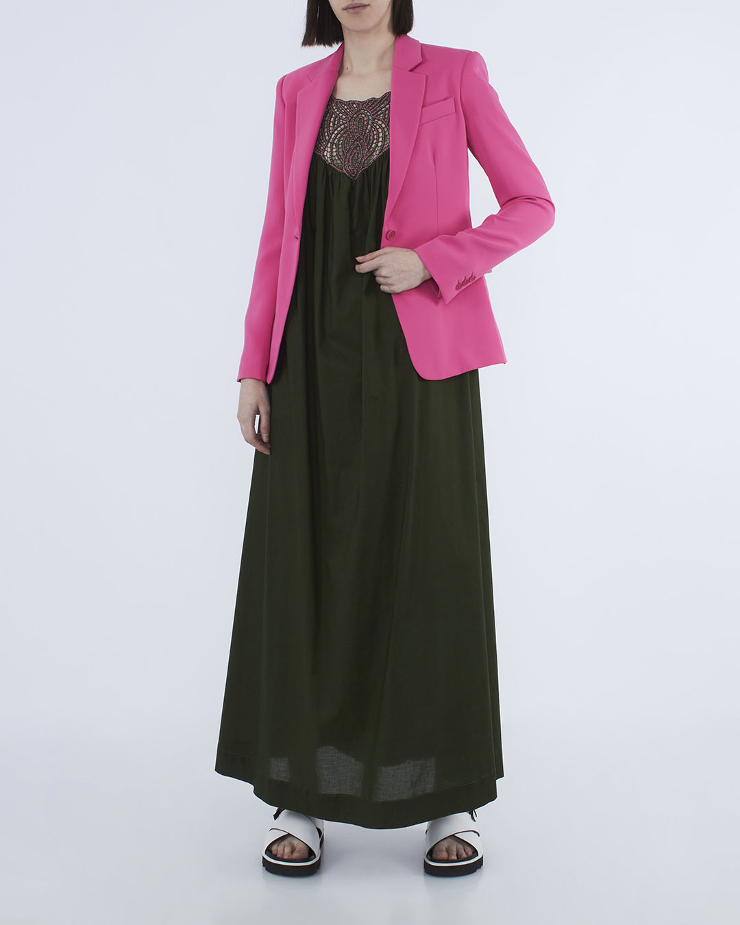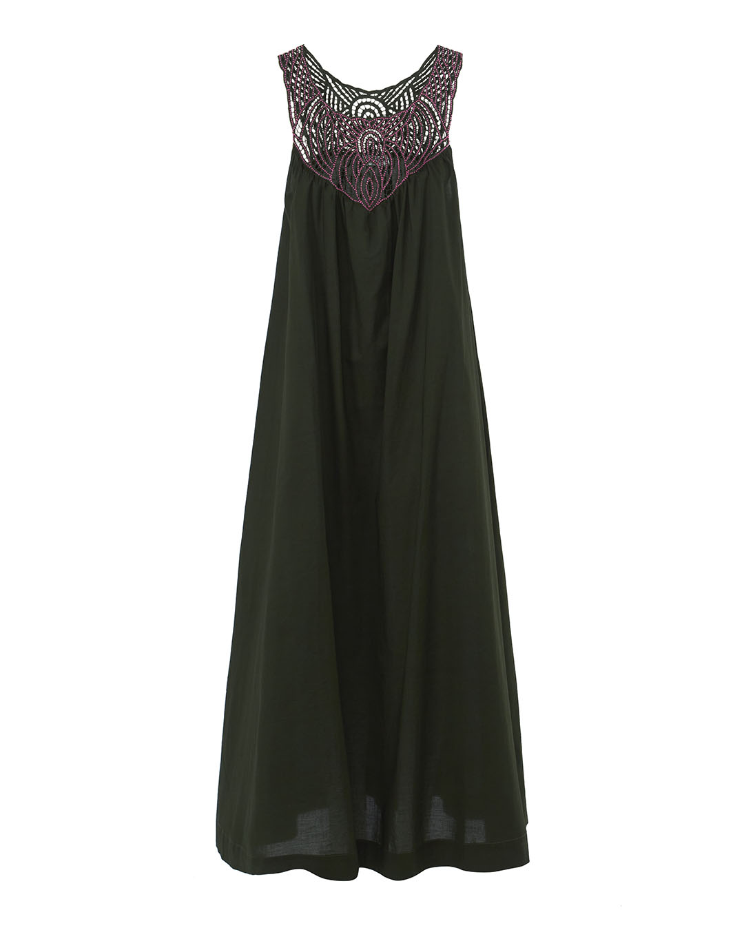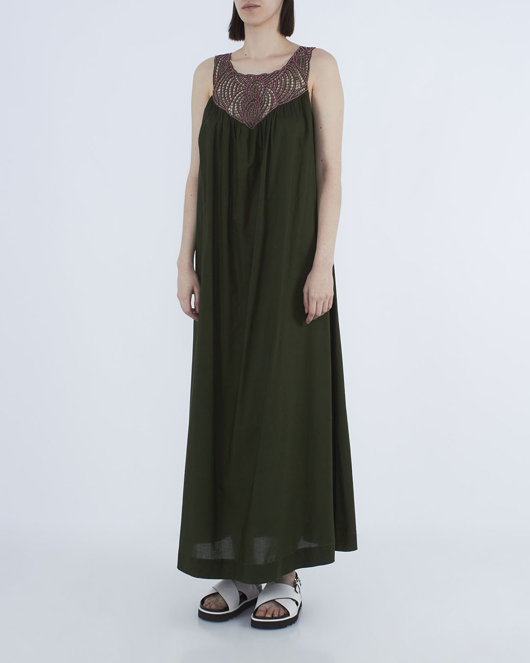 Платье P.A.R.O.S.H. выполнено из тонкого хлопка темно-зеленого оттенка. Свободное изделие длины макси дополнено ручной вышивкой бисером.