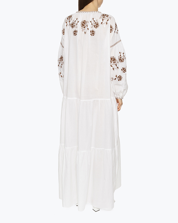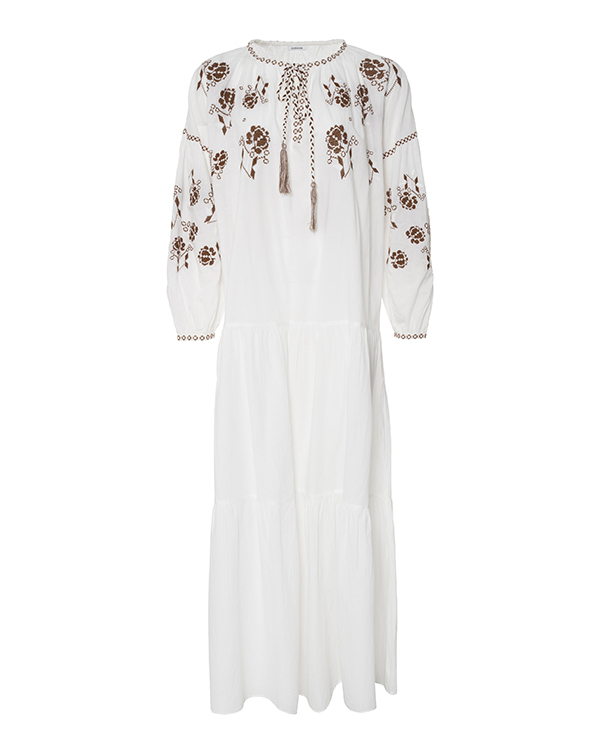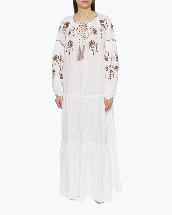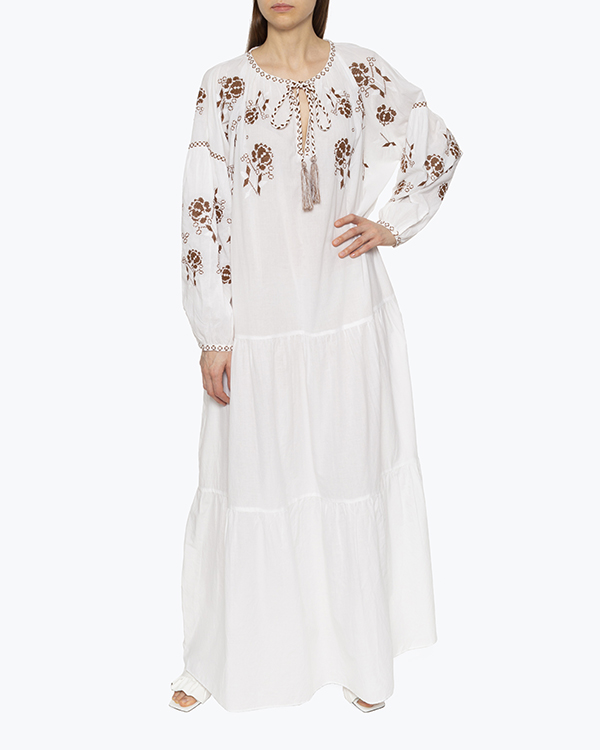 Платье-макси из новой весенне-летней коллекции выполнено из хлопка белого цвета с вышивкой крестиком. Свободное изделие со спущенной линией плеч и воздушными рукавами. Платье с круглым вырезом и завязками.