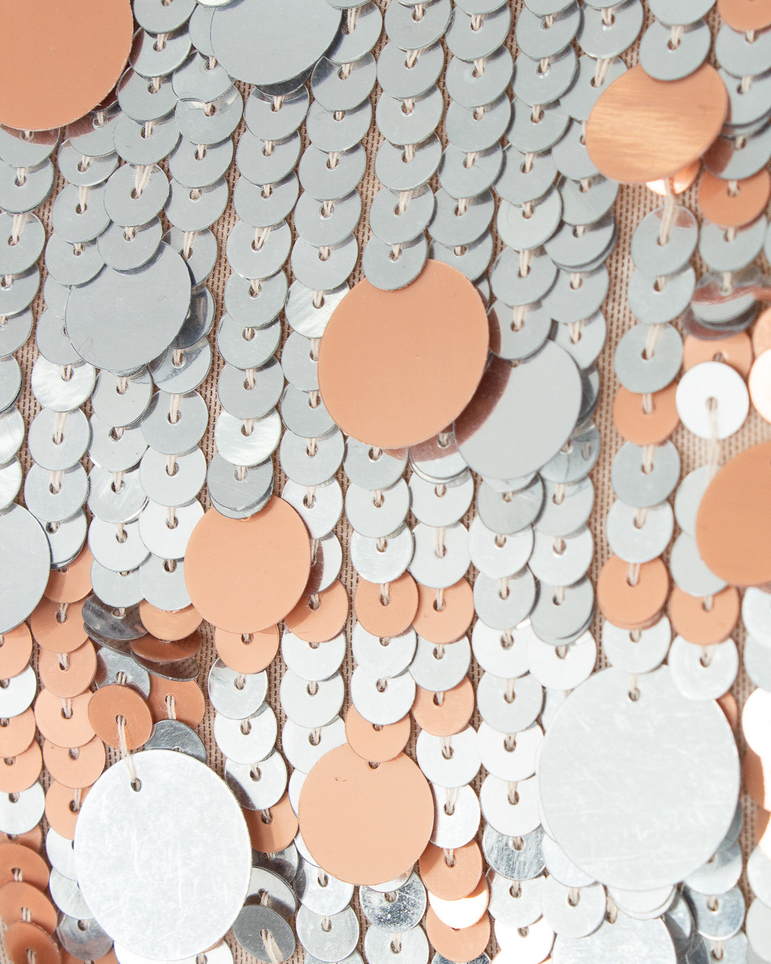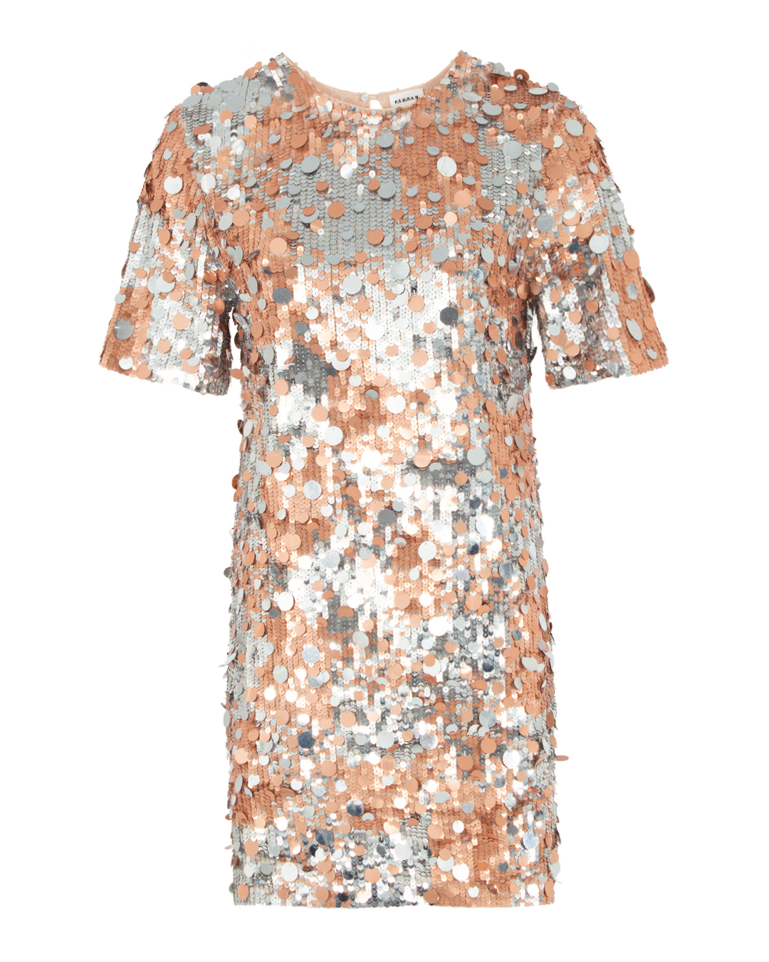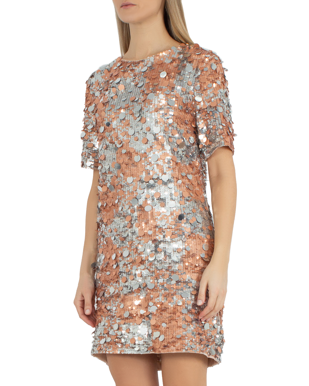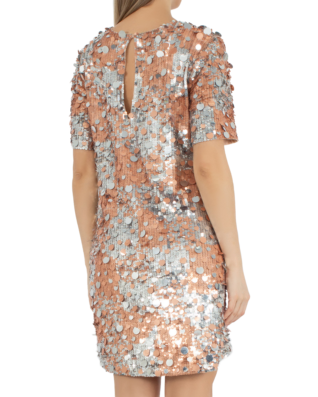 Платье P.A.R.O.S.H. длины мини с блестящими пайетками. Прямой крой и круглая линия выреза дополнены застежкой на спине на пуговицу.