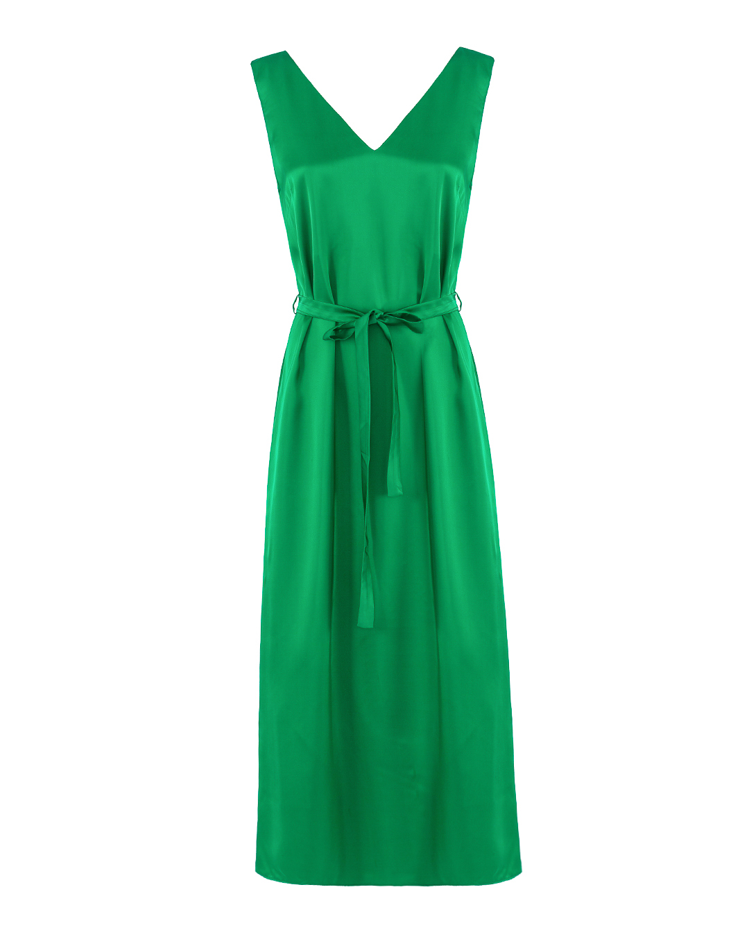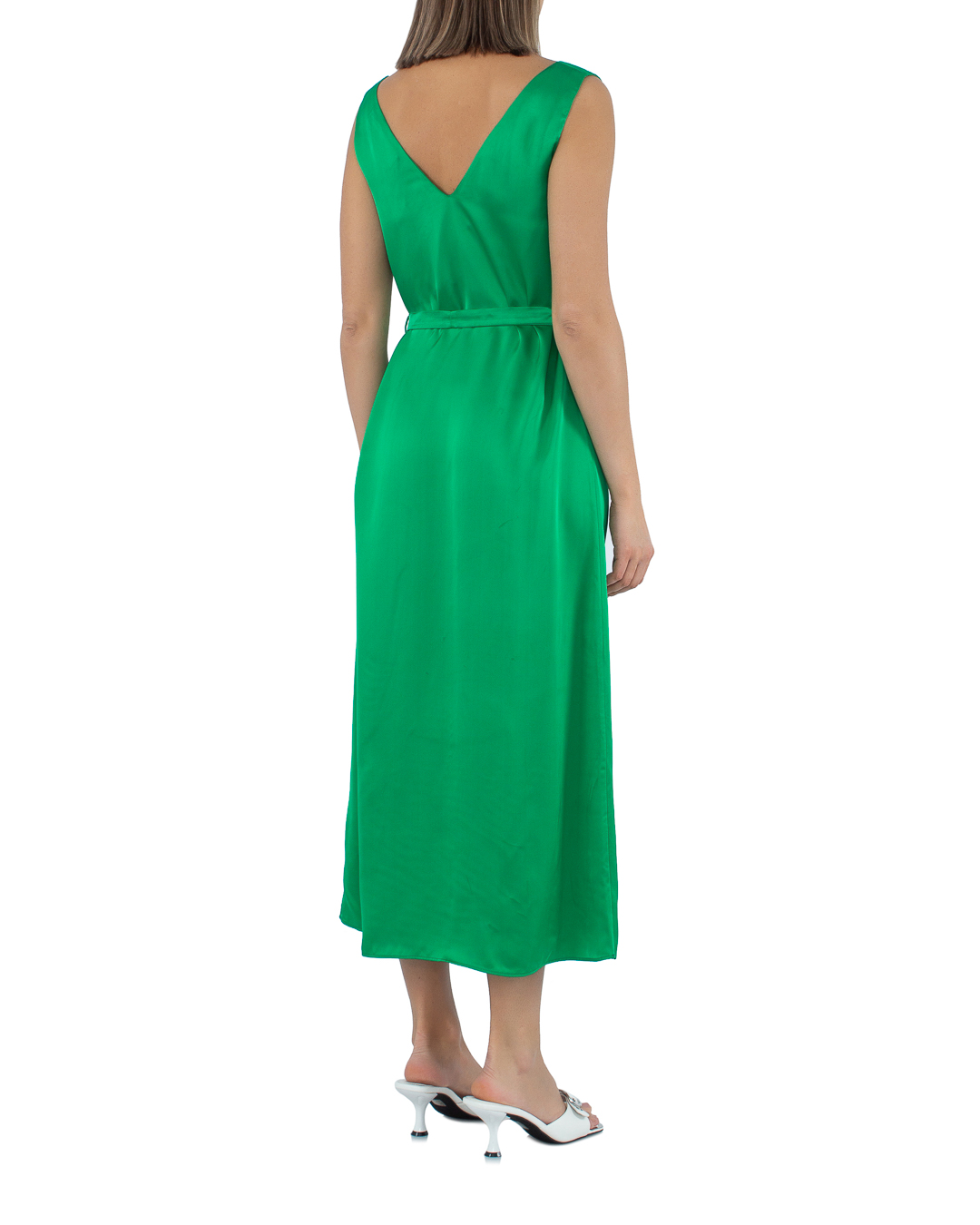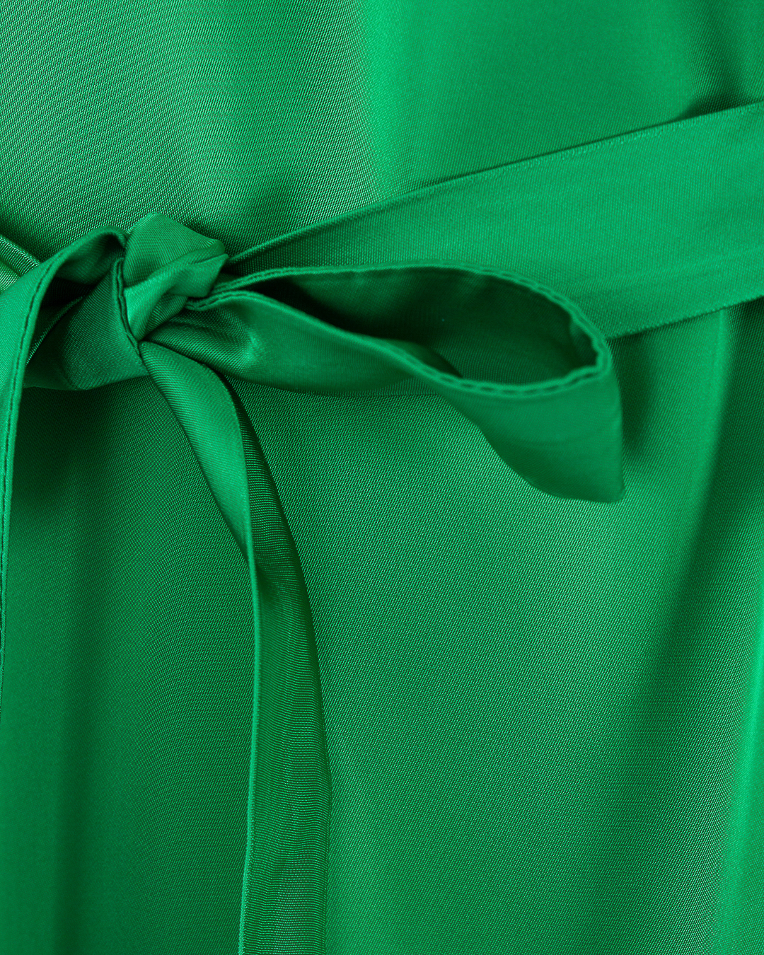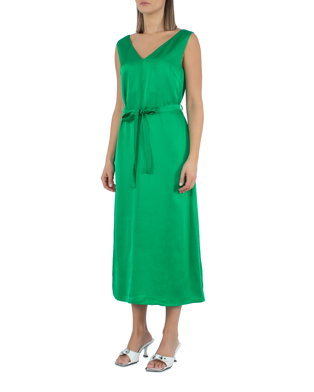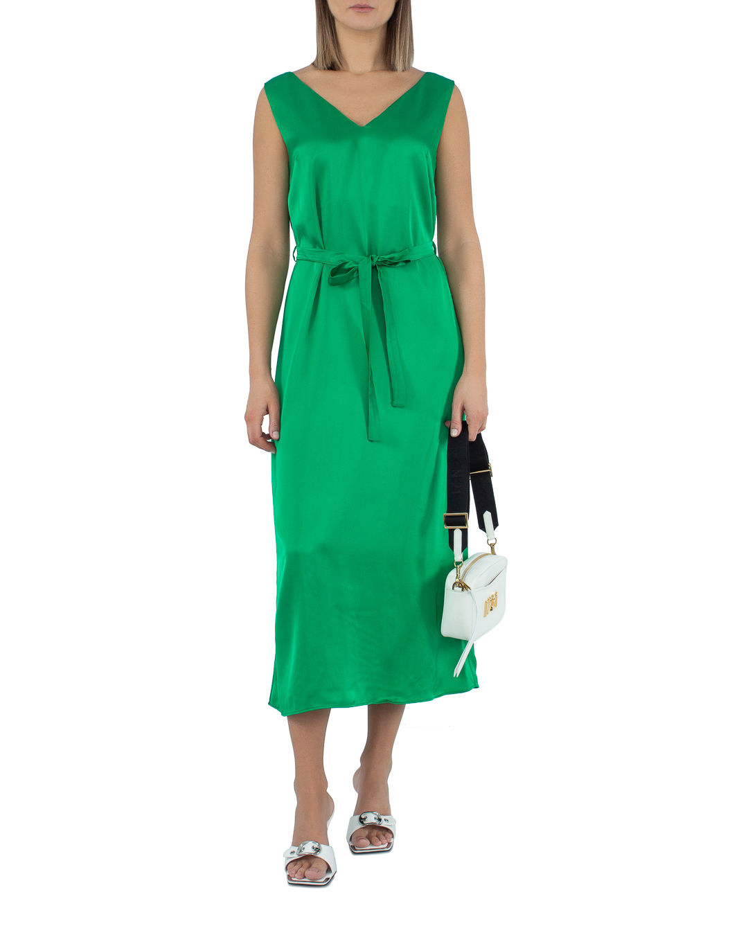 Платье миди из атласной вискозы насыщенного зеленого оттенка. Модель с V-образными вырезами дополнена тонким поясом из основного материала.