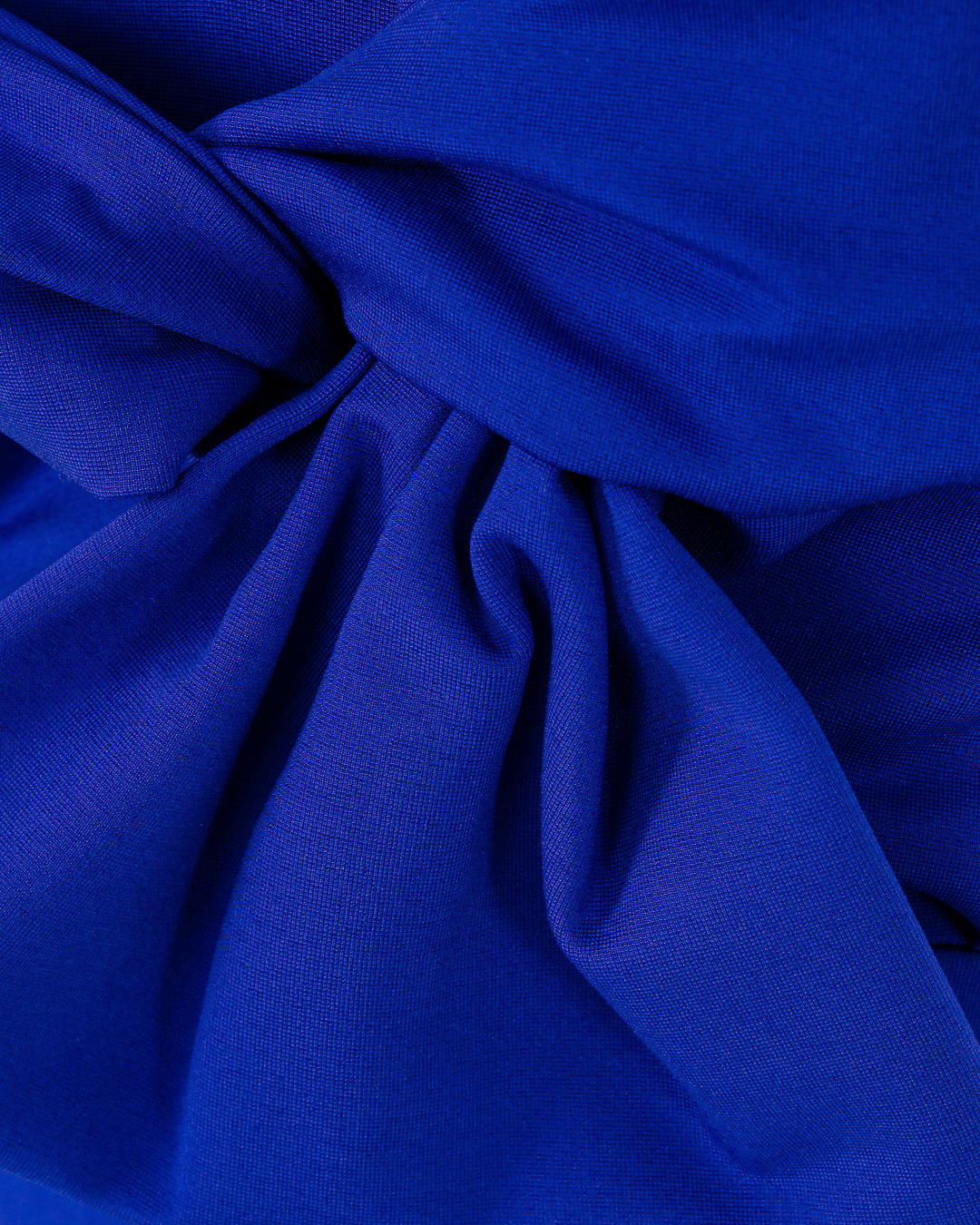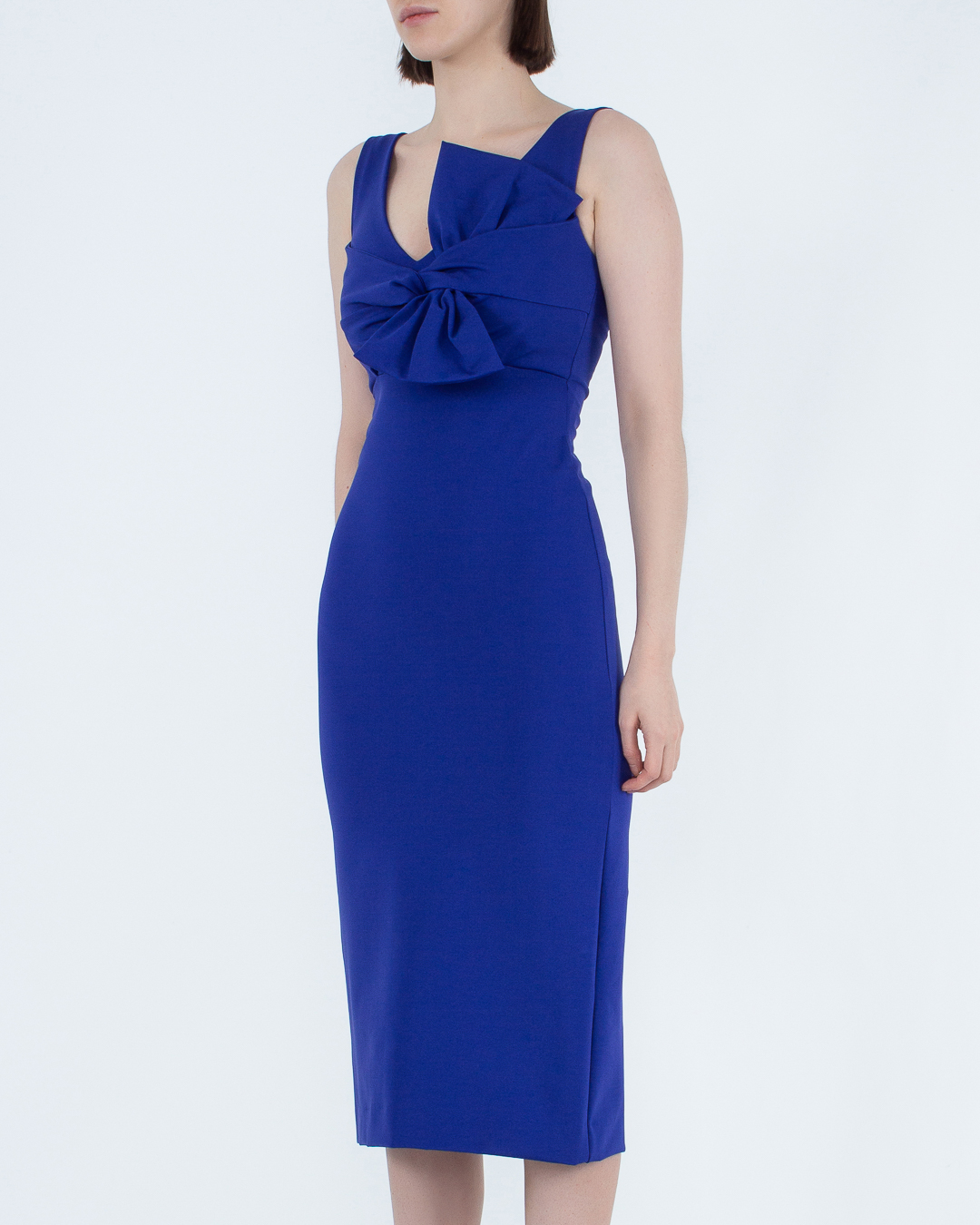 Платье миди P.A.R.O.S.H. из вискозы синего оттенка. Модель облегающего силуэта с объемным декоративным бантом.