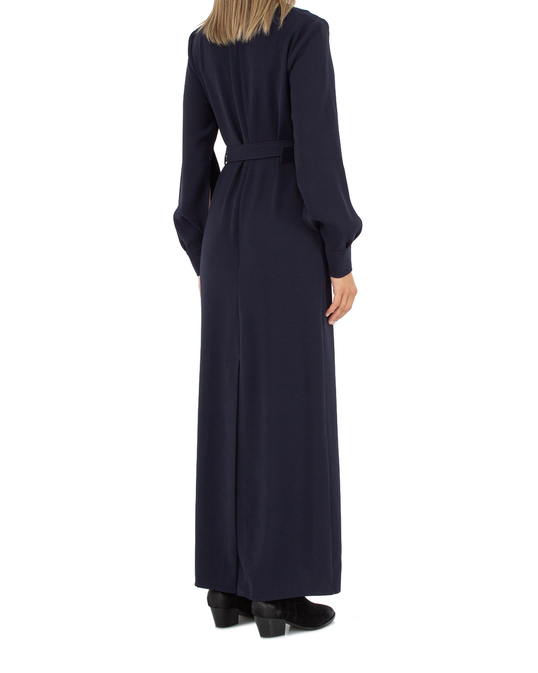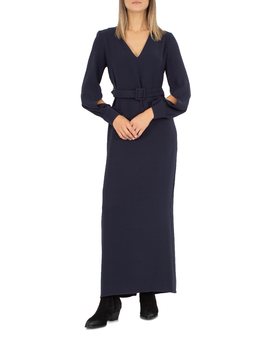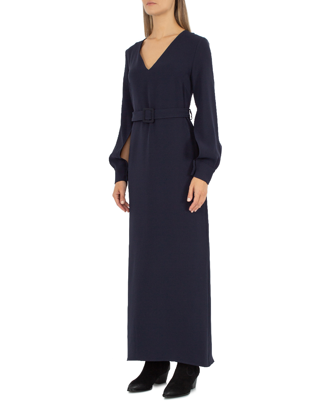 Платье макси P.A.R.O.S.H из крепа. Модель с длинными рукавами с разрезами и застежкой на спине на потайную молнию дополнено поясом из основного материала.