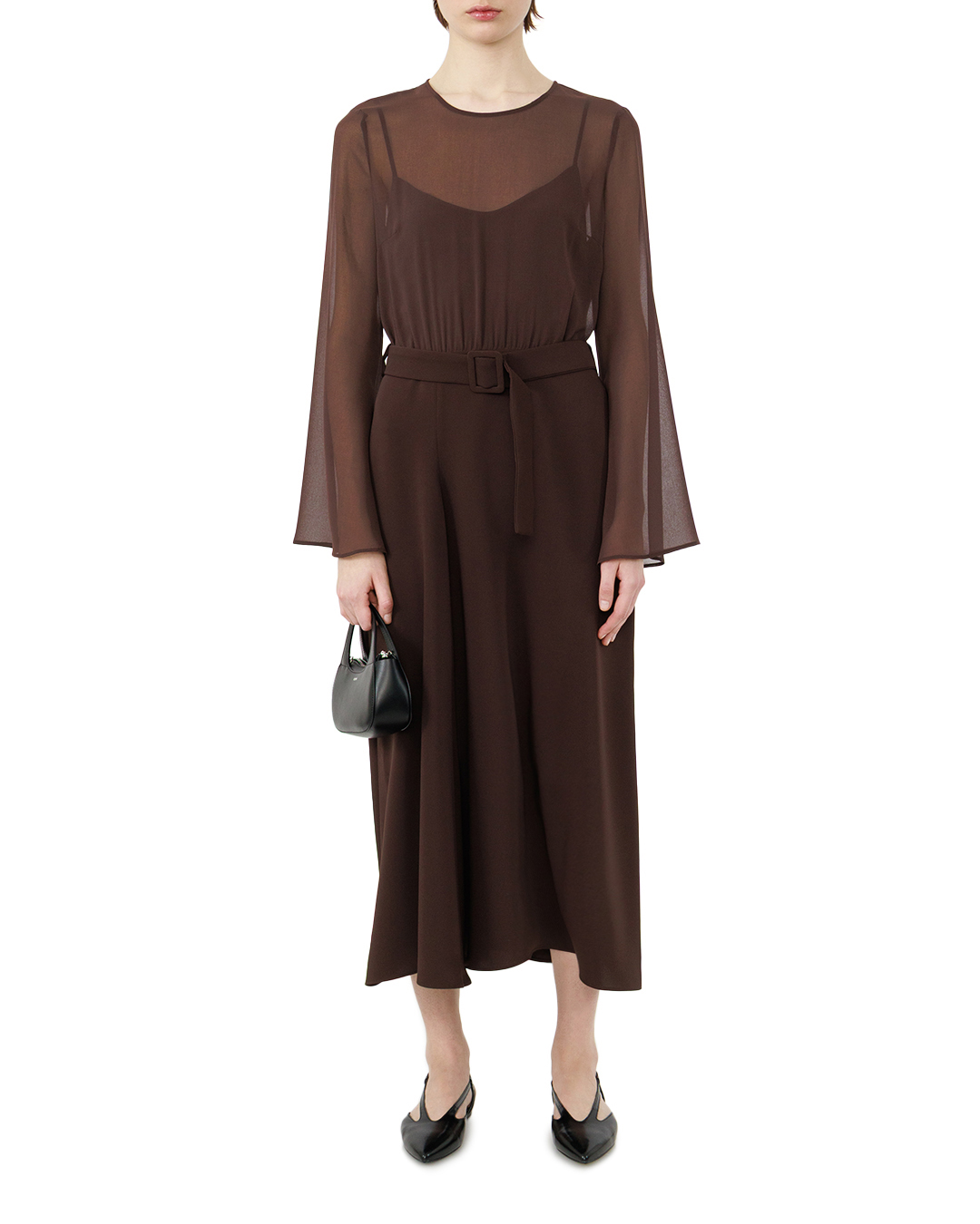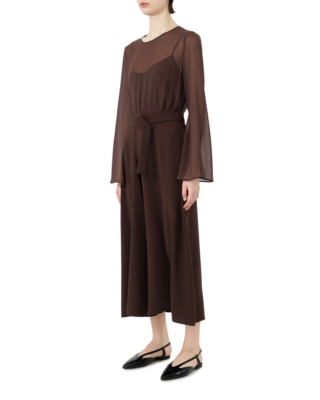 Это платье — воплощение элегантной сдержанности и утончённого вкуса. Глубокий шоколадный оттенок создаёт ощущение благородной роскоши, а лаконичный крой подчёркивает женственность силуэта без излишней вычурности. Особую выразительность образу придаёт комбинирование прозрачных рукавов и верхней части с плотной основой платья. Полупрозрачные элементы мягко структурируют верхнюю часть композиции, создавая игру света и тени, а плавные линии переходов между материалами добавляют образу лёгкости и воздушности. Рукава изящно расширяются к низу, формируя лёгкий колоколообразный силуэт, который придаёт движению грациозность. Вырез горловины выполнен с деликатным V-образным акцентом, который визуально удлиняет шею и подчёркивает линию декольте, не будучи при этом вызывающим. Центральная часть платья мягко собирается на талии, где акцентирована широким поясом с крупной пряжкой. Этот элемент не только подчёркивает фигуру, но и добавляет графичности, уравновешивая лёгкость верхней части более строгим низом. Юбка платья плавно ниспадает, создавая гармоничные складки, которые придают образу естественность и непринуждённость. Линия подола мягко изогнута, что добавляет динамики и завершённости силуэту. Все швы выполнены безупречно — они практически незаметны, что подчёркивает качество пошива и создаёт ощущение цельной композиции. Это платье — идеальный баланс между классикой и современностью: оно одинаково уместно как для вечернего выхода, так и для изысканного дневного образа. Каждая деталь работает на создание образа уверенной в себе женщины, которая ценит стиль и качество.