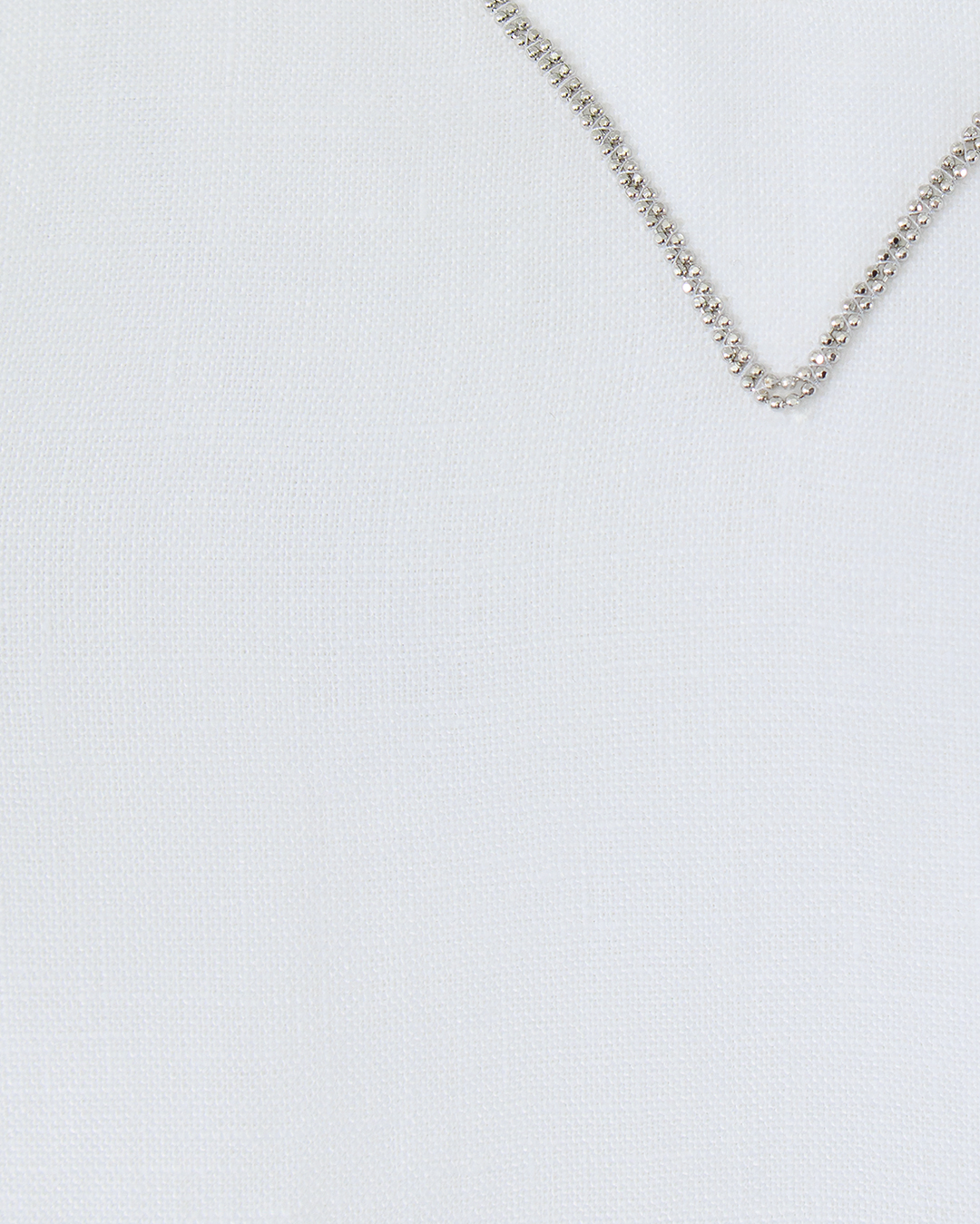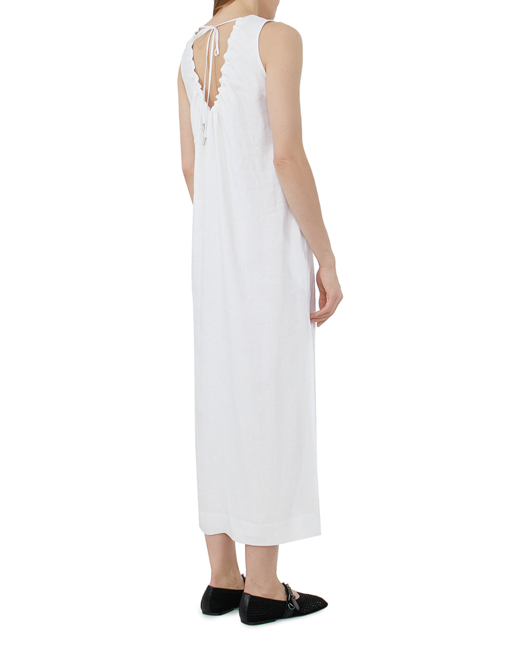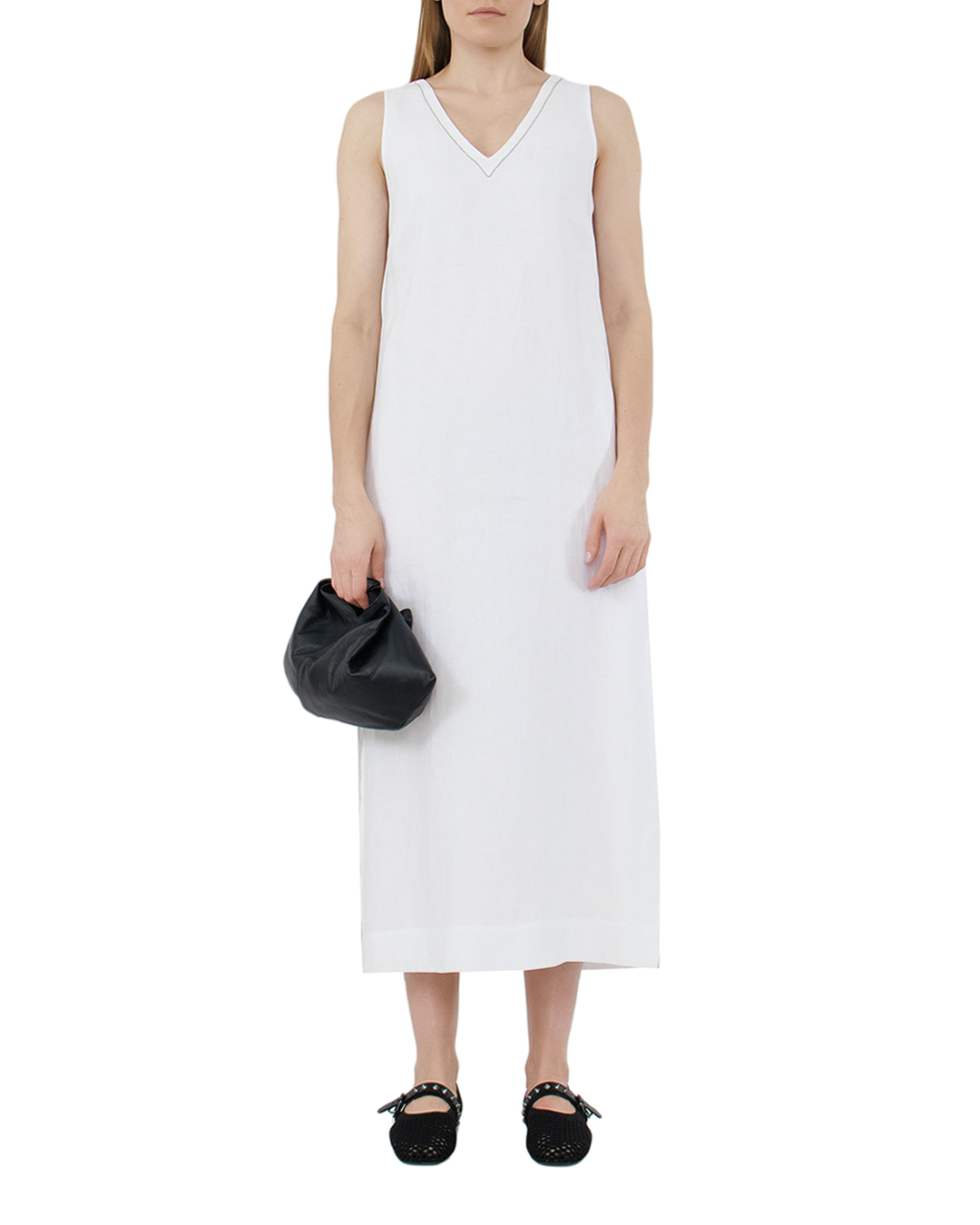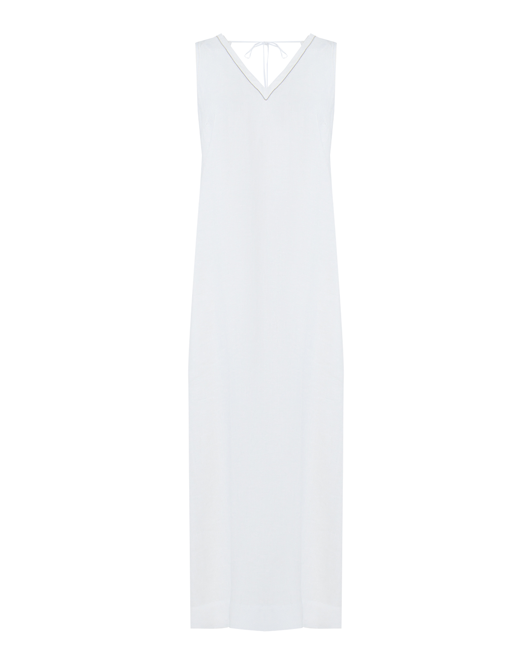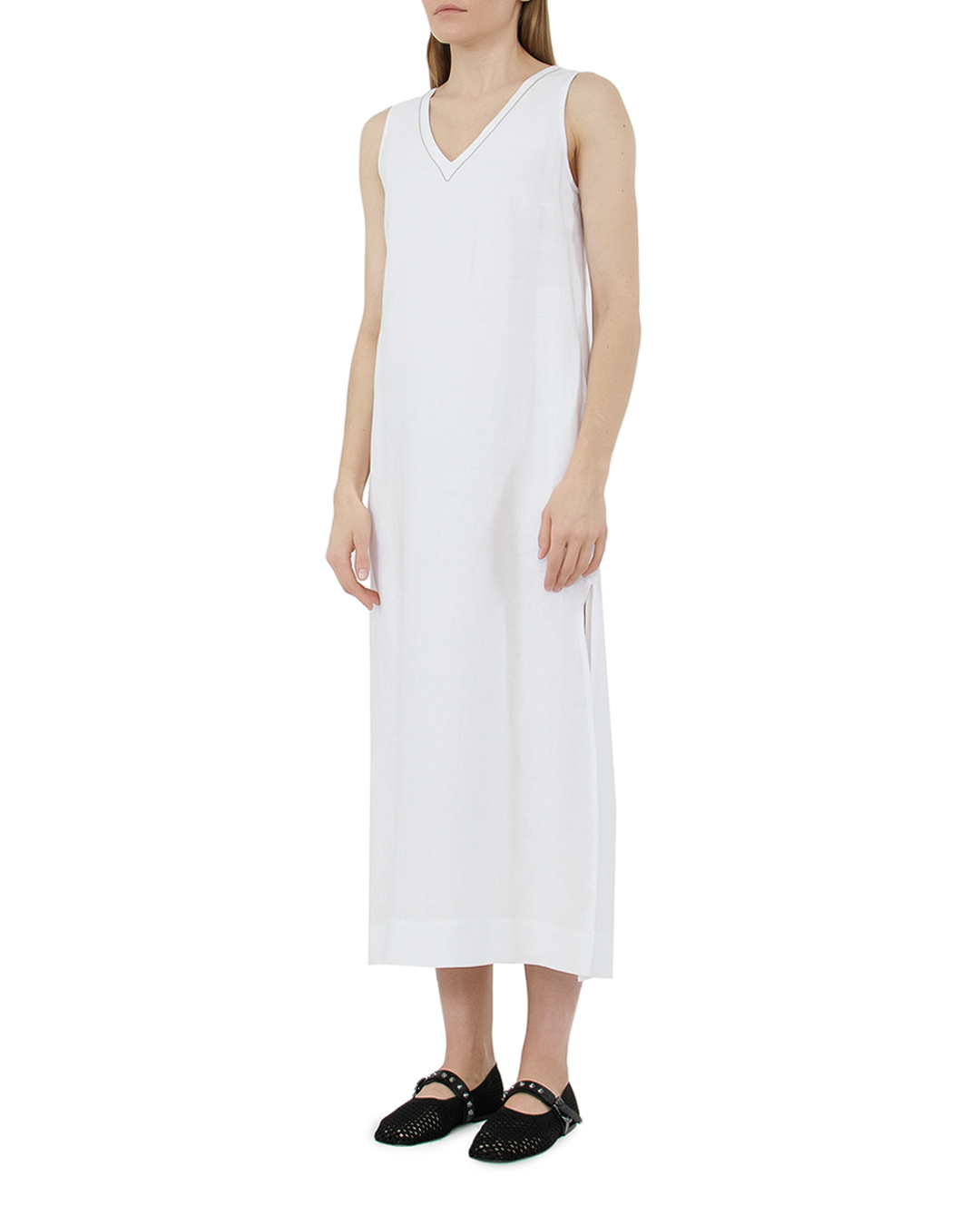 Платье длины миди без рукавов выполнено из 100% льна. V-образный вырез украшает изысканная деталь Punto Luce. Изделие дополняют высокие разрезы по бокам и застежка-завязка и каплевидная отделка. Это платье подойдет для самых разных случаев. Модель представляет собой идеальный синтез элегантности и комфорта.