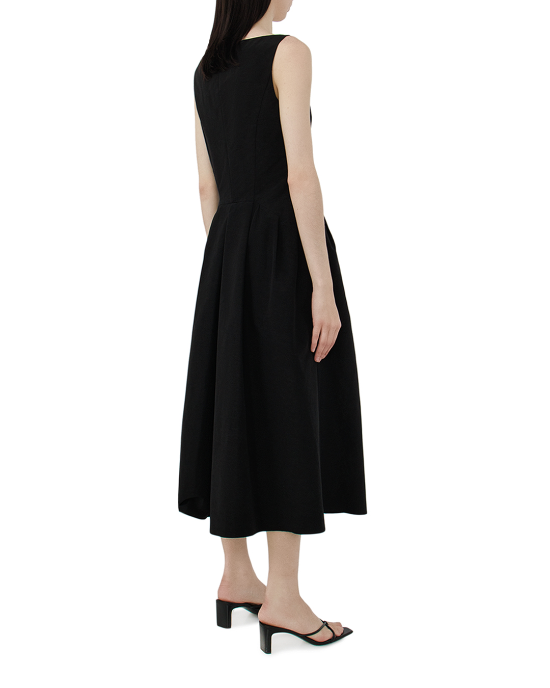 Это платье — образец классической элегантности и изысканности. Чёрный цвет придаёт ему универсальность и утонченность, делая его идеальным выбором для любых особых случаев. Грациозный вырез «лодочка» изящно подчёркивает линию плеч, добавляя женственности и создавая идеальную основу для украшений. Приталенный верх гармонично переходит в расклешённую юбку, создавая силуэт «песочные часы», который подчёркивает форму и обеспечивает свободу движений. Складки на юбке добавляют динамики и интересной текстурности, обеспечивая игру линий и материалов в движении. Чистые швы и аккуратная обработка деталей подчёркивают качество исполнения и внимание к деталям. Это платье универсально сочетается с разнообразными аксессуарами и обувью, предоставляя широкие возможности для создания как классического, так и более современного образа.