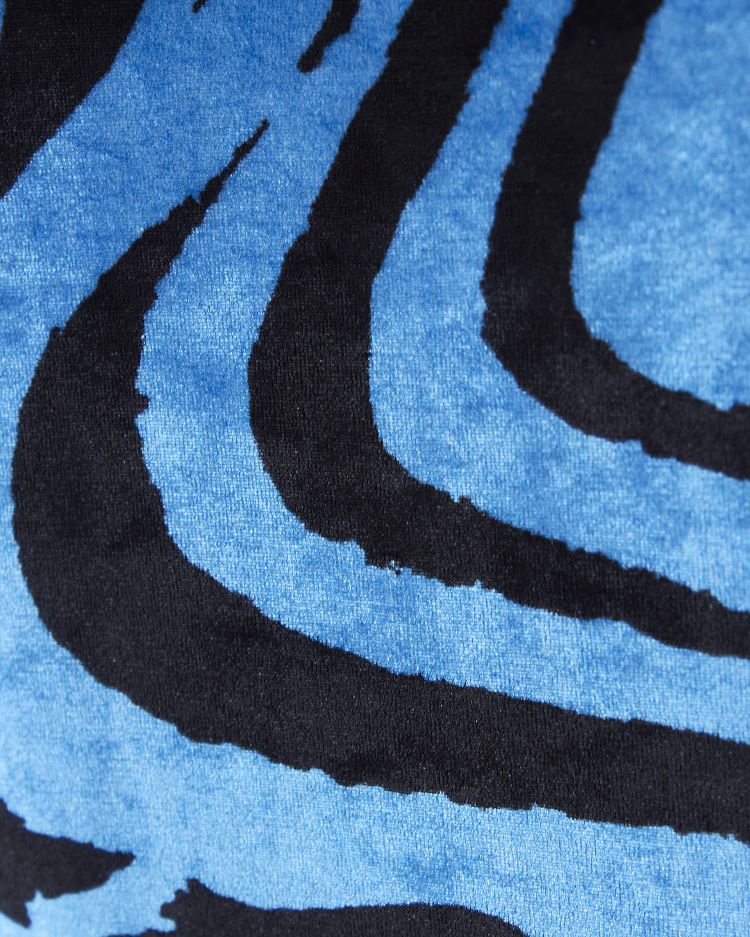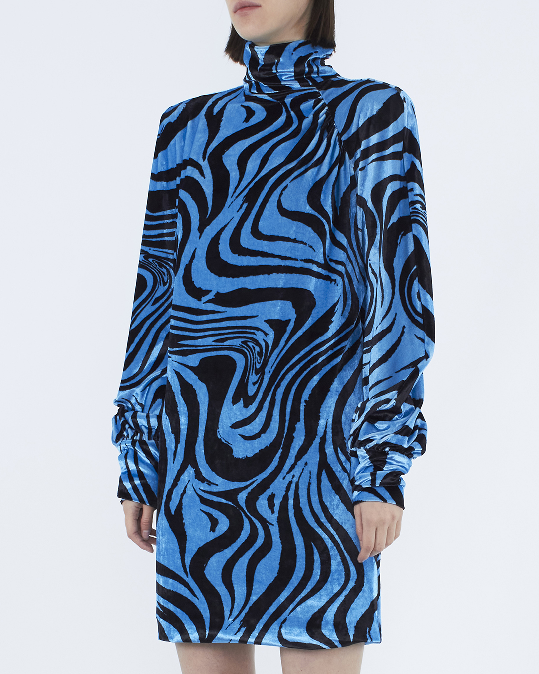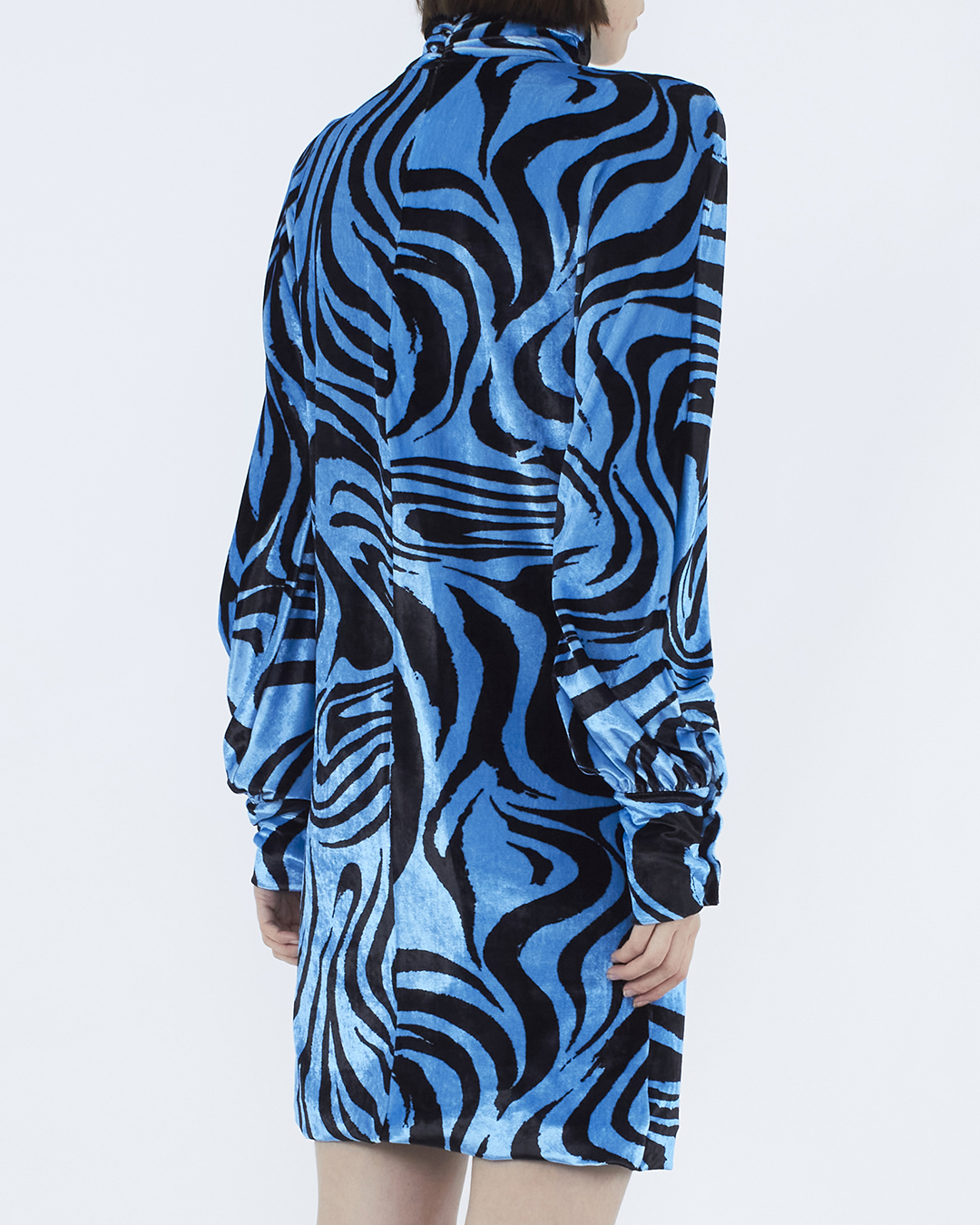Платье мини из эластичной вискозы голубого оттенка с анималистичным принтом. Модель полуприлегающего силуэта с высоким воротником.