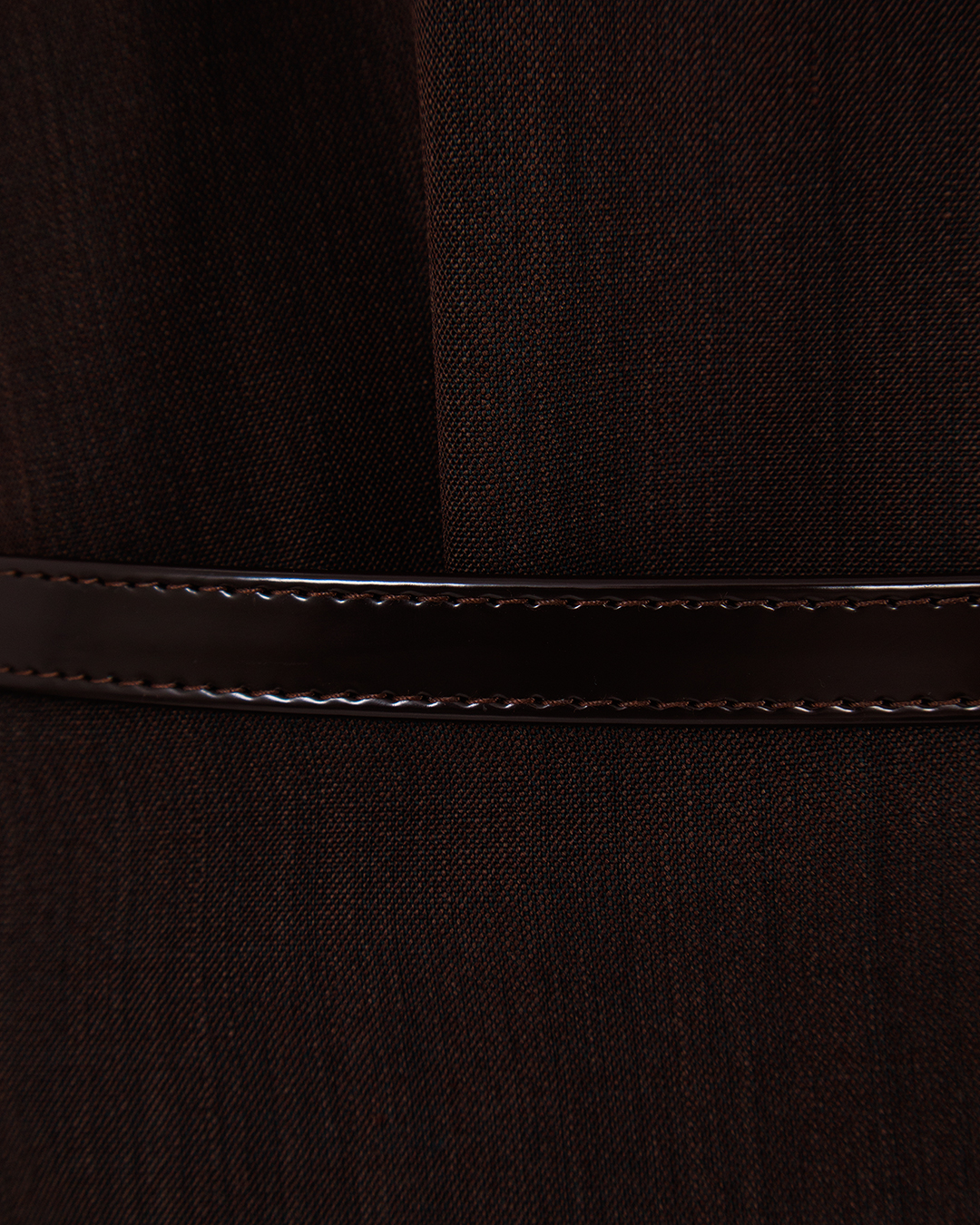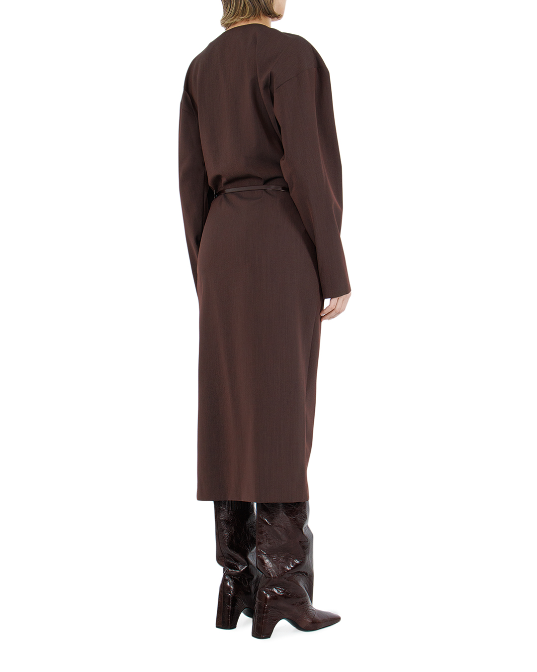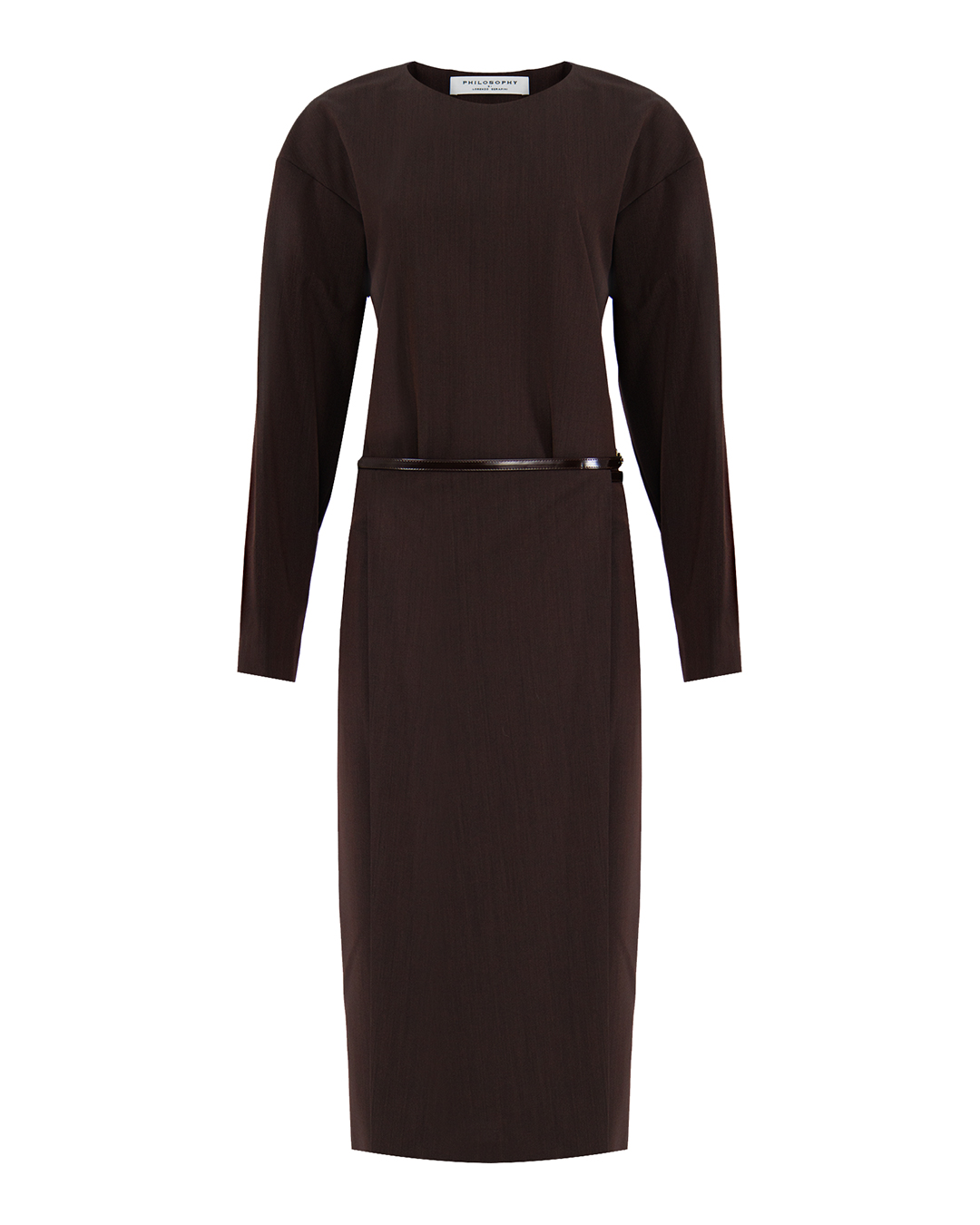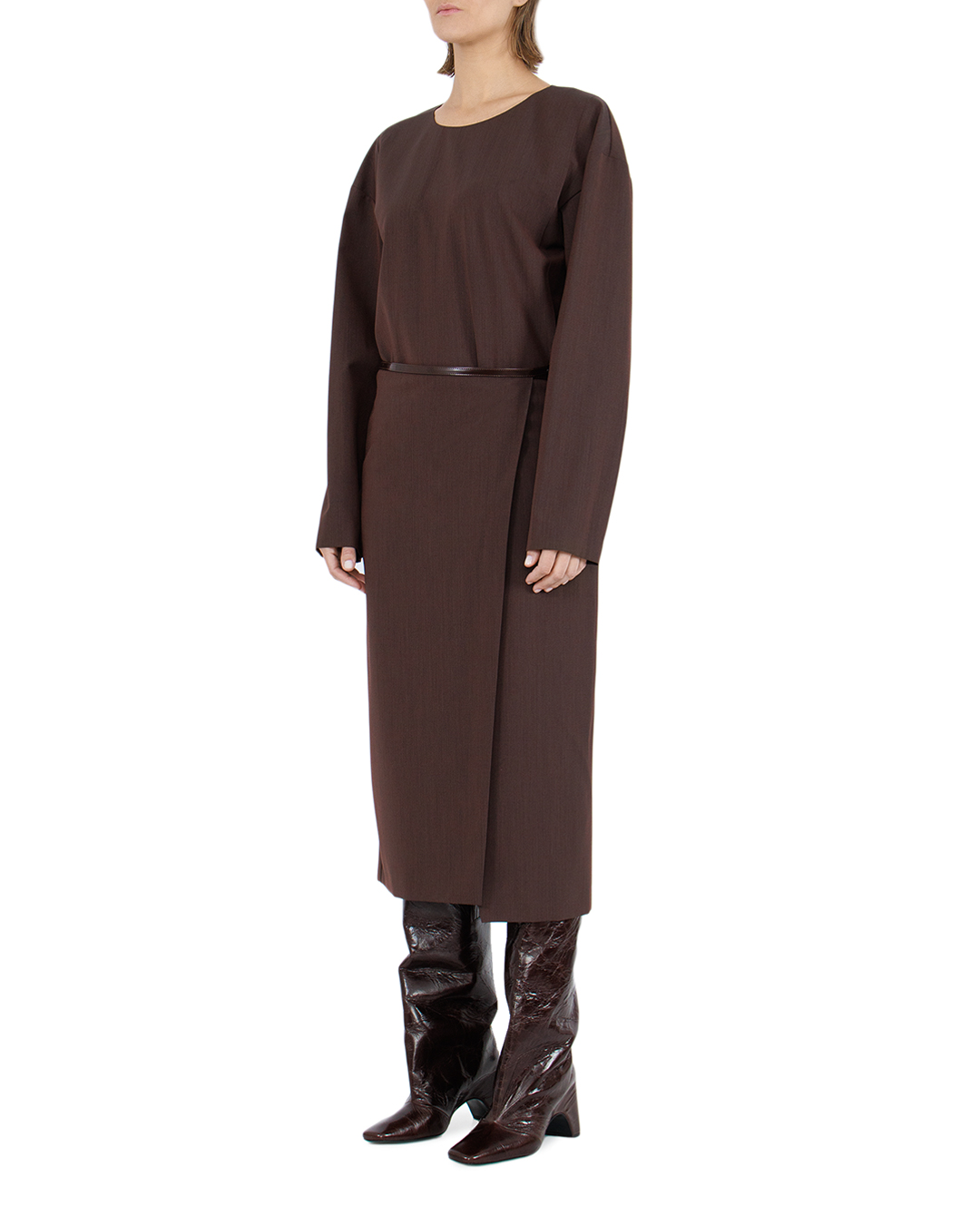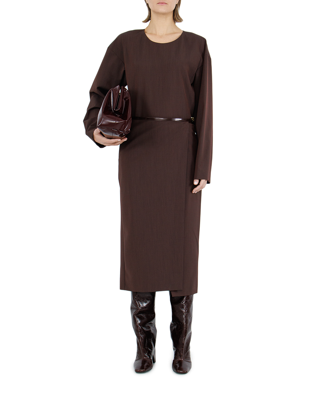 Платье прямого кроя с высоким разрезом на запах с тонким кожаным ремешком в комплекте. Модель с круглым вырезом и объемными рукавами. Платье прекрасно сочетается с ботинками или сапогами на каблуке.