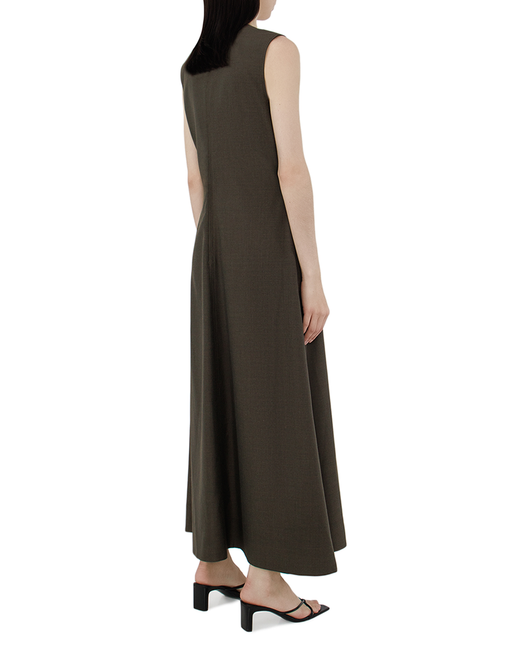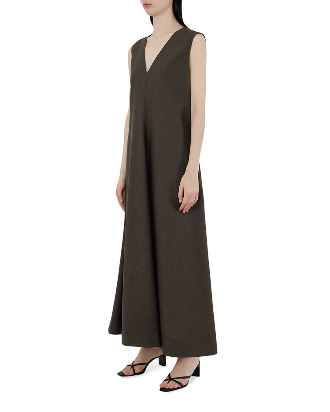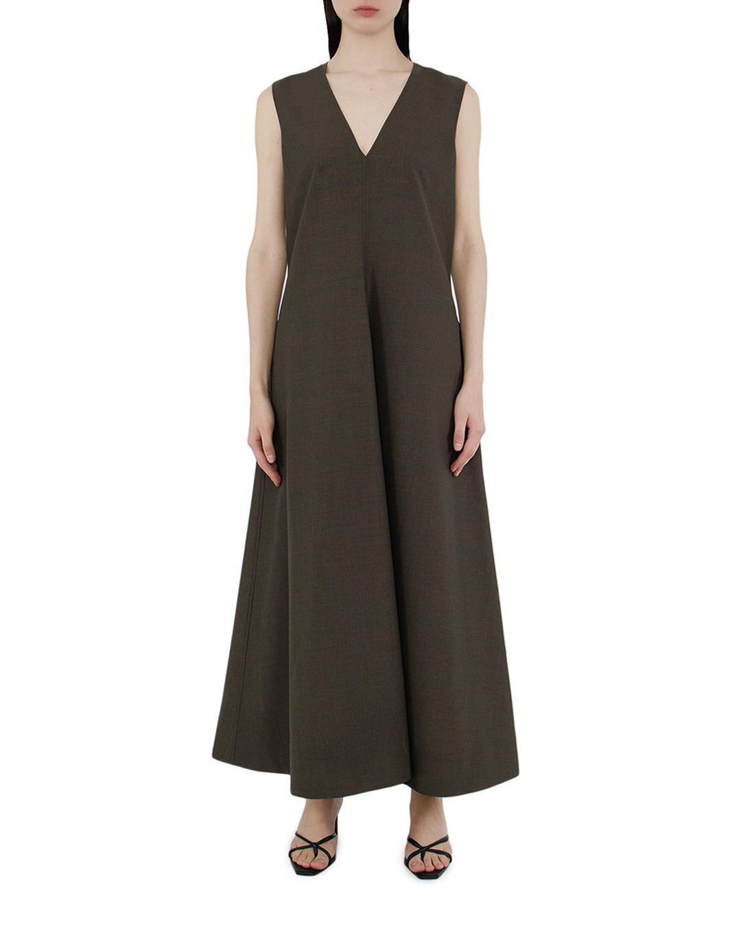 Это платье олицетворяет минималистскую элегантность и совершенные линии, созданные для современной женщины. Изделие выполнено из плотной ткани глубокого, насыщенного оттенка, который придаёт образу строгость и уверенность. Лаконичный V-образный вырез с мягко изогнутыми краями создаёт изысканный акцент в зоне декольте, подчёркивая шею и ключицы. Безрукавный фасон добавляет наряду легкости и делает его идеальным решением для многослойных образов. Платье имеет прямой крой, плавно расширяющийся книзу, что обеспечивает как свободу движений, так и строгий силуэт. Горизонтальные линии боковых швов с разрезами придают модели динамику и современный шарм. Скрытая застежка молния на спине дополняет функциональность изделия, сохраняя при этом его лаконичный и аккуратный внешний вид. Этот наряд идеален для любителей сдержанности и интеллигентного стиля, акцентируя индивидуальность без лишних деталей. Сочетание элегантности и простоты делает его универсальным элементом гардероба, подходящим для различных событий.