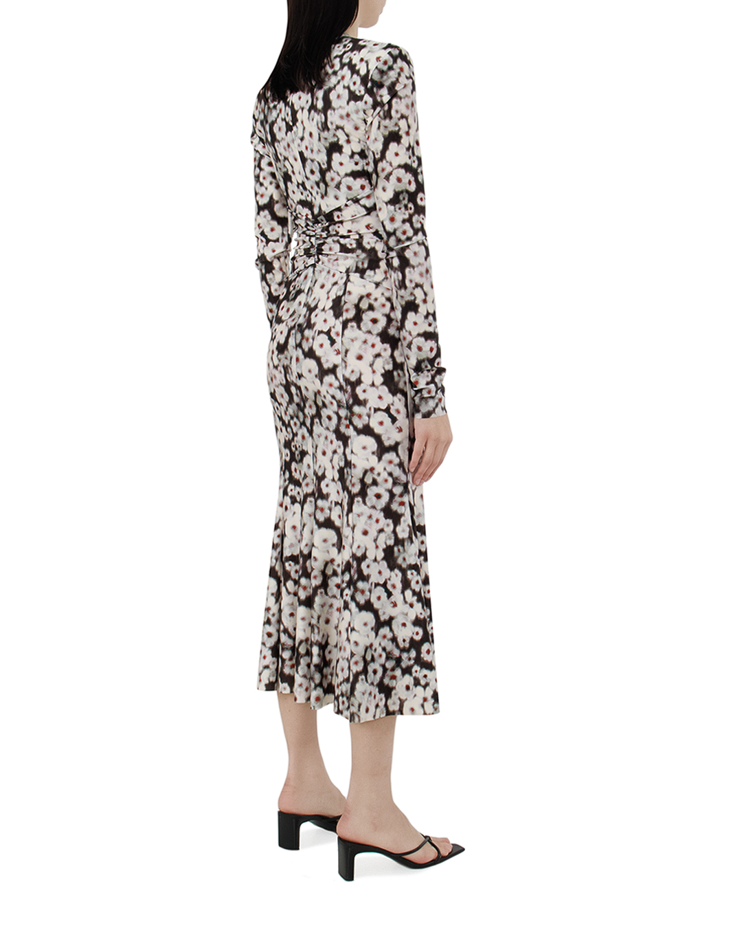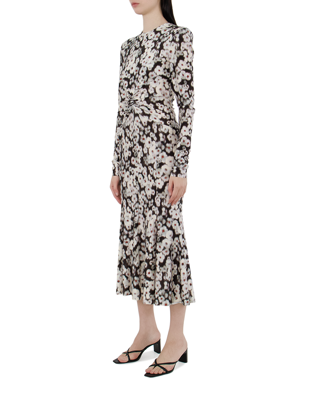 Это платье воплощает в себе утонченную грацию и современный шик, создавая образ, который неизменно привлечет внимание. Изготовленное из легкой струящейся ткани с абстрактным цветочным принтом, оно предлагает как визуальное, так и тактильное наслаждение. Платье обладает округлым вырезом, который создаёт сдержанно-элегантную линию, плавно подчеркивающую ключицы. Длинные рукава придают образу завершенности и утонченности, идеально подходя как для прохладных вечеров, так и для дневных встреч. Особое внимание привлекает драпировка в области талии, мастерски исполненная с помощью изящных складок. Это решение не только акцентирует внимание на тонкой линии талии, но и добавляет динамичности всему наряду. А-силуэт плавно расширяется к подолу, обеспечивая свободу движений и изящество. Цветочный узор, напоминающий размытую акварель, придает платью загадочности и лёгкости. Завершают образ безупречно выполненные подгибы и скрытая застежка молния, добавляющие функциональности и комфорта. Это платье идеально для тех, кто ценит стиль и стремится всегда оставаться в центре внимания.