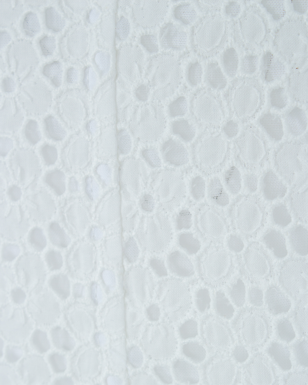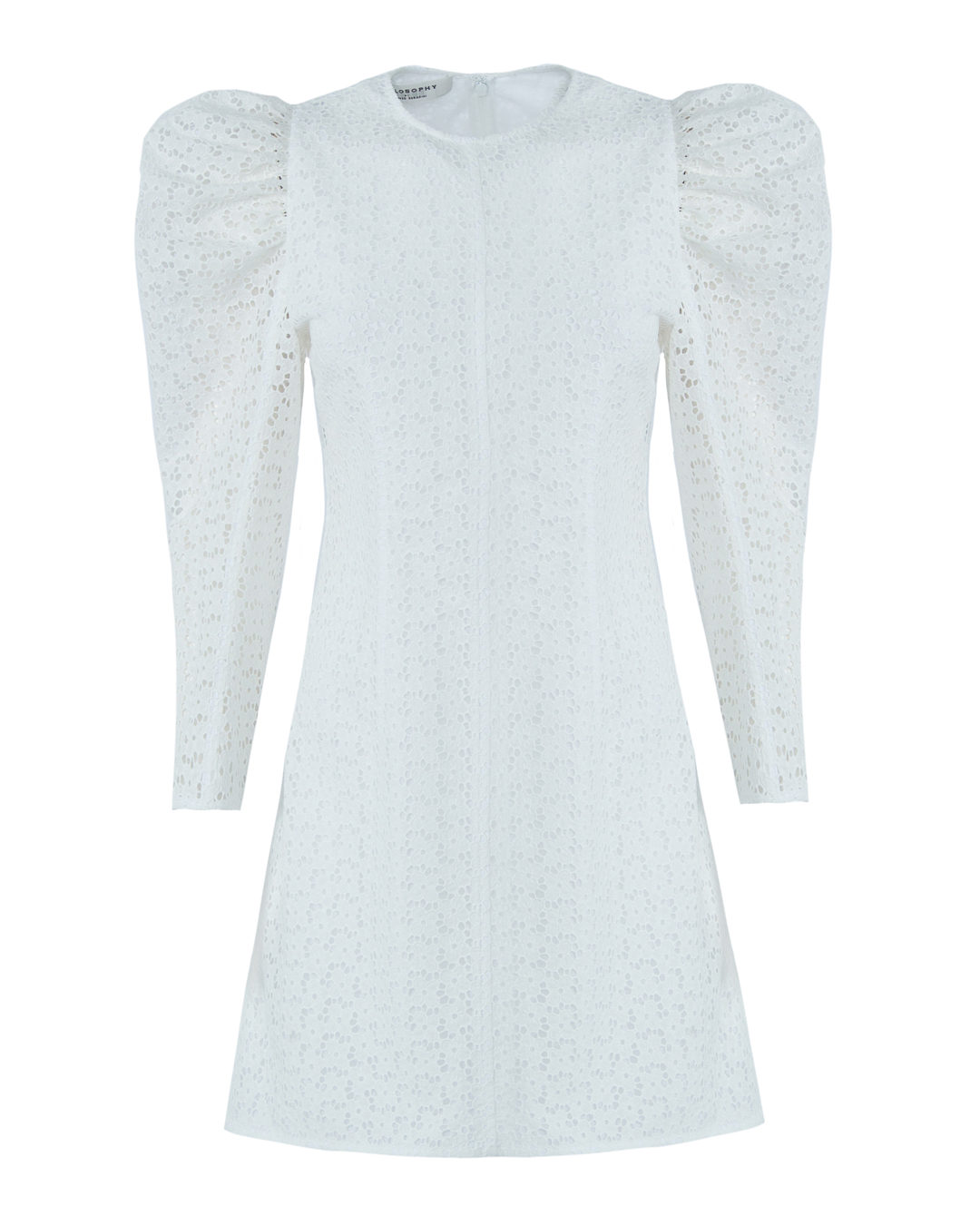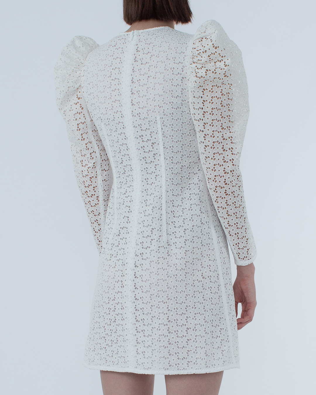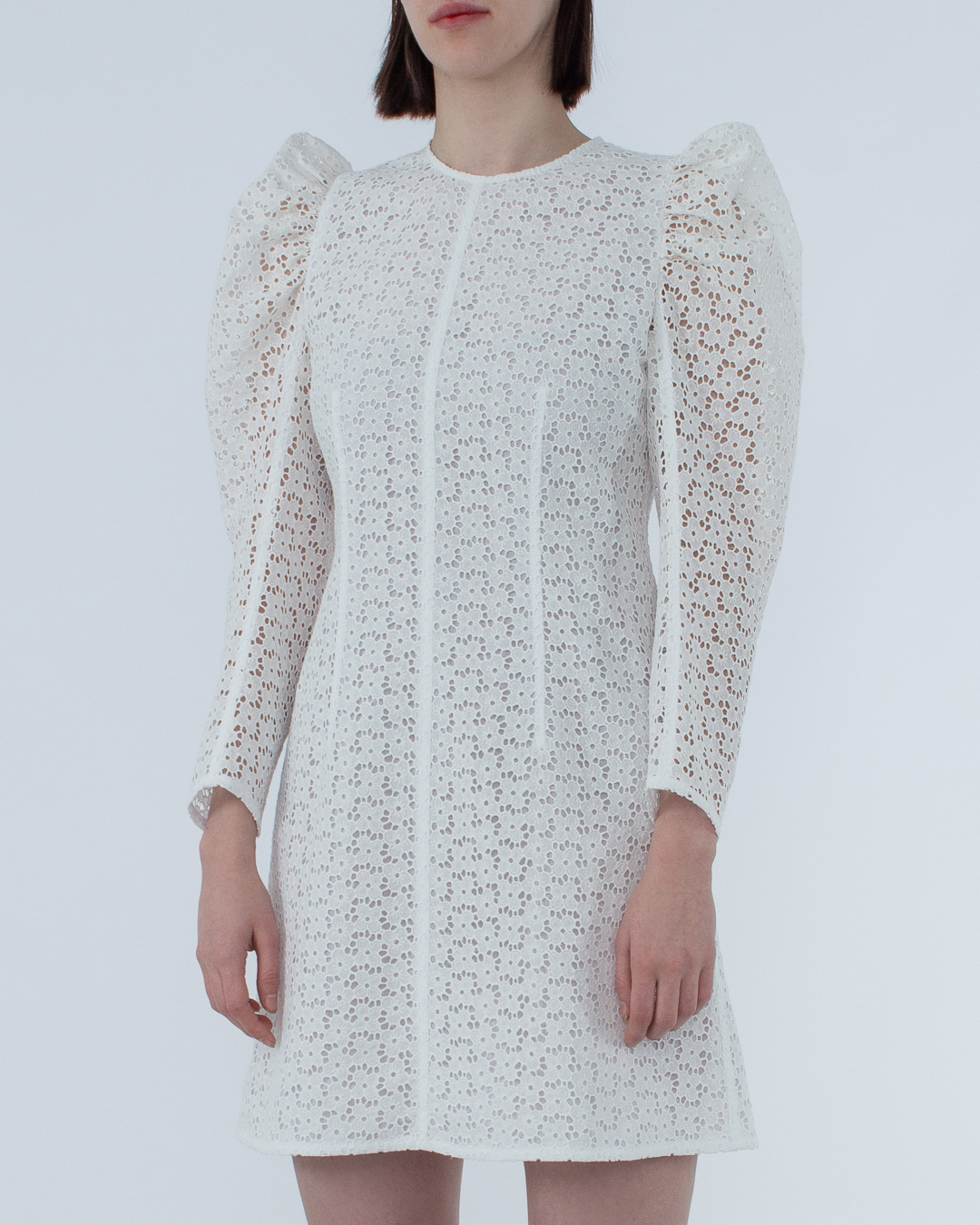 Платье PHILOSOPHY DI LORENZO SERAFINI сшили из ажурного шитья белого цвета. Приталенное изделие длины мини выполнено с застежкой на спине на молнию и дополнено объемными рукавами.