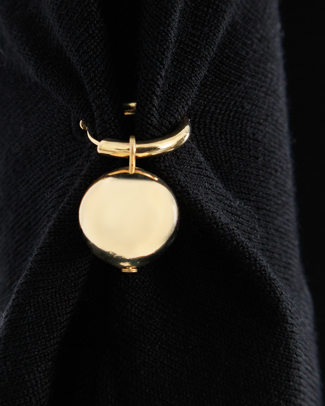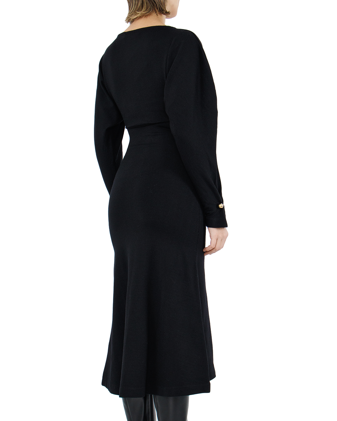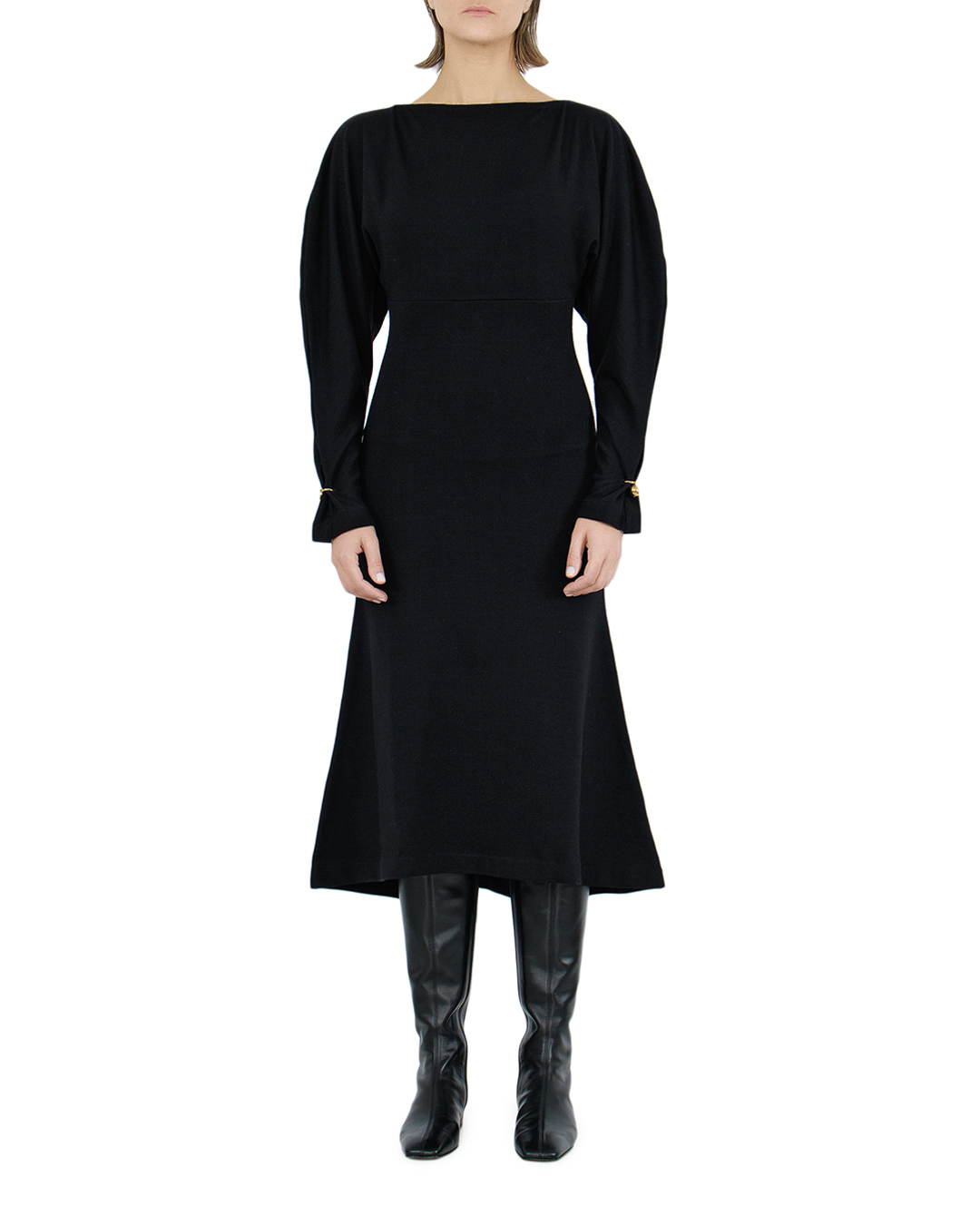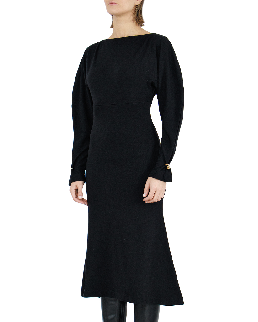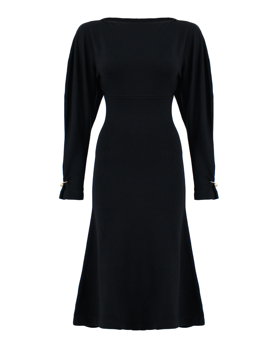 Приталенное лаконичное платье с прямым вырезом и расклешенным подолом выполнили из гладкого полушерстяного трикотажа. Объемные длинные рукава украшены на манжетах золотистыми зажимами.