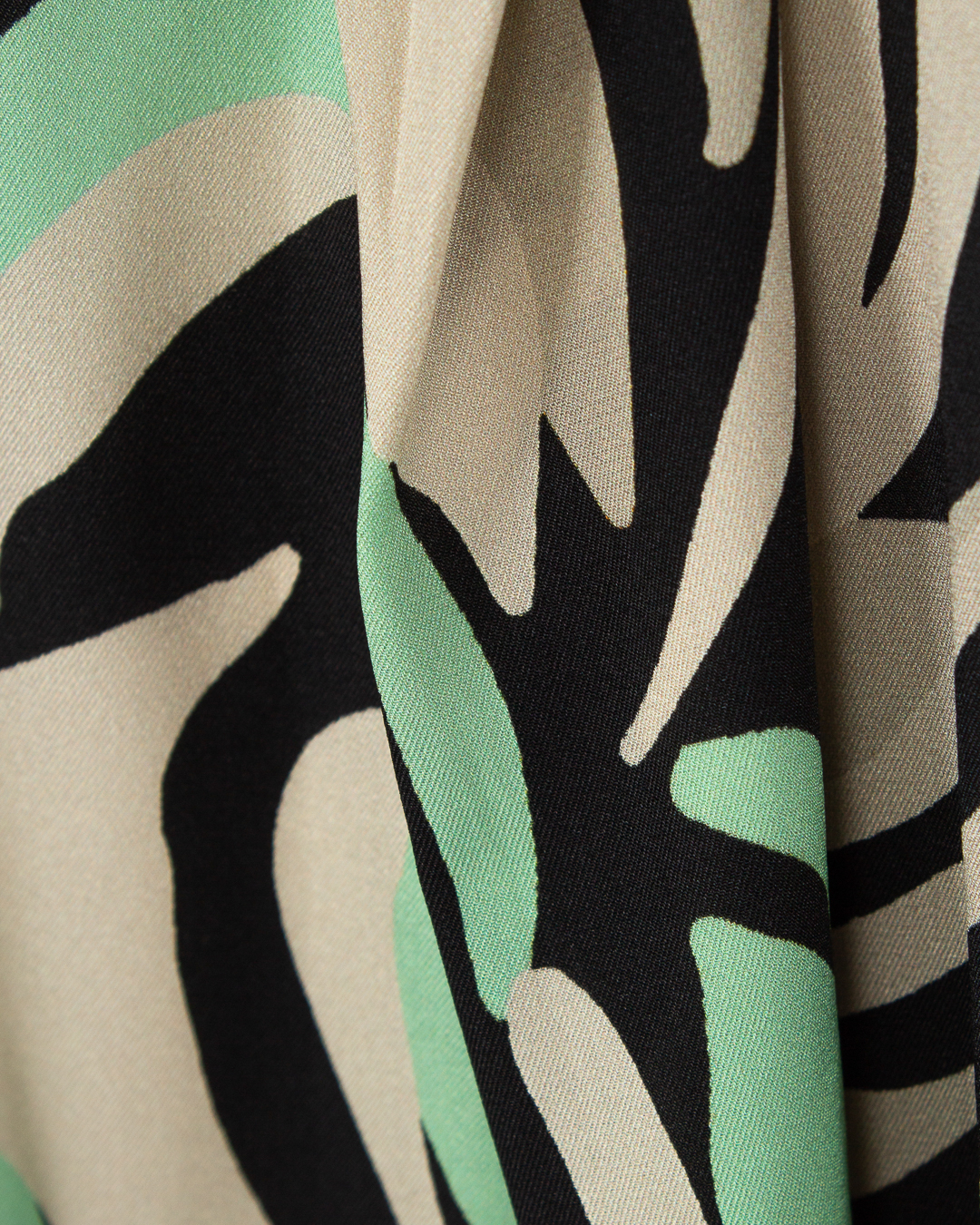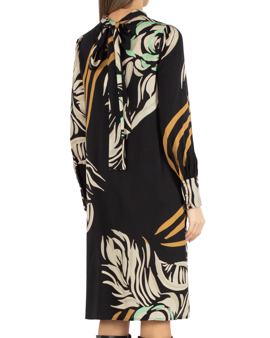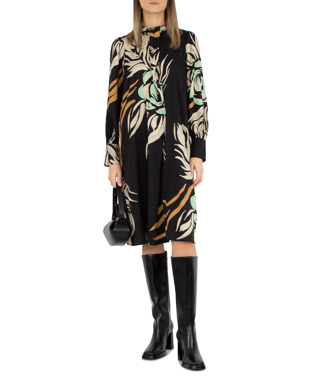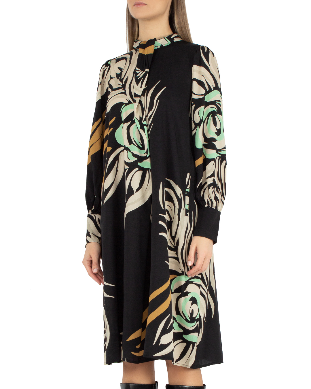 Это платье — гармония смелого дизайна и утонченного стиля, созданное для выразительных и запоминающихся образов. Глубокий черный фон сочетается с эффектным абстрактным принтом в мягких пастельных и землистых тонах, формируя живописное произведение искусства. Свободный крой обеспечивает идеальный баланс между комфортом и элегантностью, подчеркивая женственные линии и создавая воздушный силуэт. Легкость ткани добавляет динамики и изящества, позволяя материалу плавно драпироваться вокруг фигуры. Высокий воротник-стойка с аккуратной драпировкой добавляет платью винтажного шарма, акцентируя внимание на линии шеи. Длинные рукава с манжетами создают изысканные линии, подчеркивая изящество и утонченность. Качественная отделка идет рука об руку с искусным кроем, гарантируя безупречную посадку. Это платье станет уникальным дополнением к вашему гардеробу, позволяя без труда сочетать уверенность и изящность.