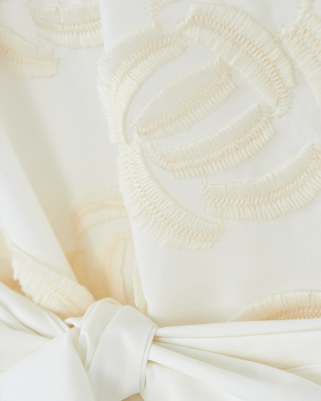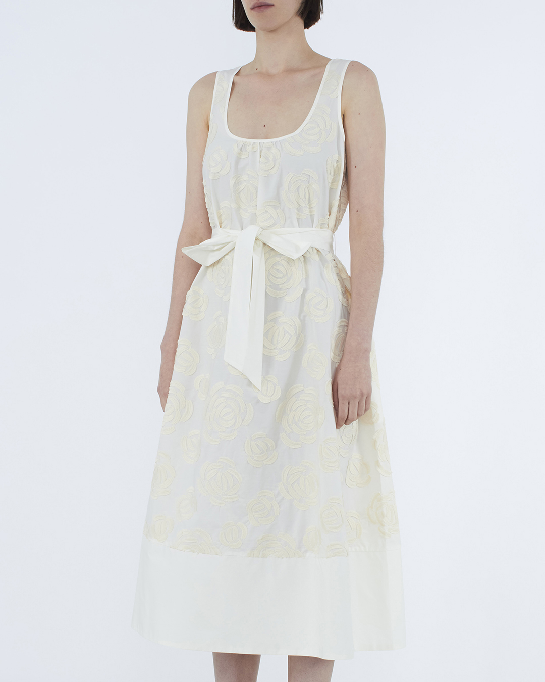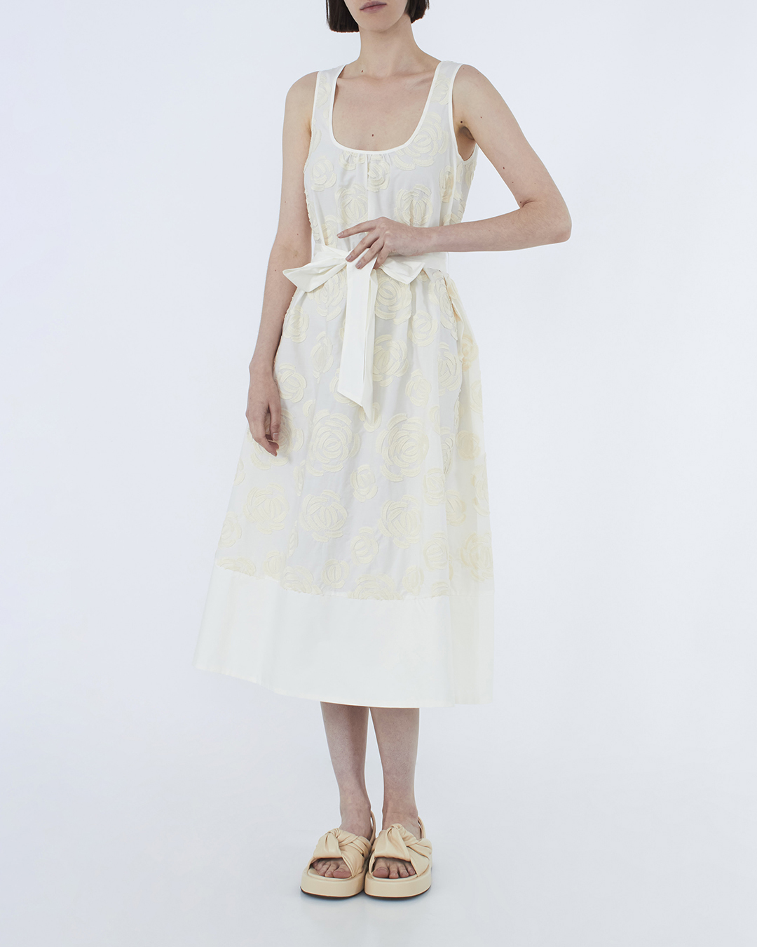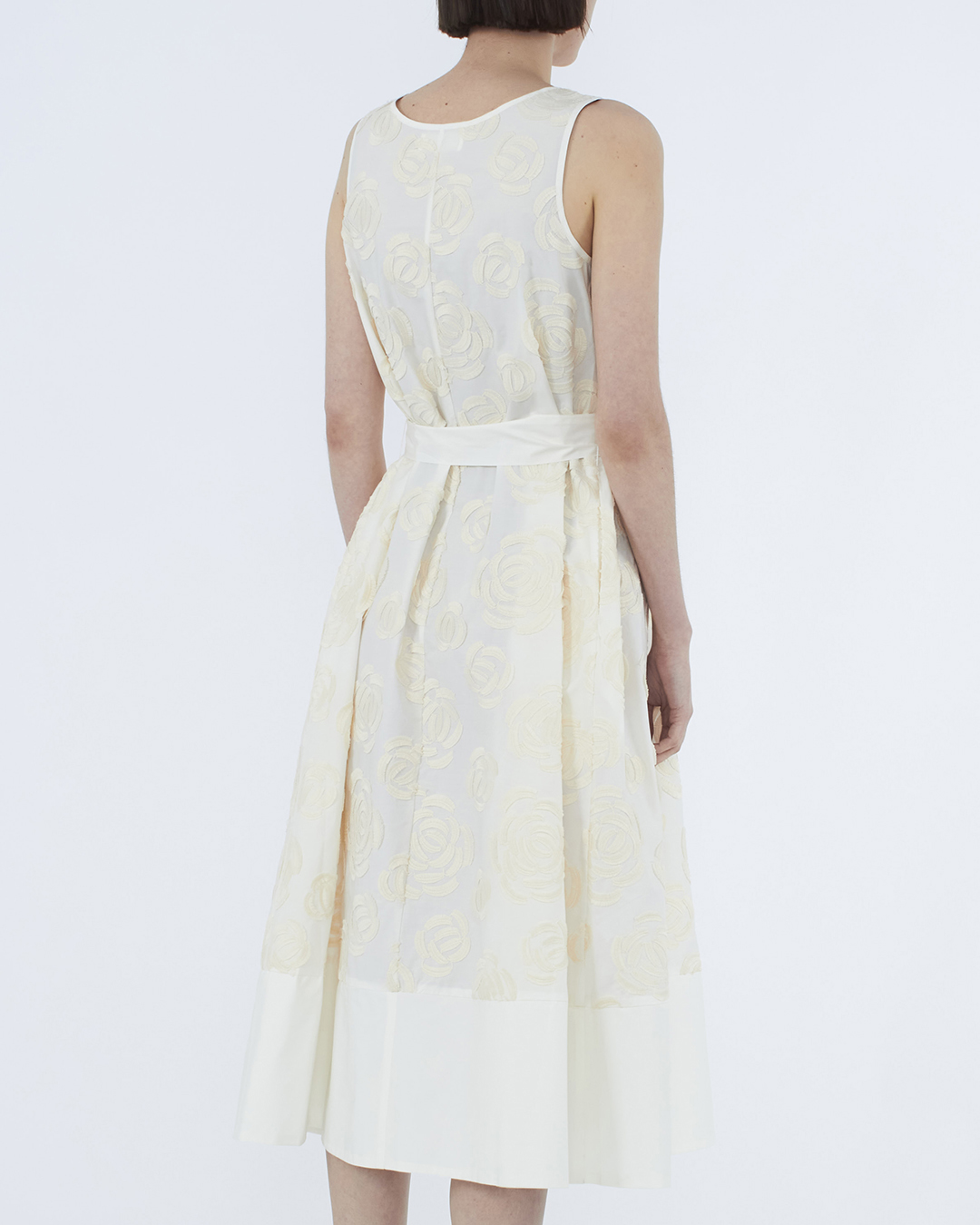 Платье PSOPHIA сшито из хлопка молочного оттенка с вышивкой. Модель приталенного силуэта длиной ниже колена дополнена круглой линией выреза и поясом из основного материала.
