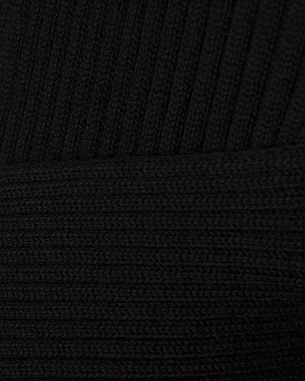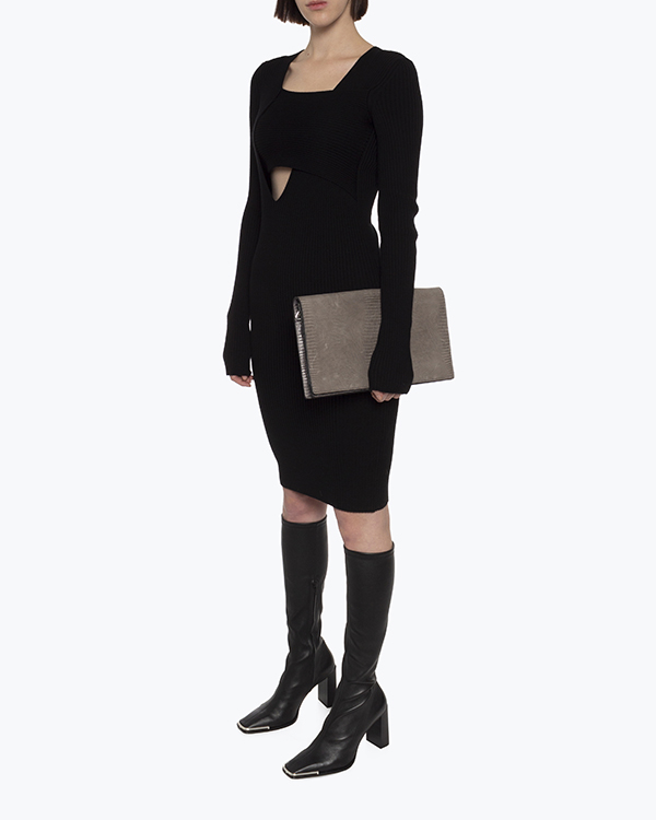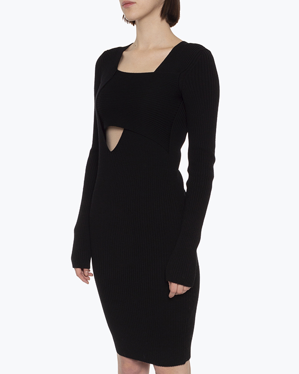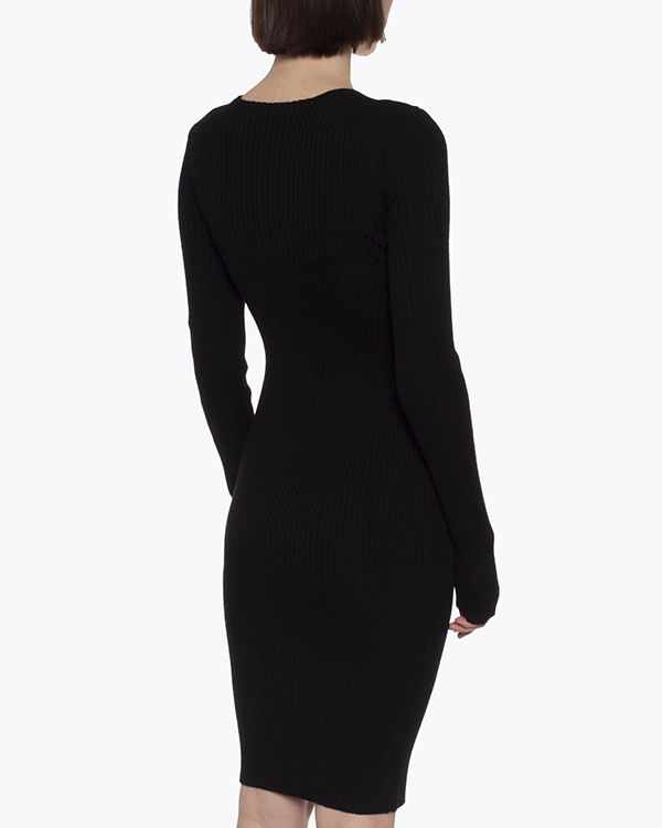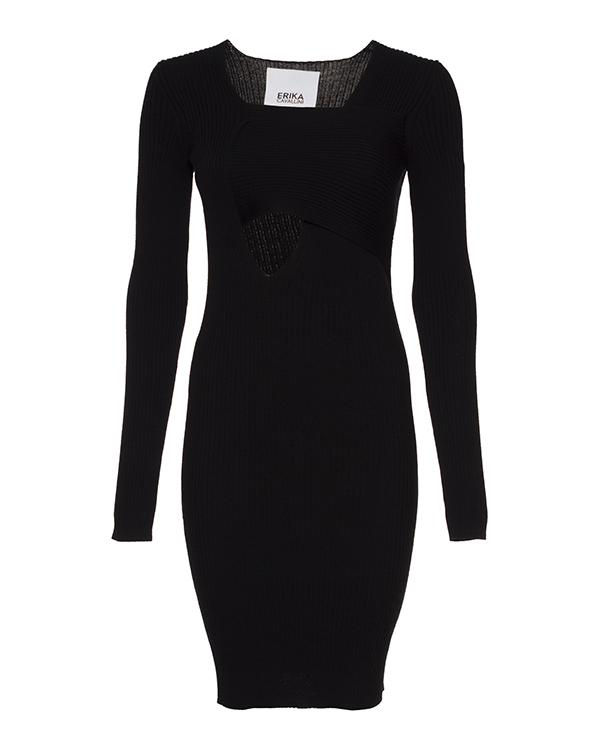Платье Erika Cavallini дизайнеры марки выполнили из мягкой трикотажной шерсти черного цвета в рубчик. Облегающее изделие с длинными рукавами дополнили топом из основного материала, чтобы смягчить глубокий вырез.