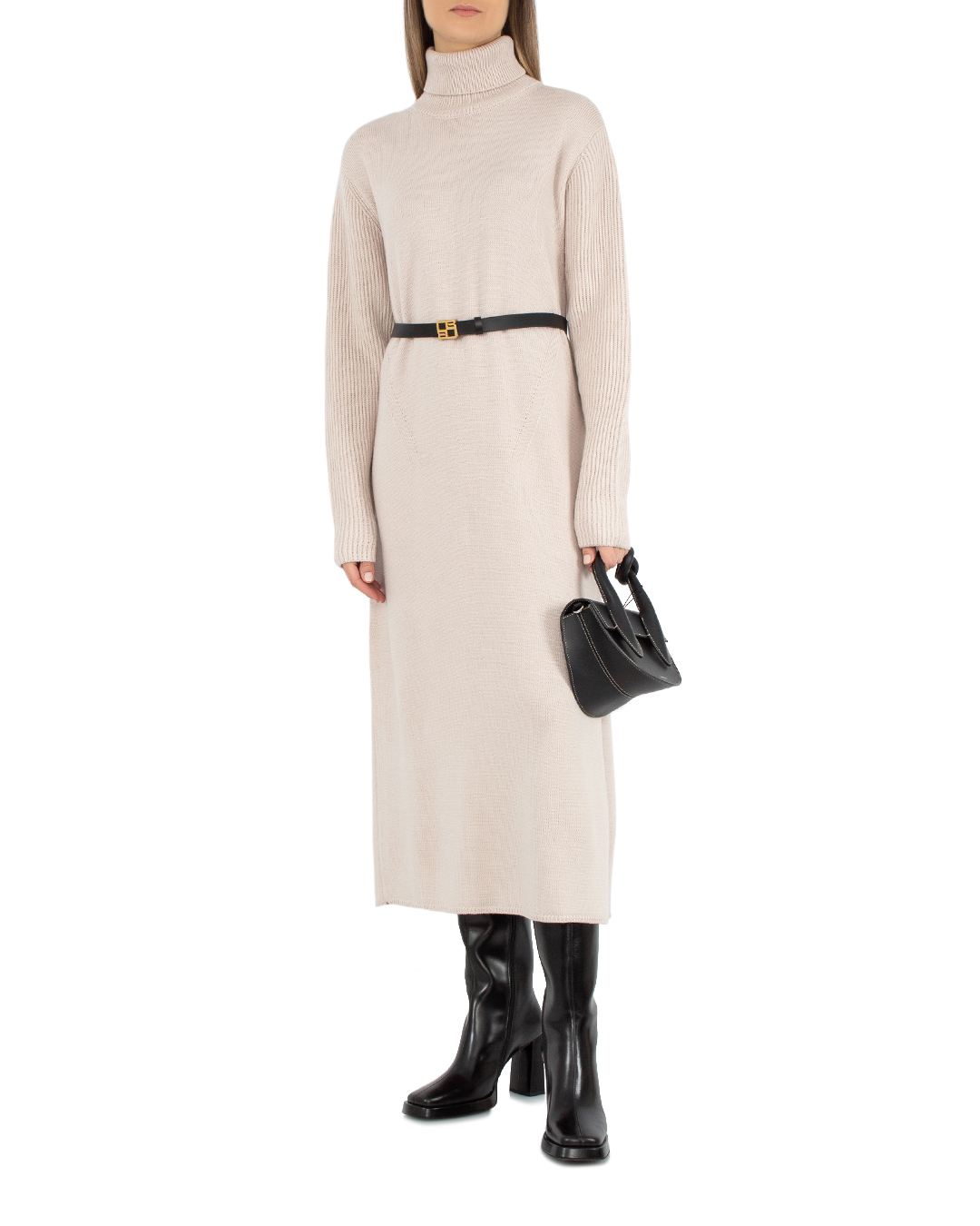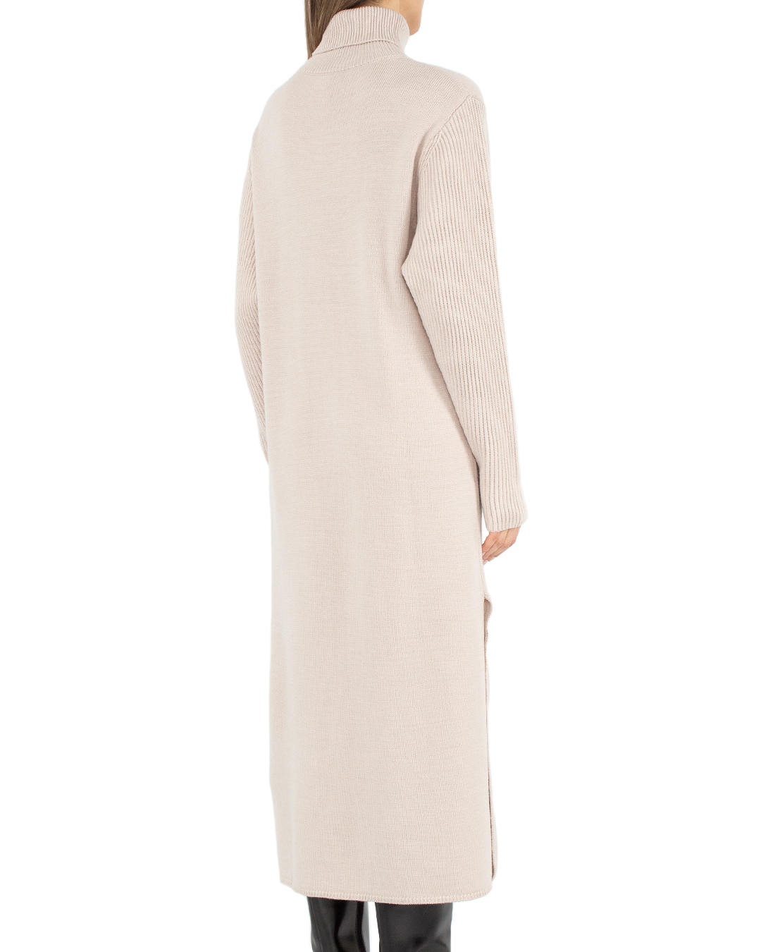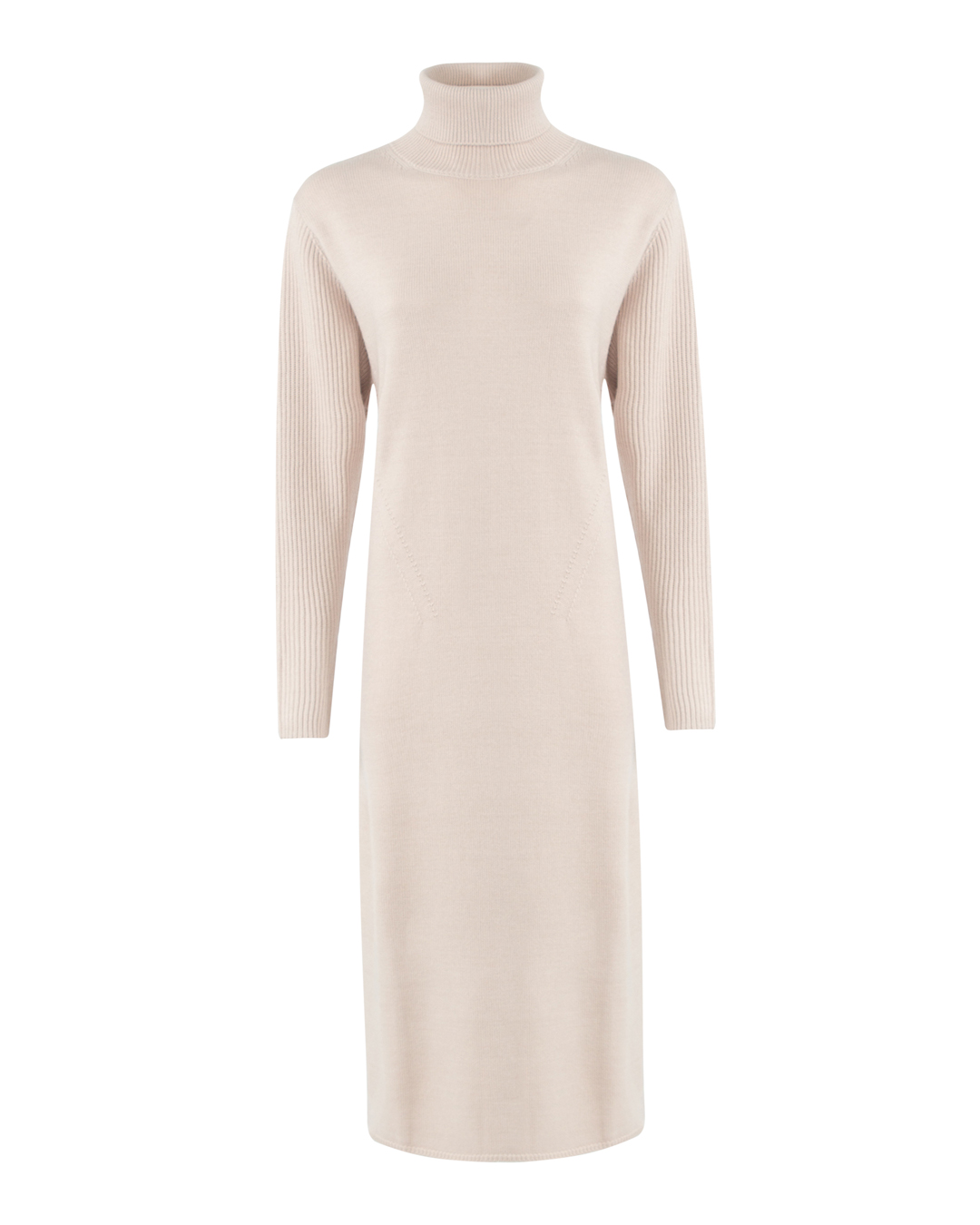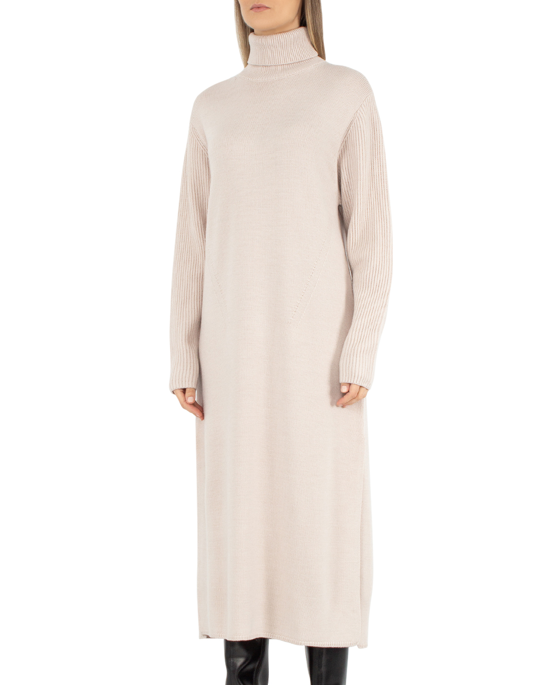 Базовое платье Sfizio из мягкой вязаной шерсти бежевого оттенка. Модель длины миди с длинными рукавами и высоким воротом.