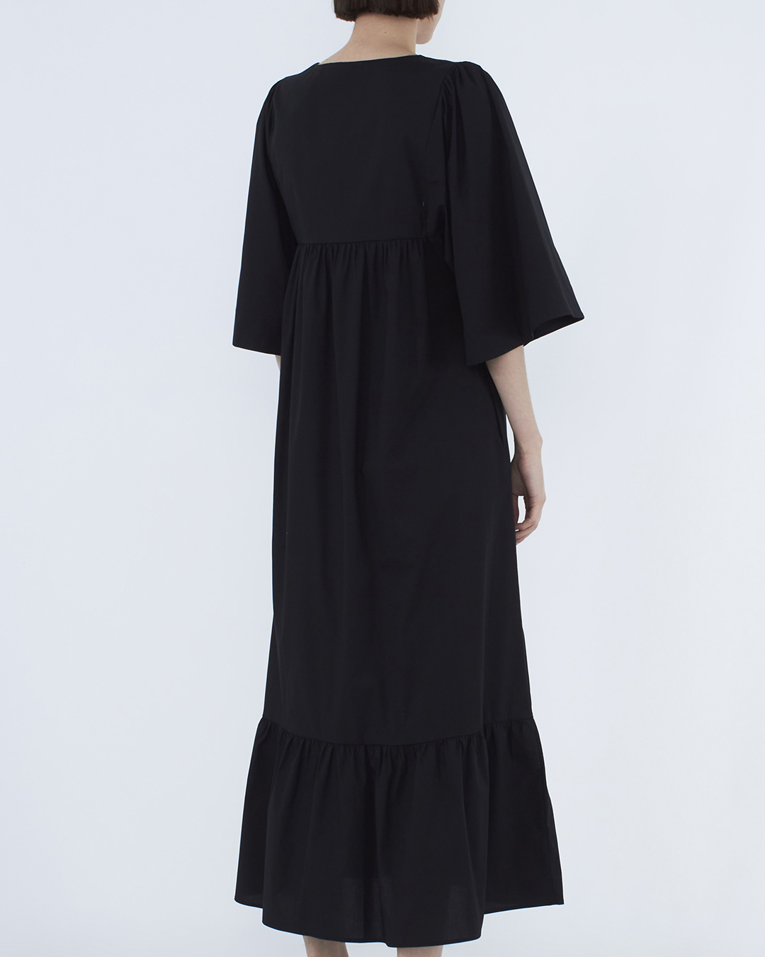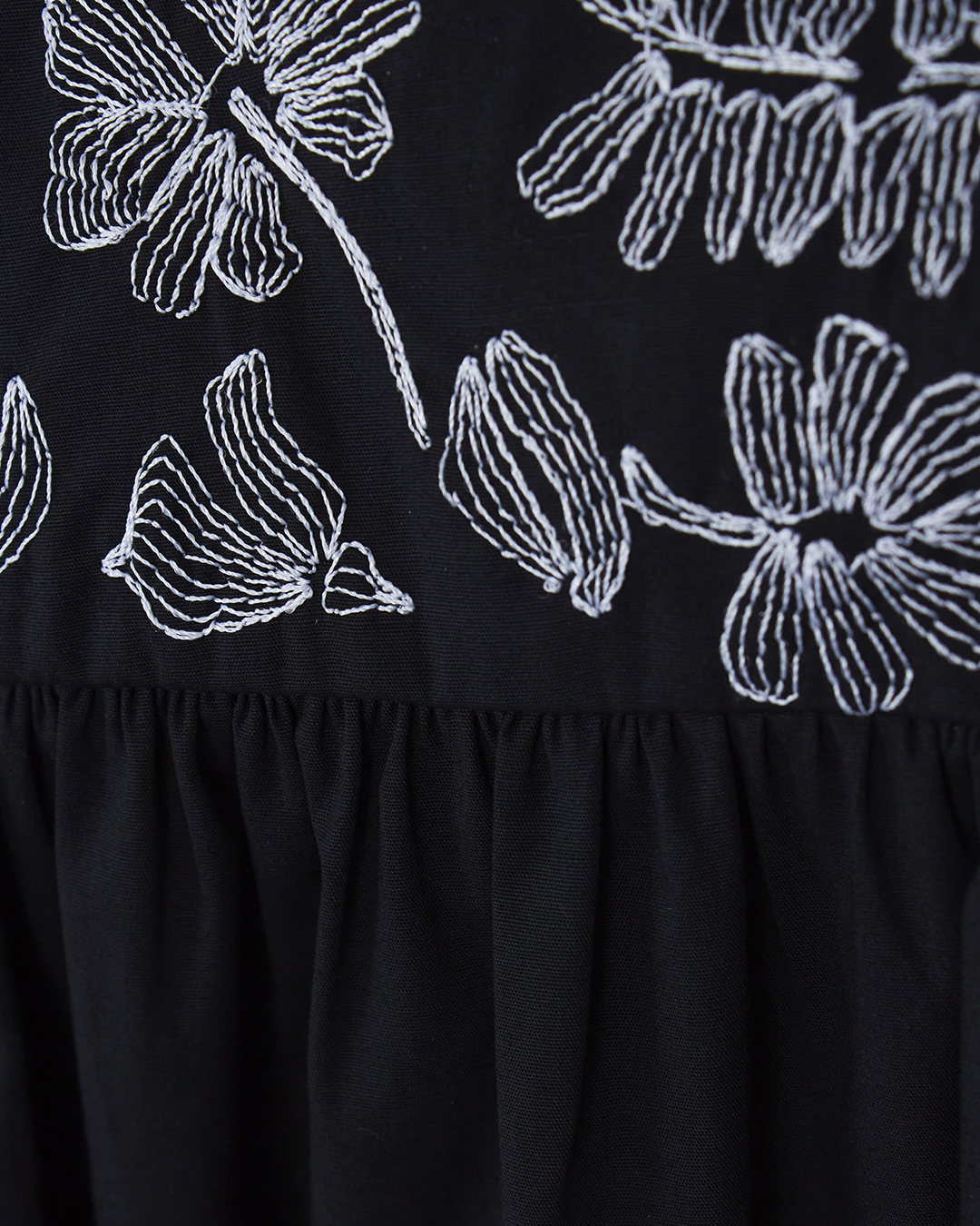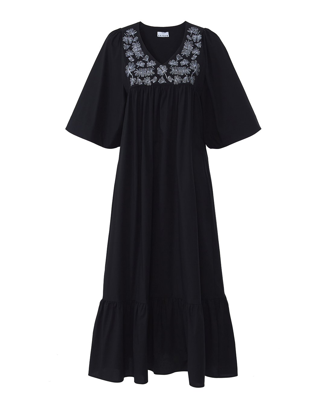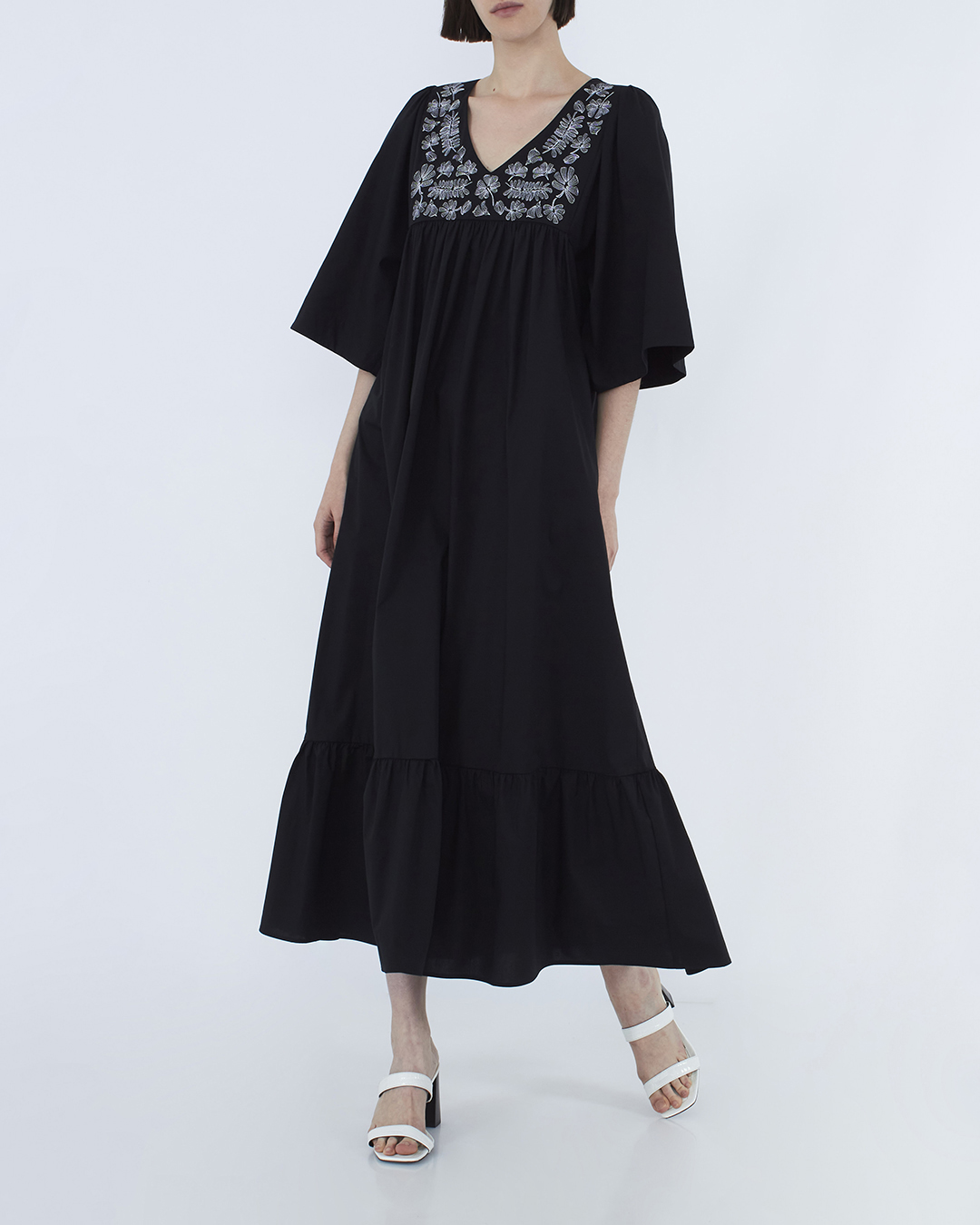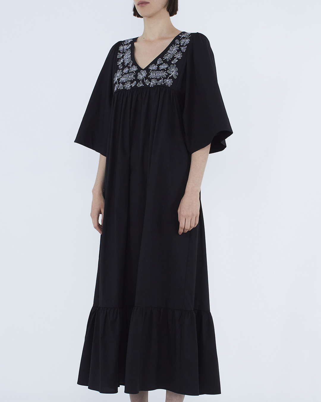 Платье Sfizio из новой коллекции сезона весна-лето SS’22 сшито из хлопка черного цвета с вышивкой на контрасте. Модель А-образного силуэта с широкими укороченными рукавами.