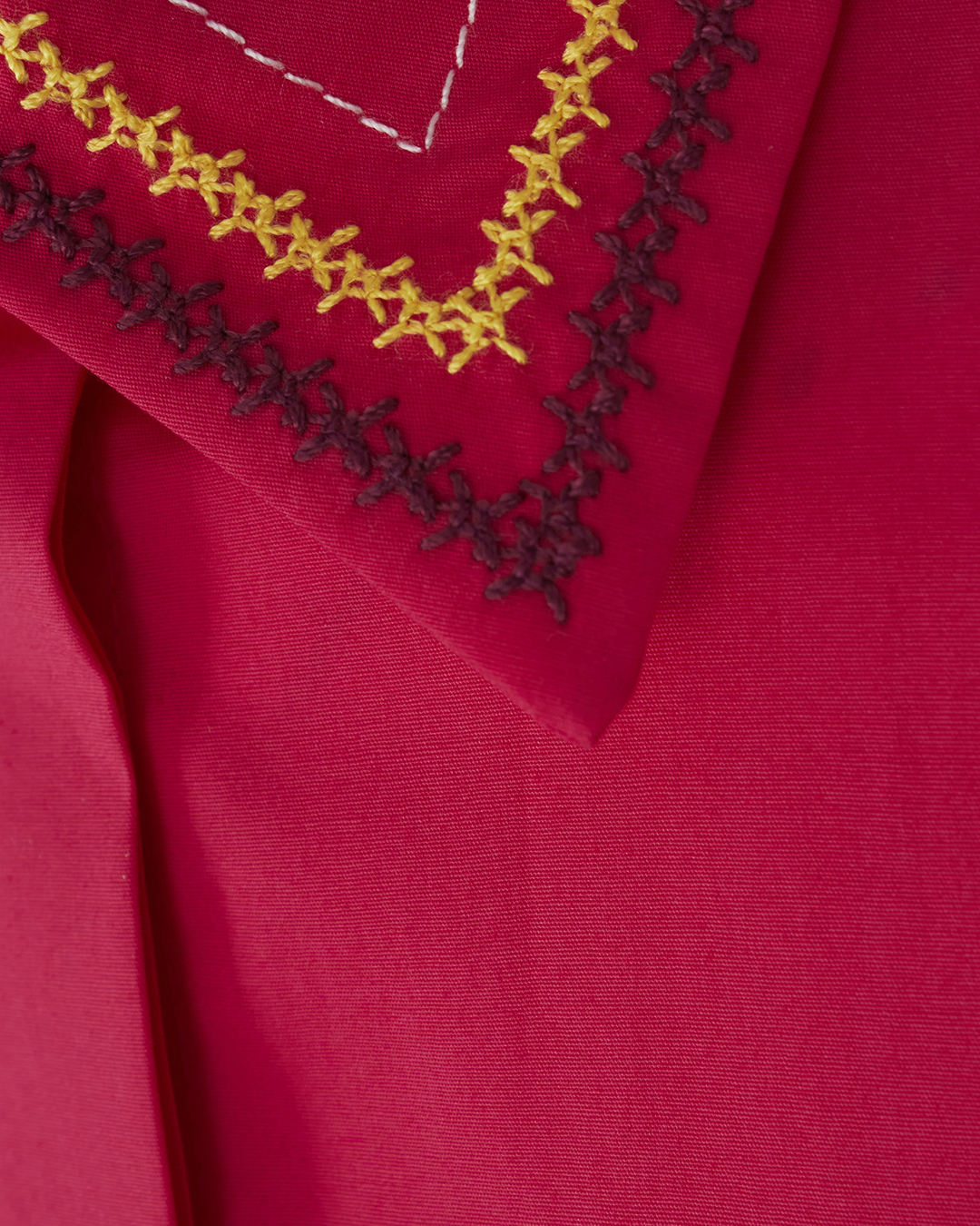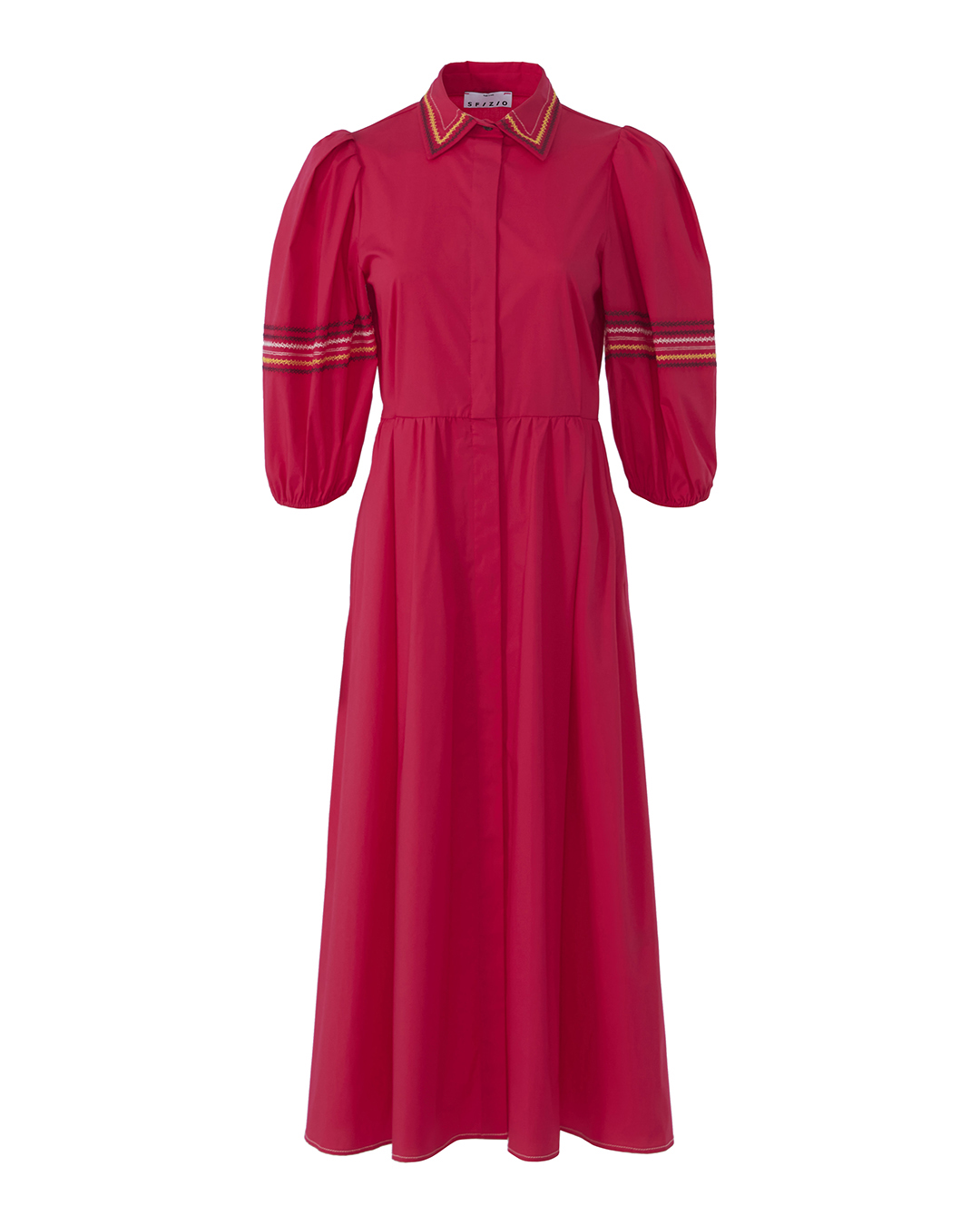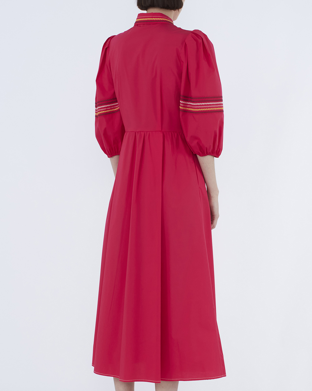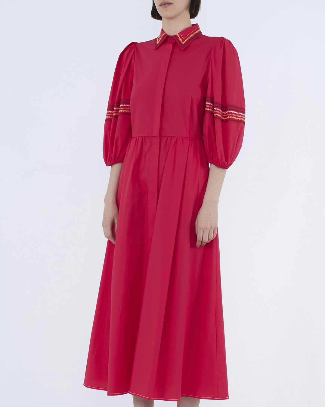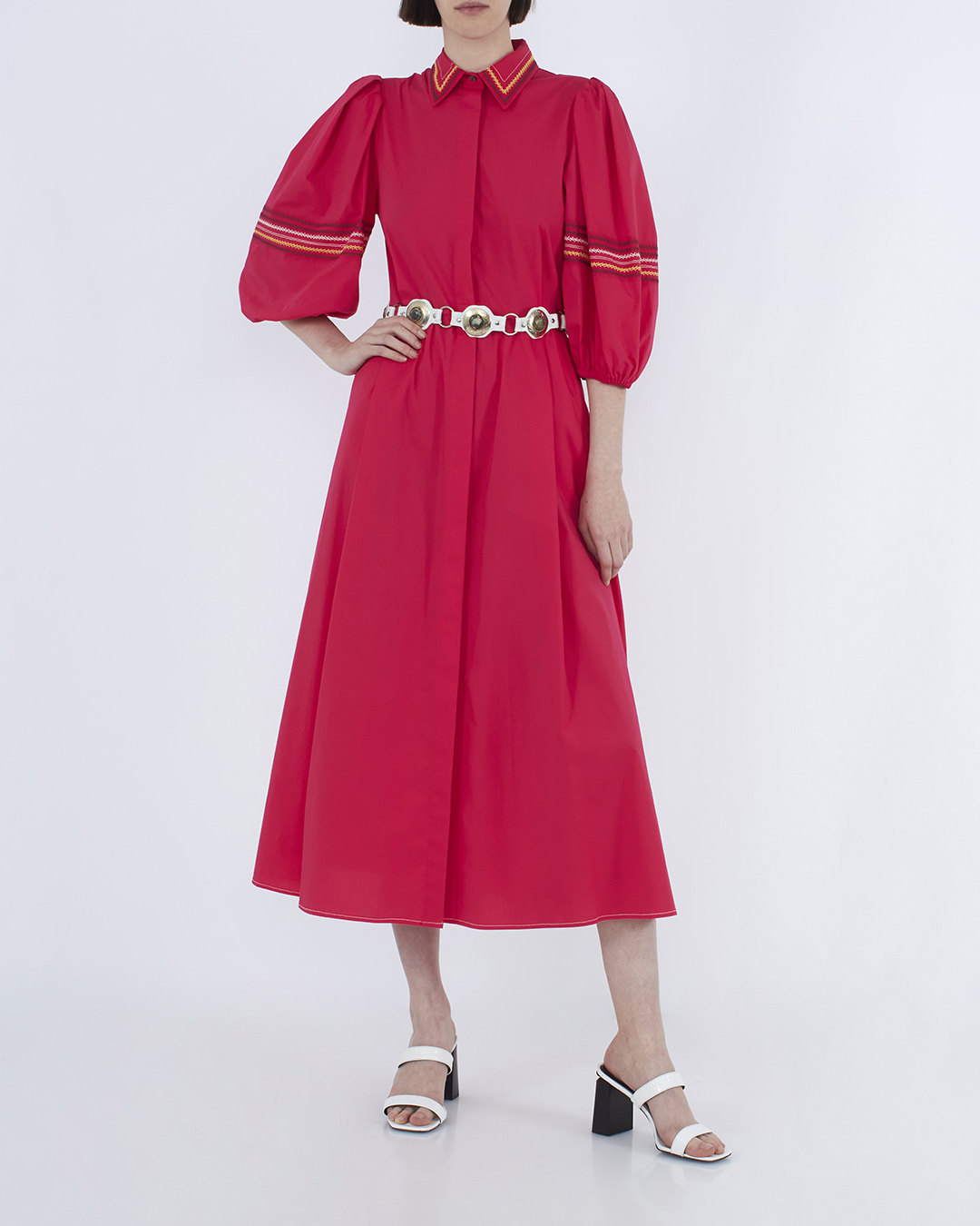 Платье Sfizio сшили из гладкого хлопка и дополнили вышивкой. Модель приталенного силуэта с застежкой на пуговицы и планку. Объемный рукава-буф и отложной воротник.