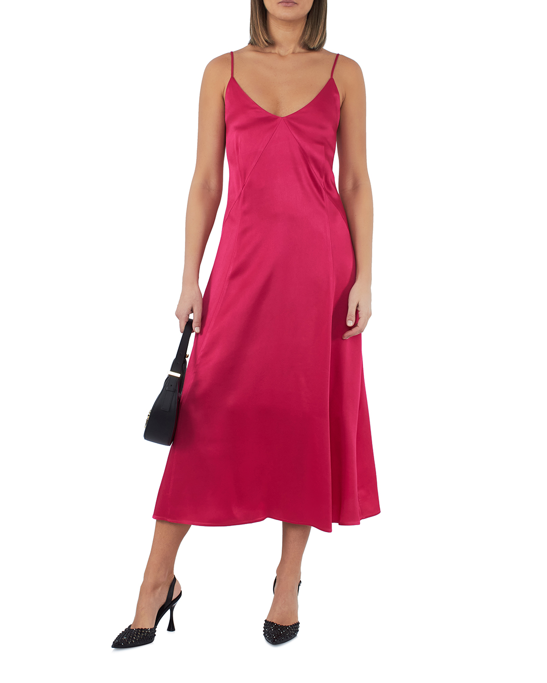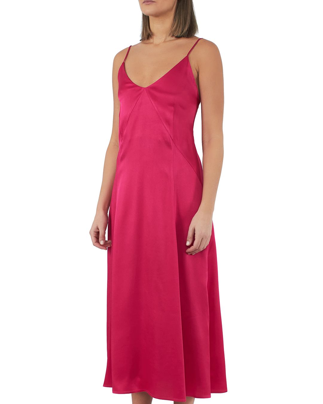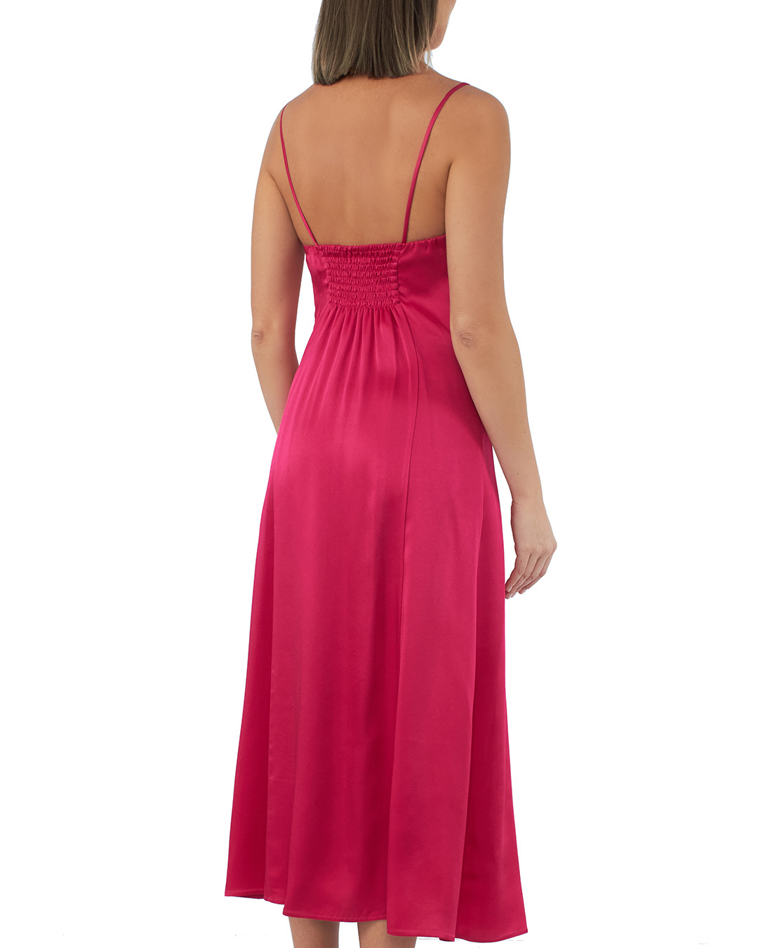 Платье-комбинация длины миди из атласного материала. Изделие с тонкими бретелями и эластичной вставкой на спине.