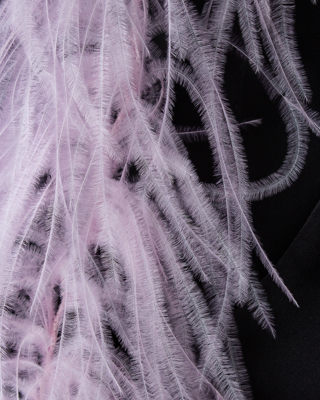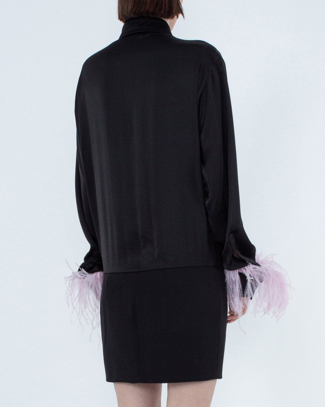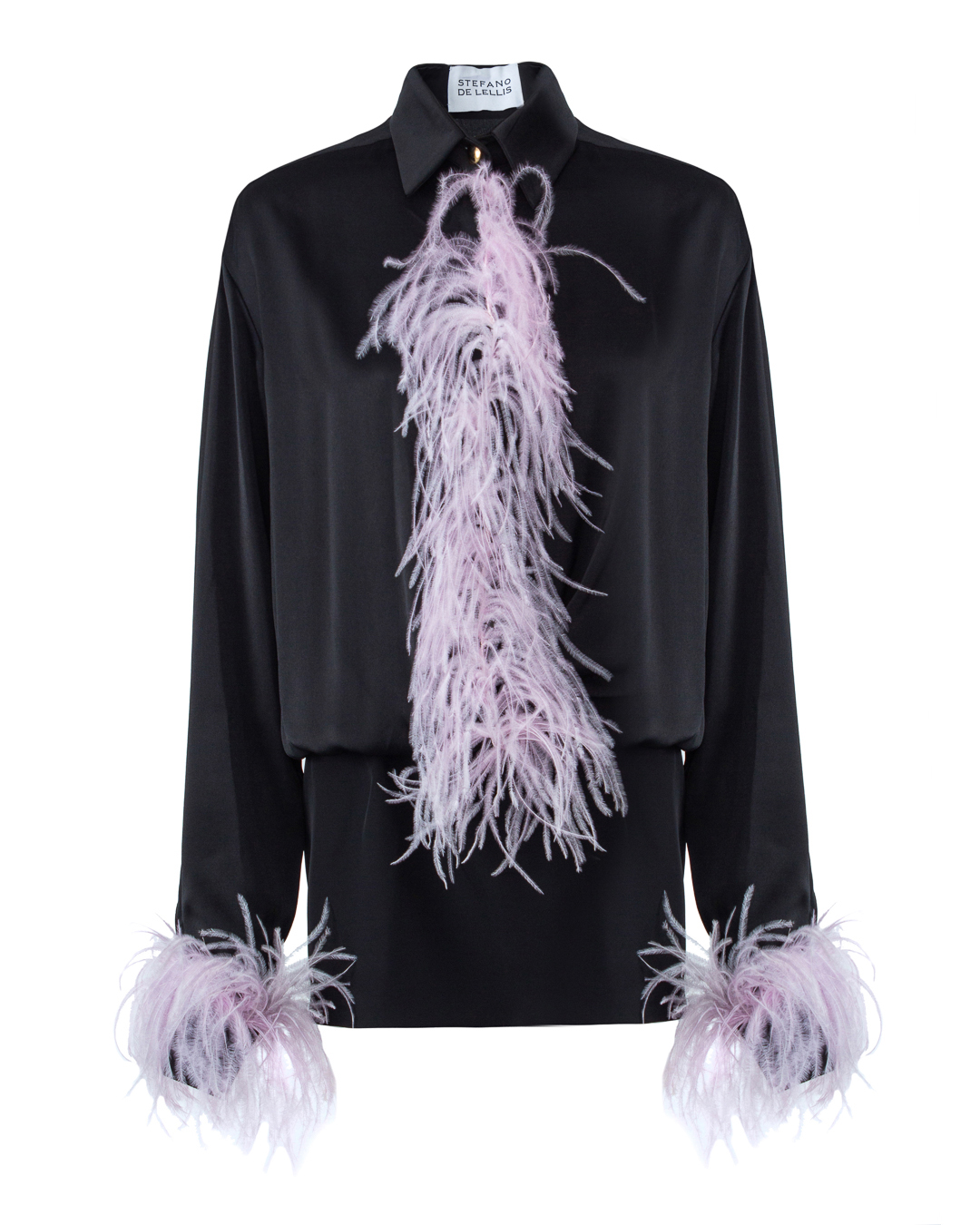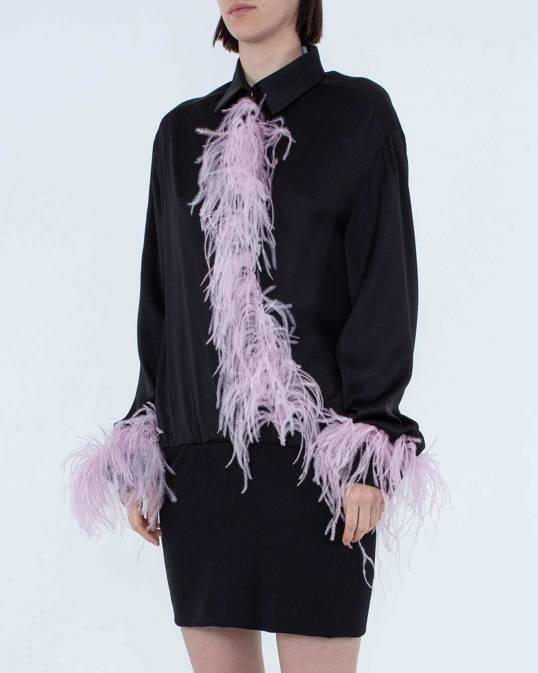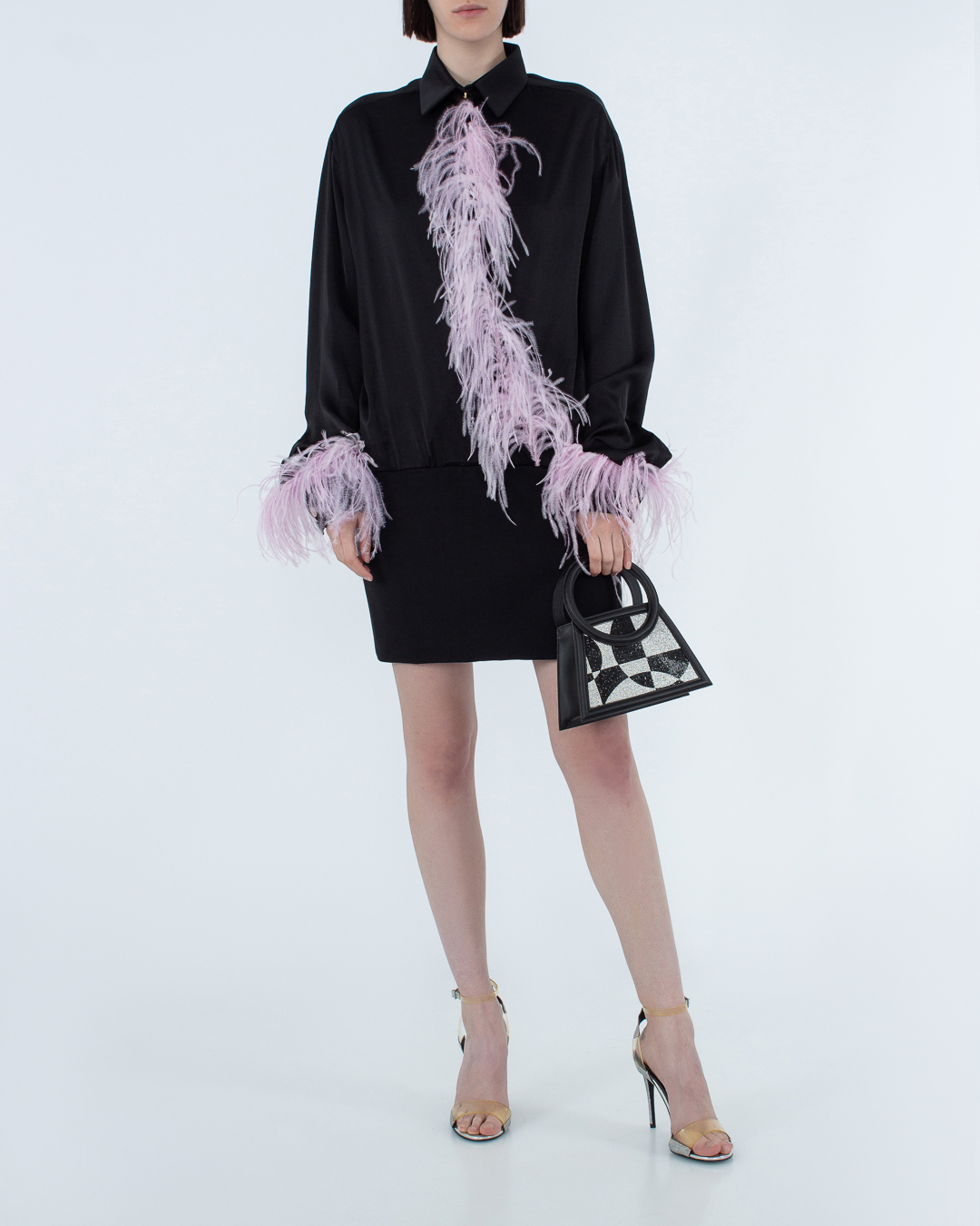 Платье Stefano De Lellis сшили из тонкого крепа черного цвета с отделкой перьями. Изделие скроено в виде блузы свободного силуэта с застежкой на пуговицы и облегающей мини юбки.