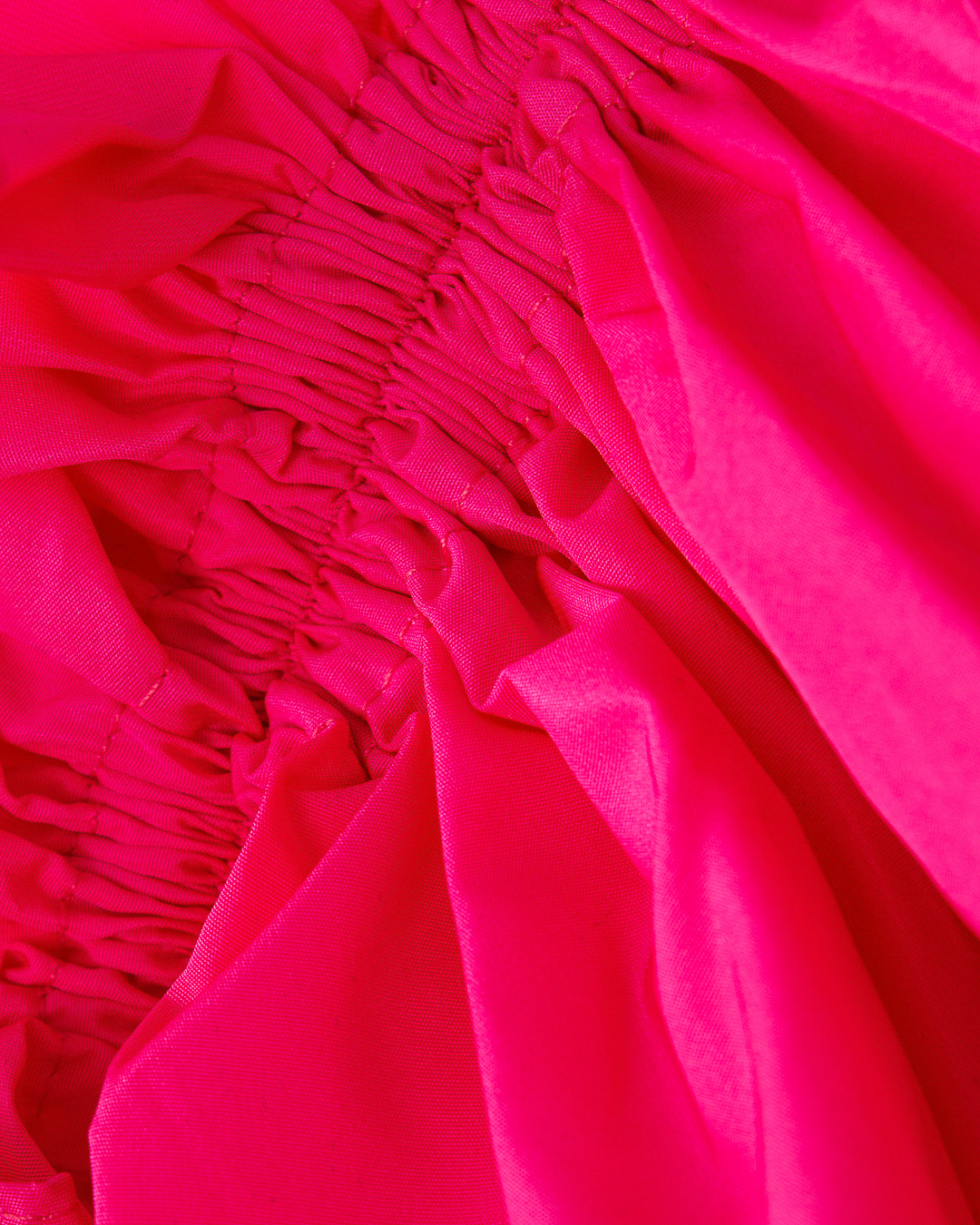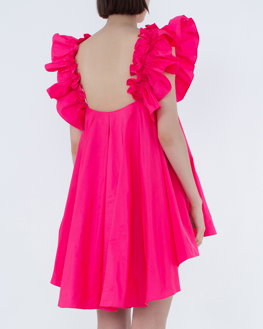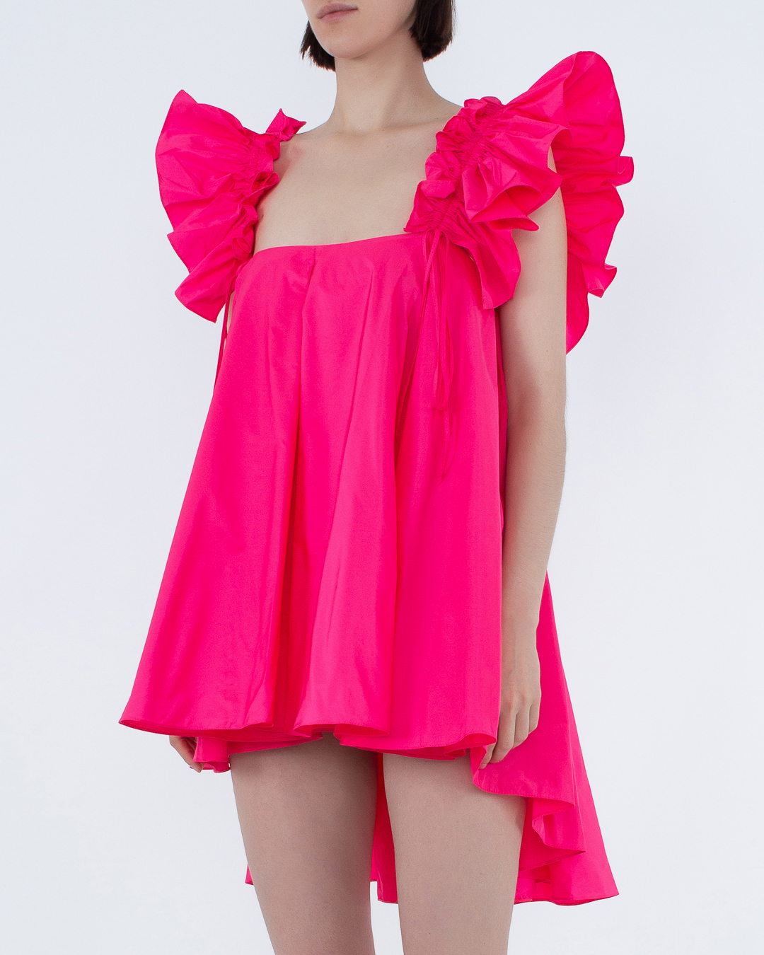 Платье мини Stefano De Lellis сшили яркого тонкого материала оттенка фуксии. Модель объемного силуэта со складками и отделкой рюшами на рукавах.