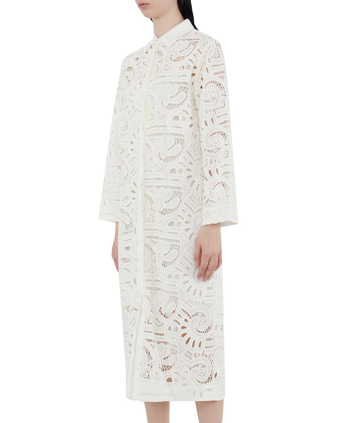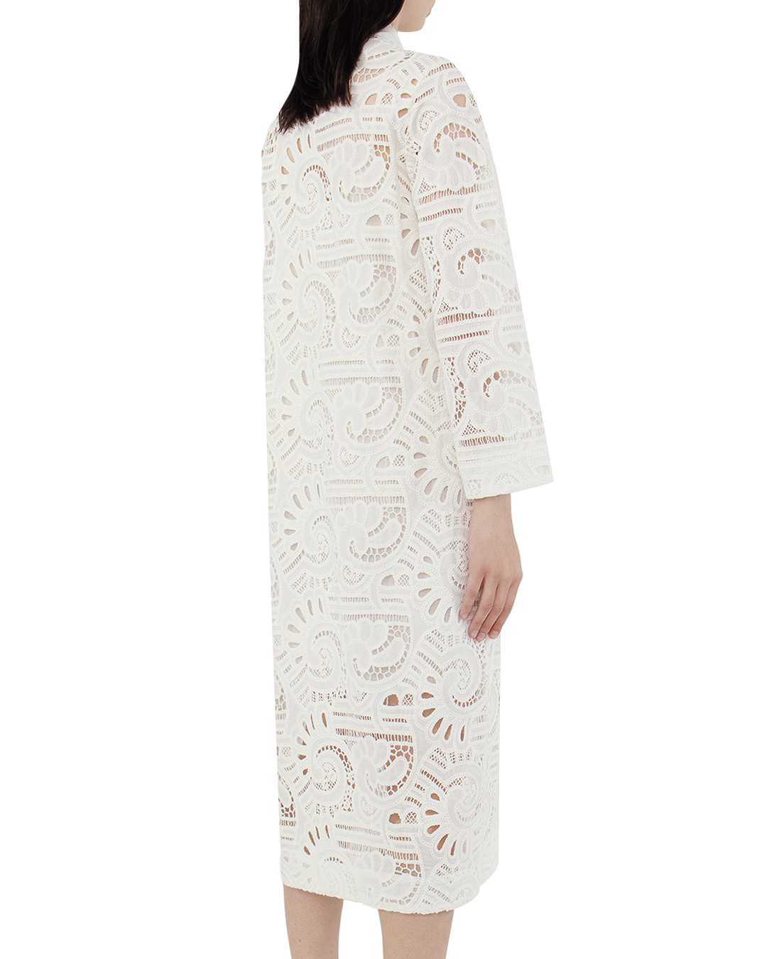 Это платье воплощает в себе изысканность и романтичную нежность. Белый цвет в сочетании с замысловатым кружевным узором создает атмосферу легкости и воздушности, идеально подчеркивая вашу индивидуальность. Платье выполнено в прямом силуэте, что обеспечивает комфорт и свободу движений, делая его универсальным для различных случаев. Длинные рукава с аккуратной отделкой добавляют образу элегантности и утонченности. Отложной воротник придаёт платью структурированность и классический шарм, создавая баланс между элегантностью и модной современностью. Застежка скрыта, что сохраняет чистоту линий и акцентирует внимание на сложности кружевного дизайна. Кружевная ткань платья выполнена с особым вниманием к деталям, где каждый элемент узора придаёт образу дополнительную текстурность и глубину. Это платье станет идеальным выбором для летних мероприятий или романтических вечеров, подчеркивая вашу утонченность и вкус к деталям.