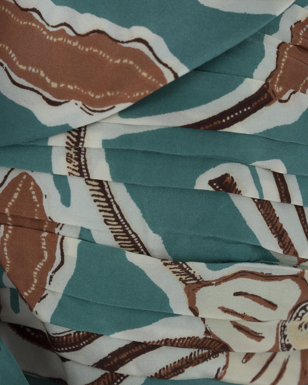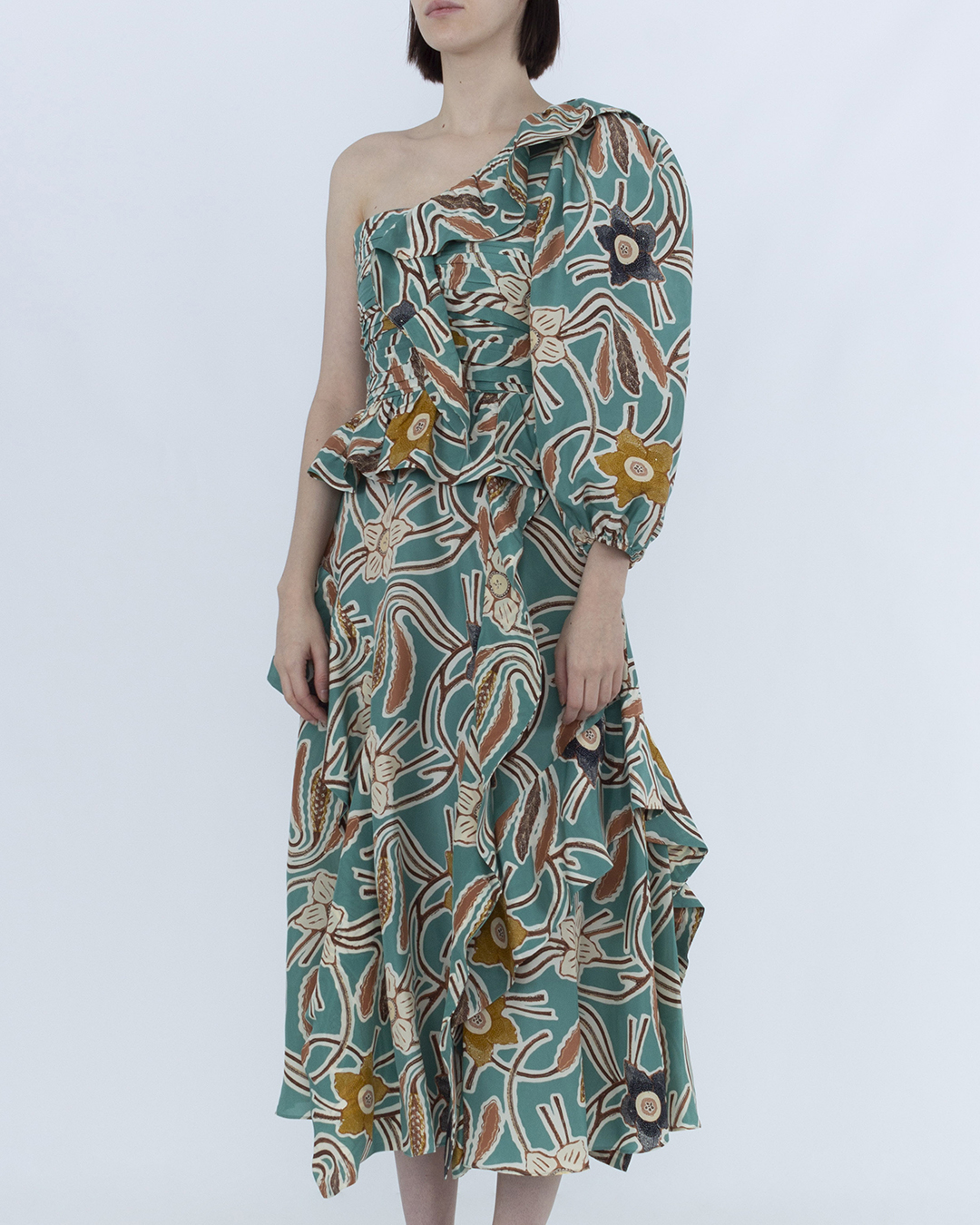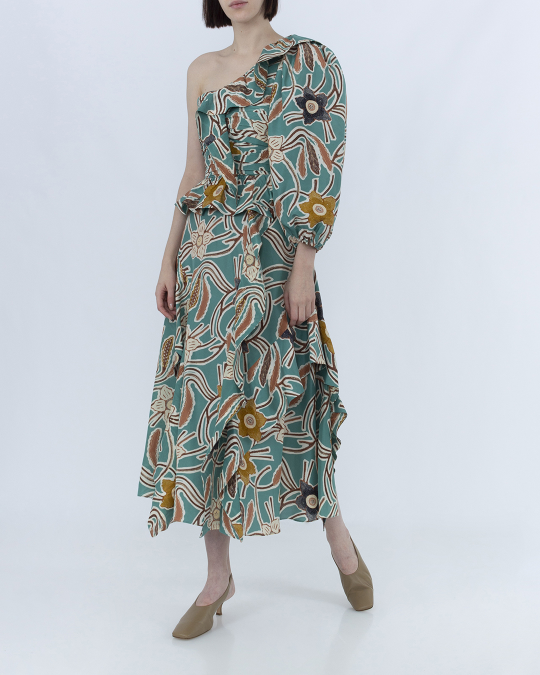 Платье Ulla Johnson выполнено из шелка с арт принтом. Приталенное изделие длины миди с открытым плечом и одним пышным рукавом. Изделие дополнено оборками и воланами.
