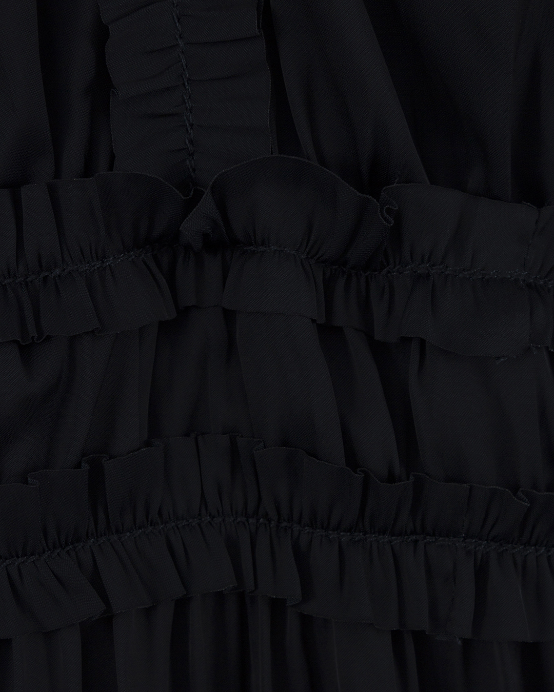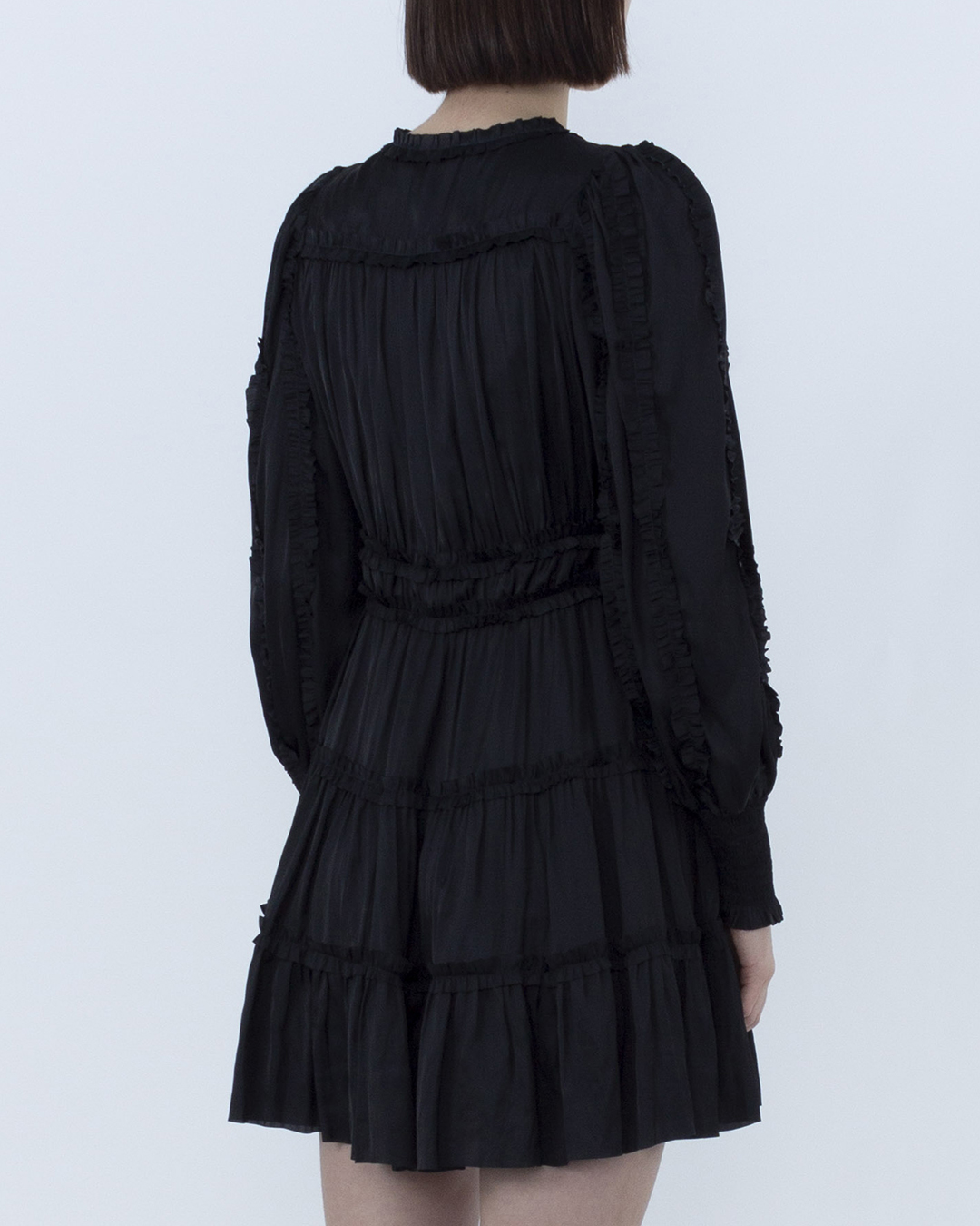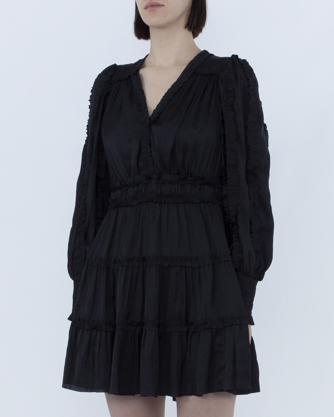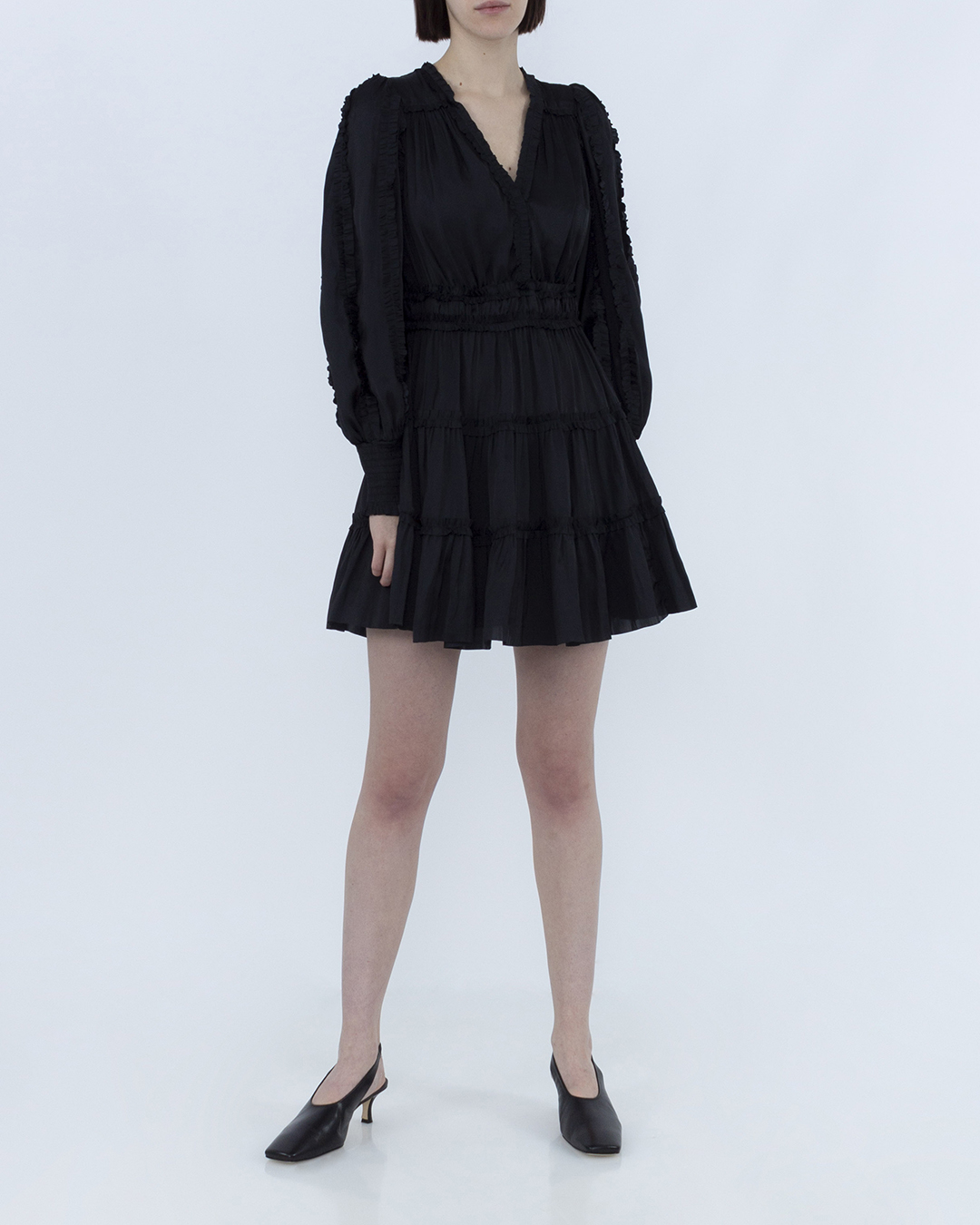Платье Ulla Johnson выполнено из тонкого материала черного цвета. Приталенное изделие длины мини дополнено длинными рукавами и V-образным вырезом.