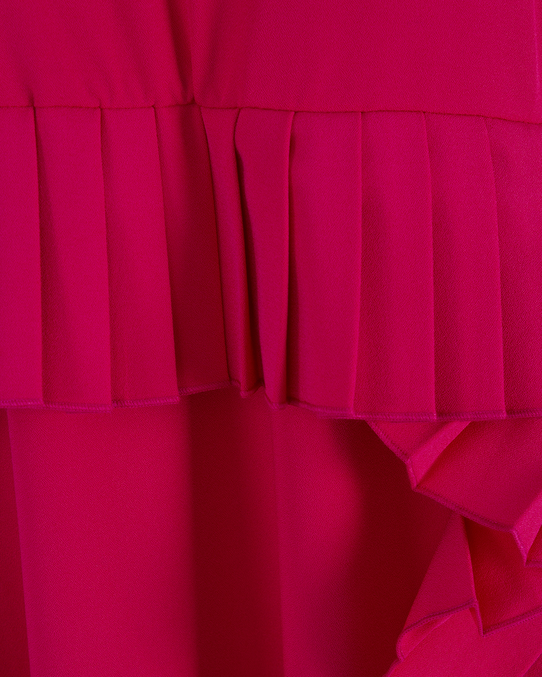 Платье Veronica Iorio из крепа яркого оттенка фуксии. Модель длины макси с отделкой с мелкими складками из основного материала. Платье дополнено объемными рукавами с манжетами в складку и застежкой на спине.