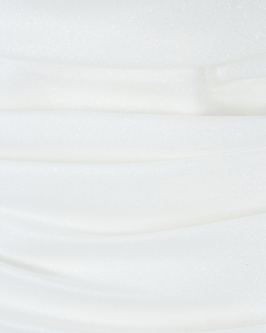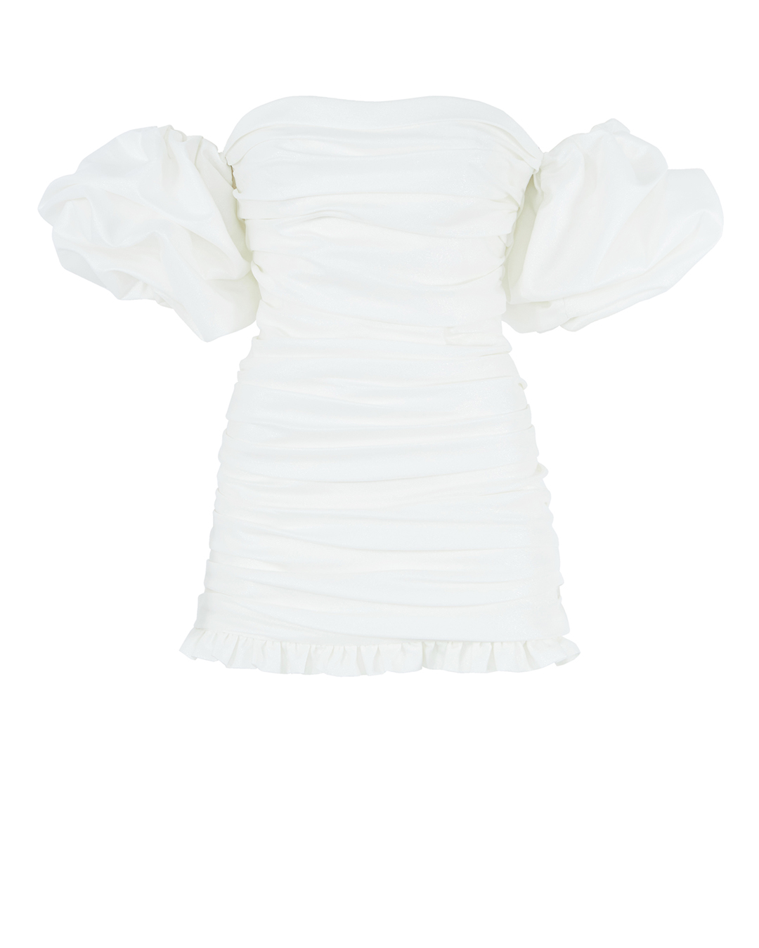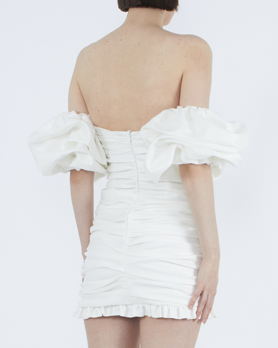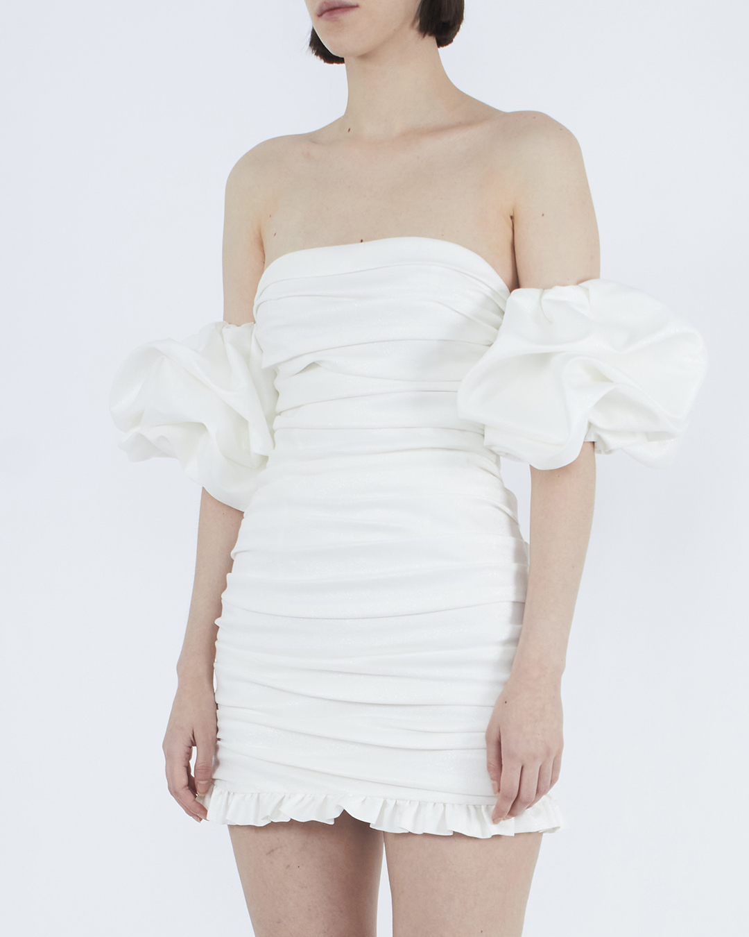 Платье мини из легкого материала молочного оттенка с блеском. Модель облегающего силуэта со складками и отдельными объемными рукавами.