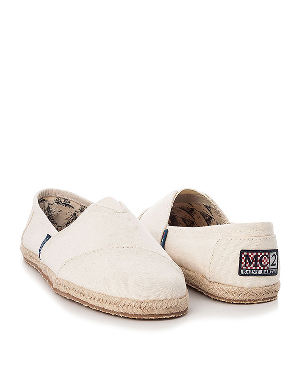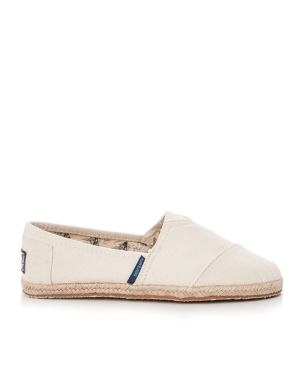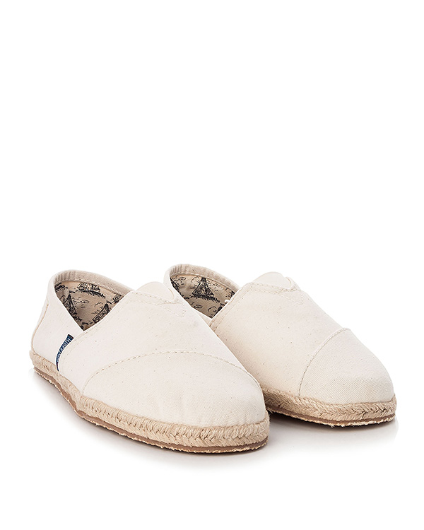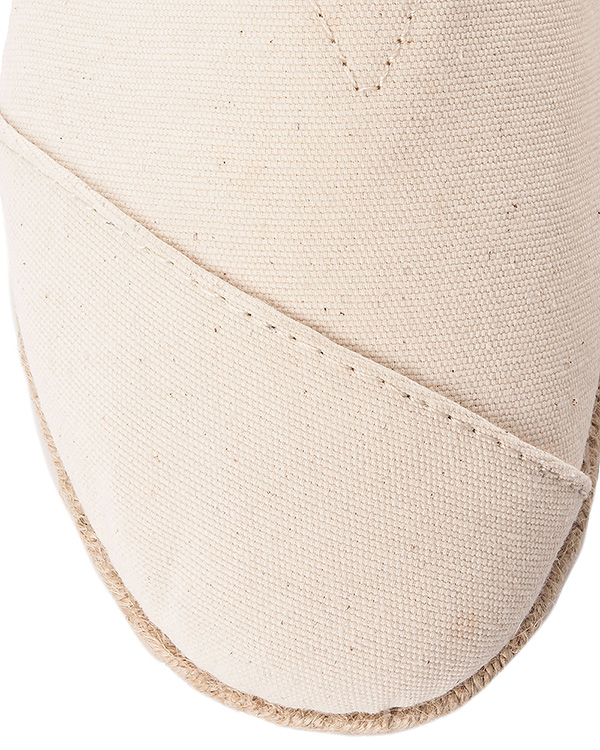 Эспадрильи выполнены из хлопка на плоской подошве с плетеной джутовой отделкой.
