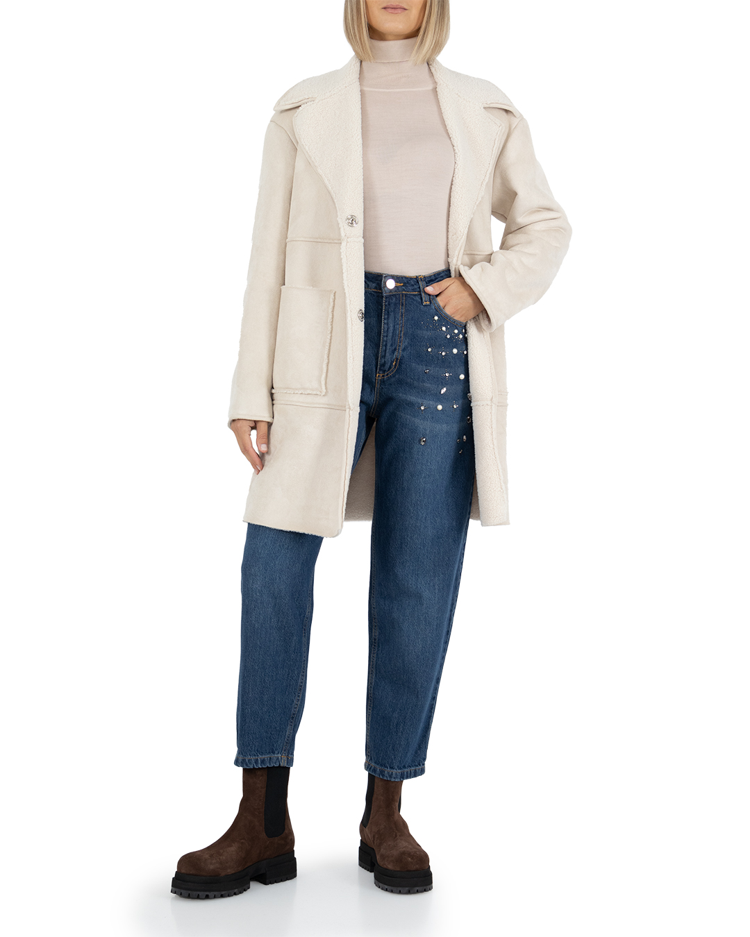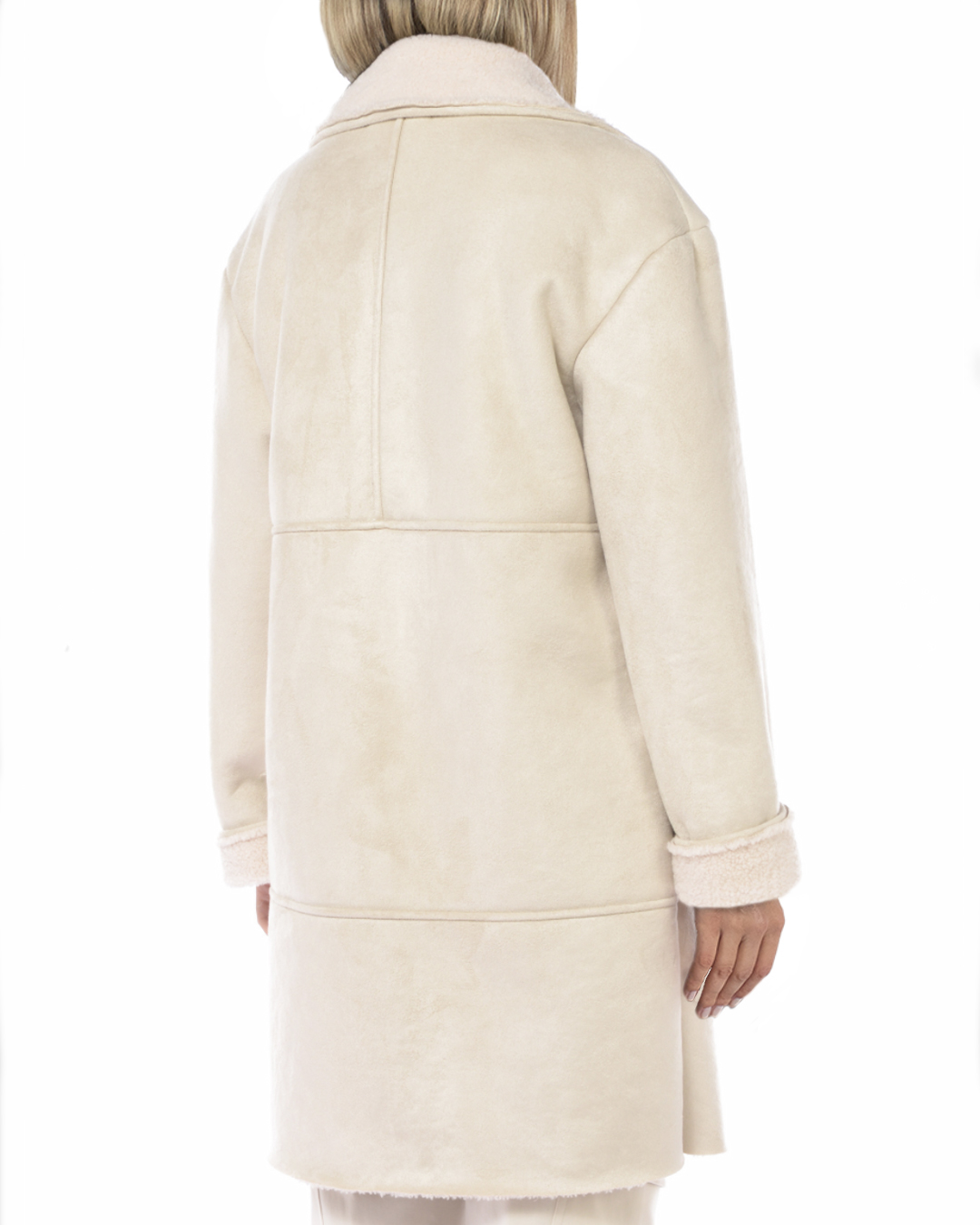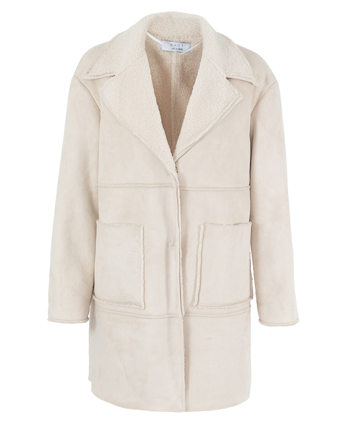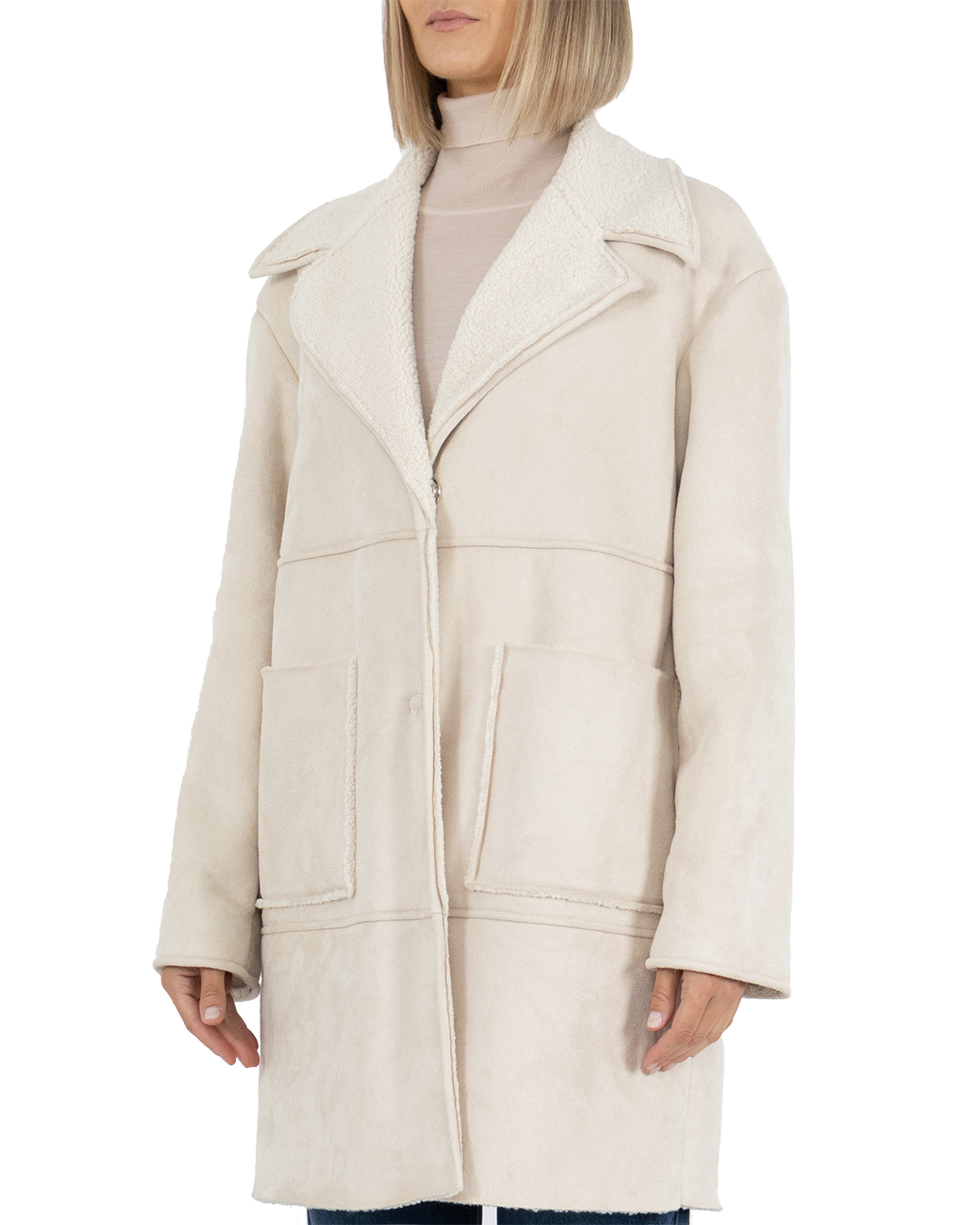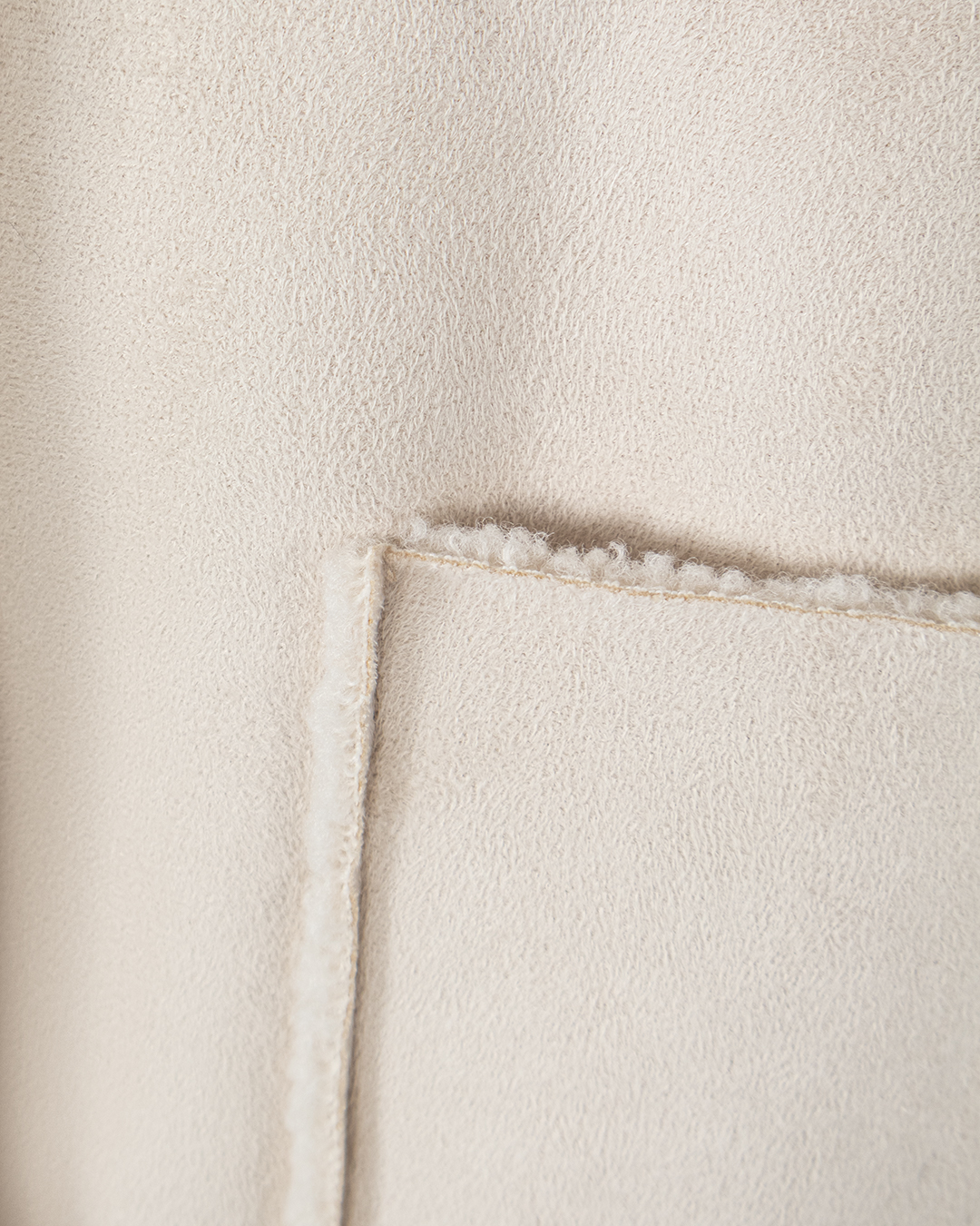 Для пошива светло-бежевой дубленки с широким воротником, прямоугольными лацканами и накладными карманами создатели выбрали мягкую эко-кожу. Лицевая сторона гладкая матовая, изнаночная с шелковистым коротким ворсом. Лаконичная модель застегивается потайными кнопками.