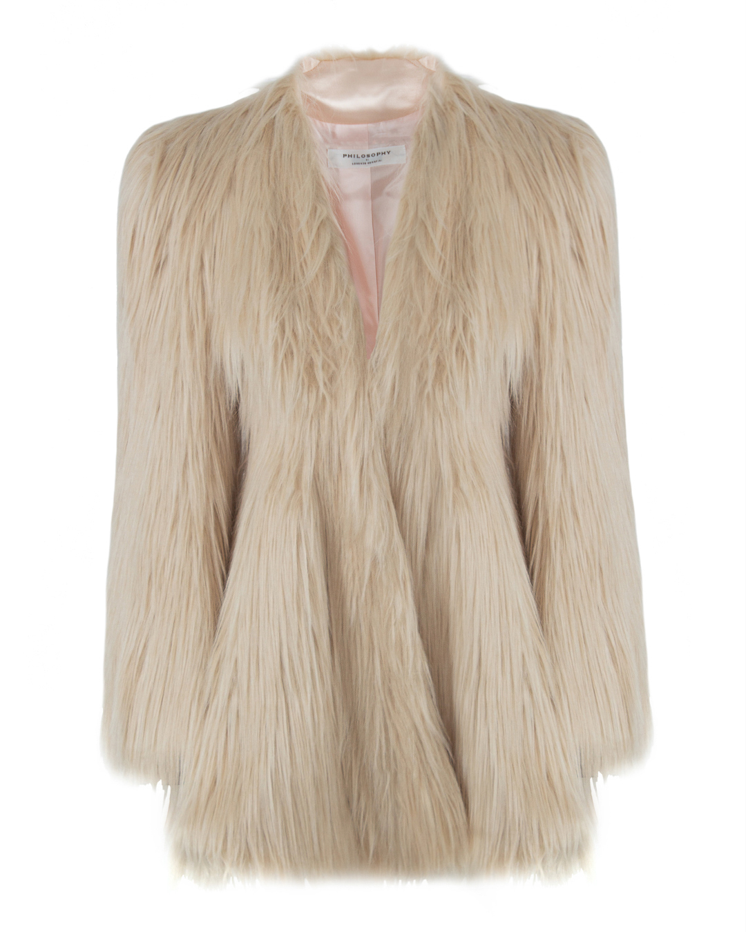 Шуба из декоративного меха бежевого оттенка. Модель с длинным ворсом.